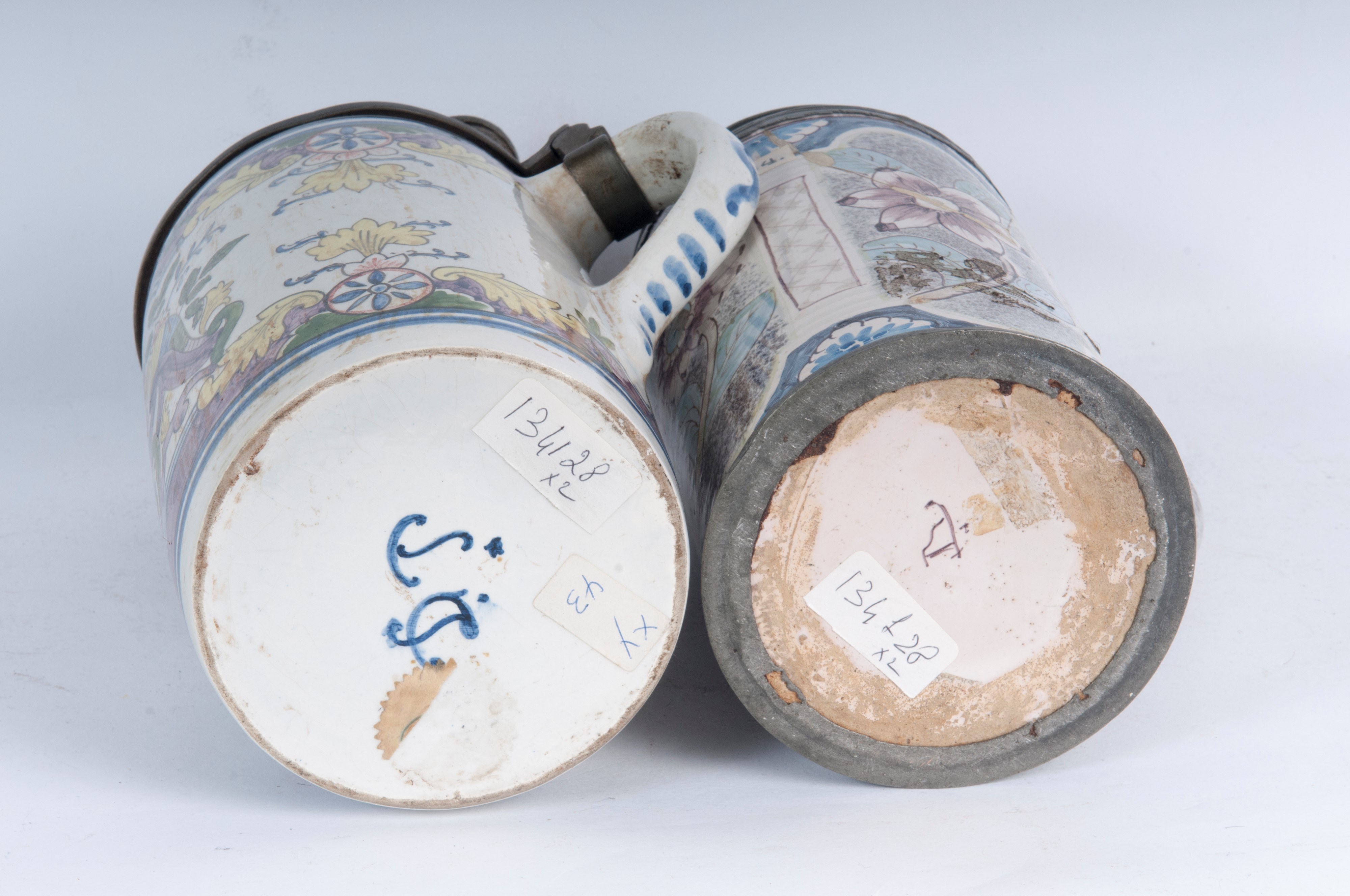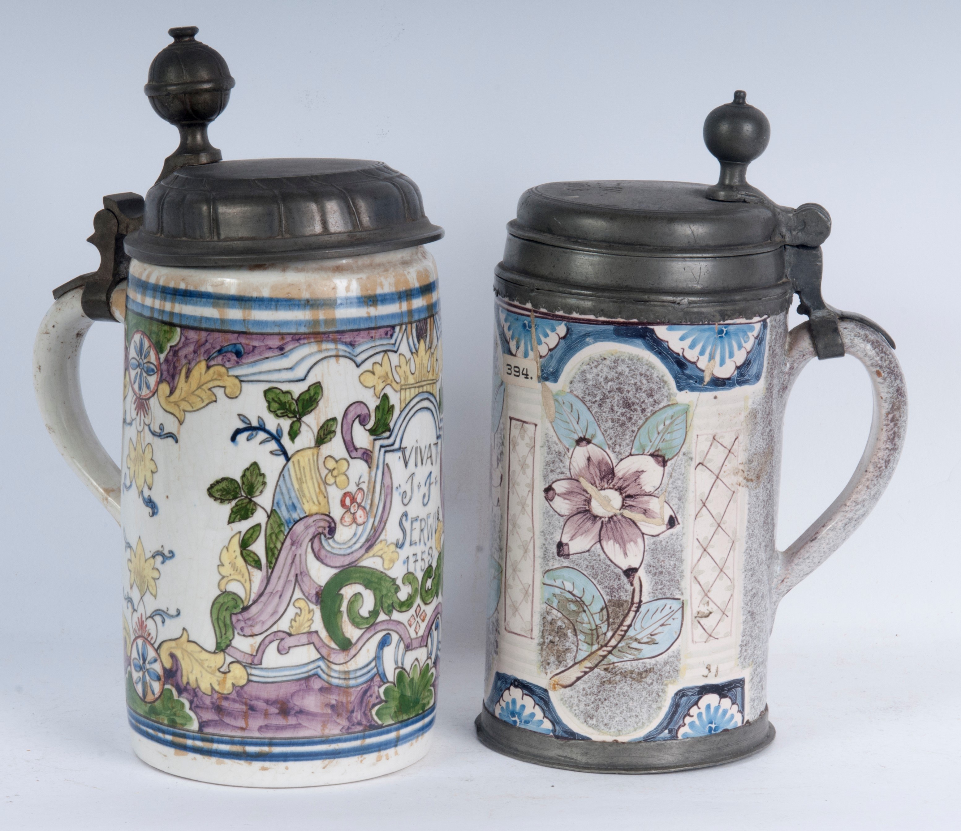 Polychrome ceramic with pewter lid. Floral decoration on a white background. German manufacture.