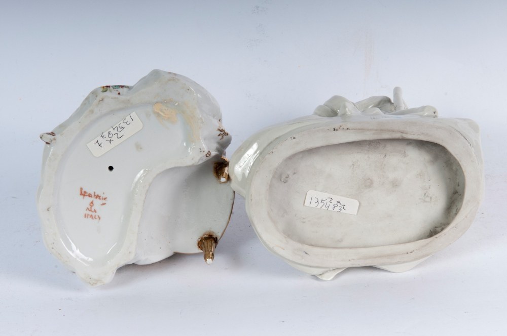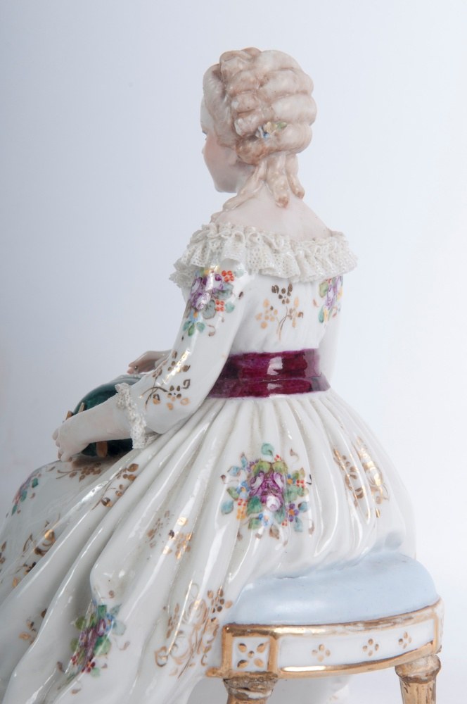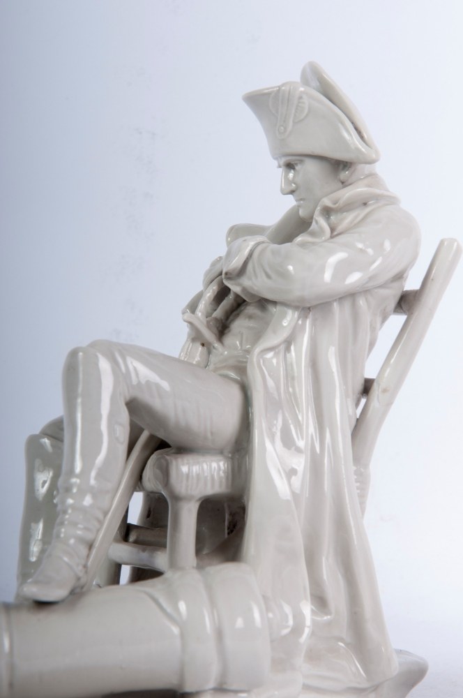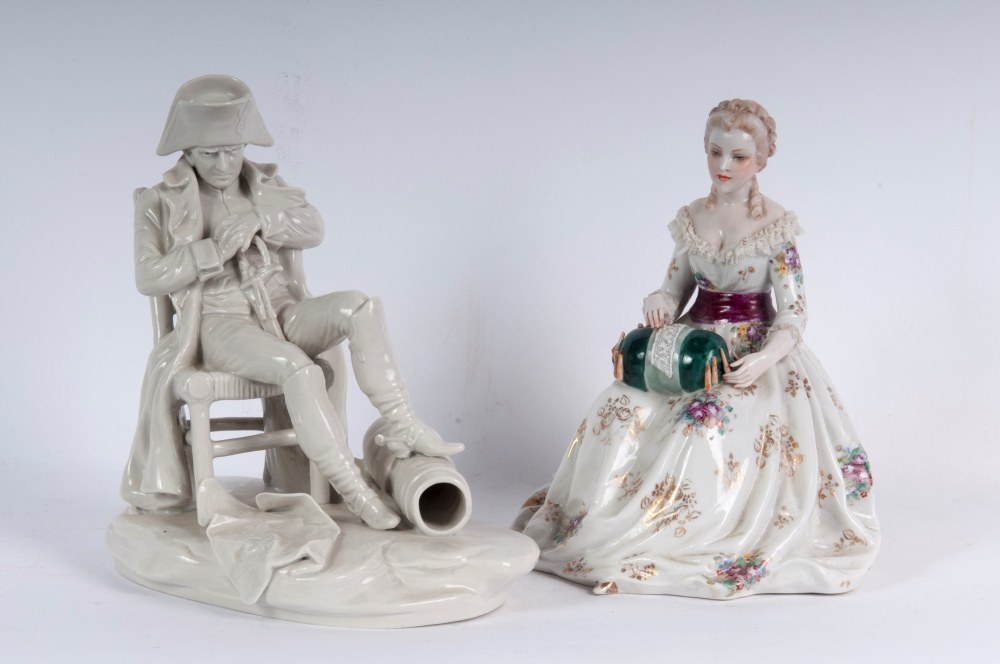 Seated lady embroidering, 18 x 13 x 14 cm; Seated Napoleon, 19 x 18 x 10 cm, cast. Manufactured by Ginori.