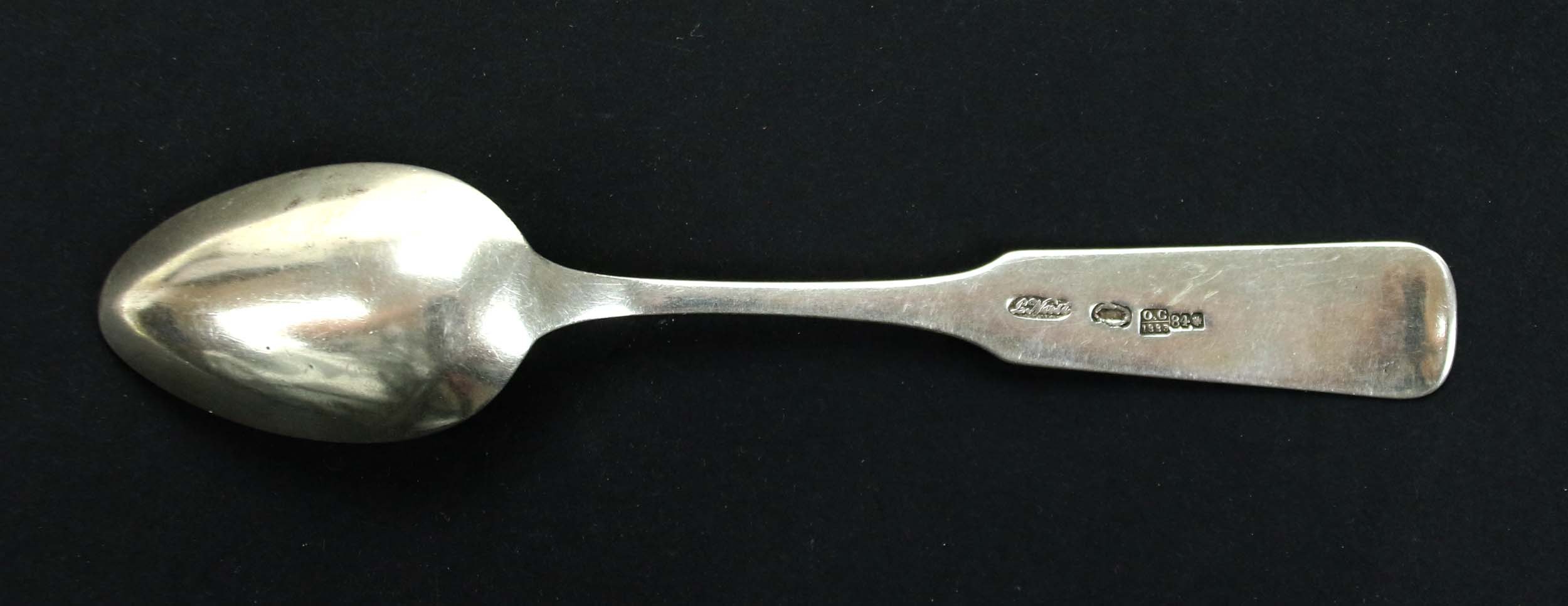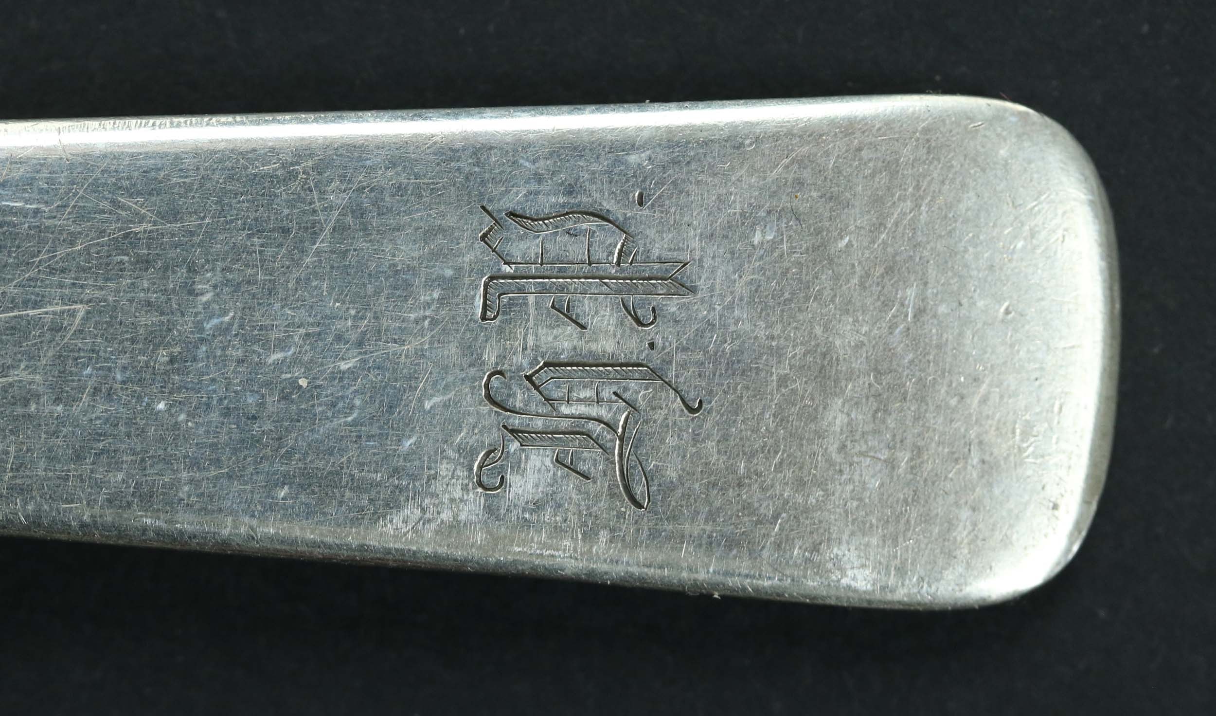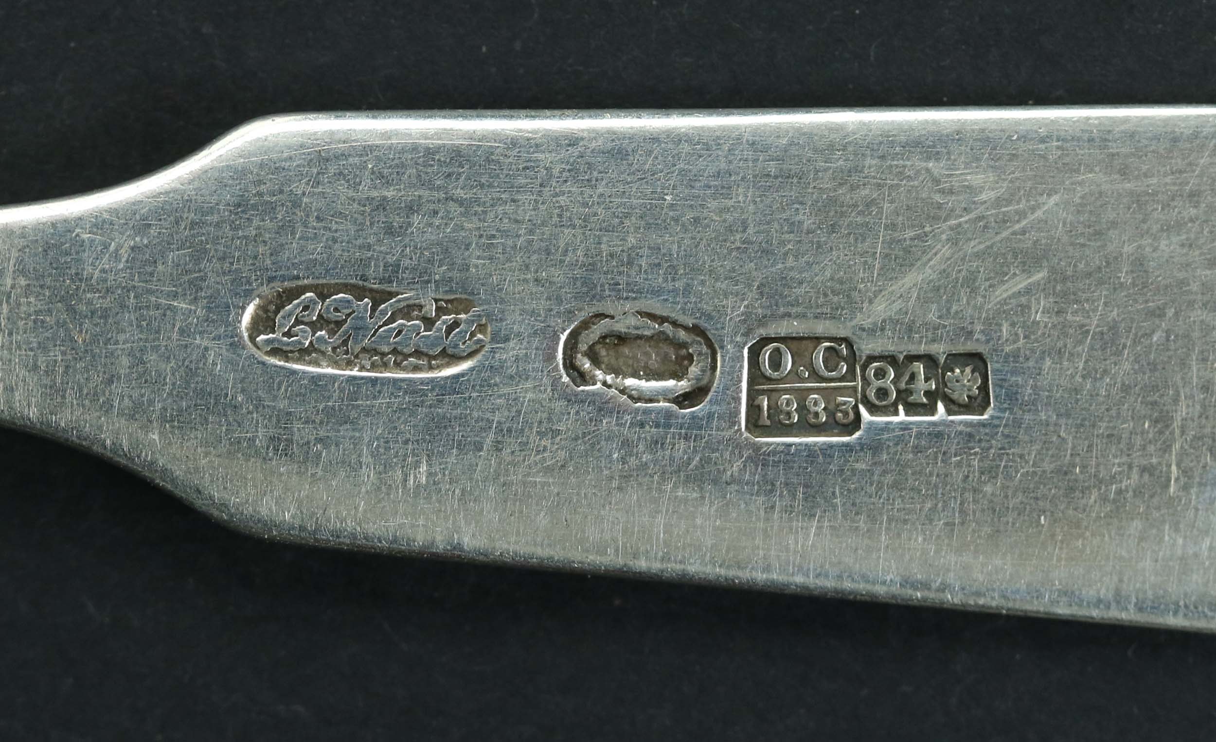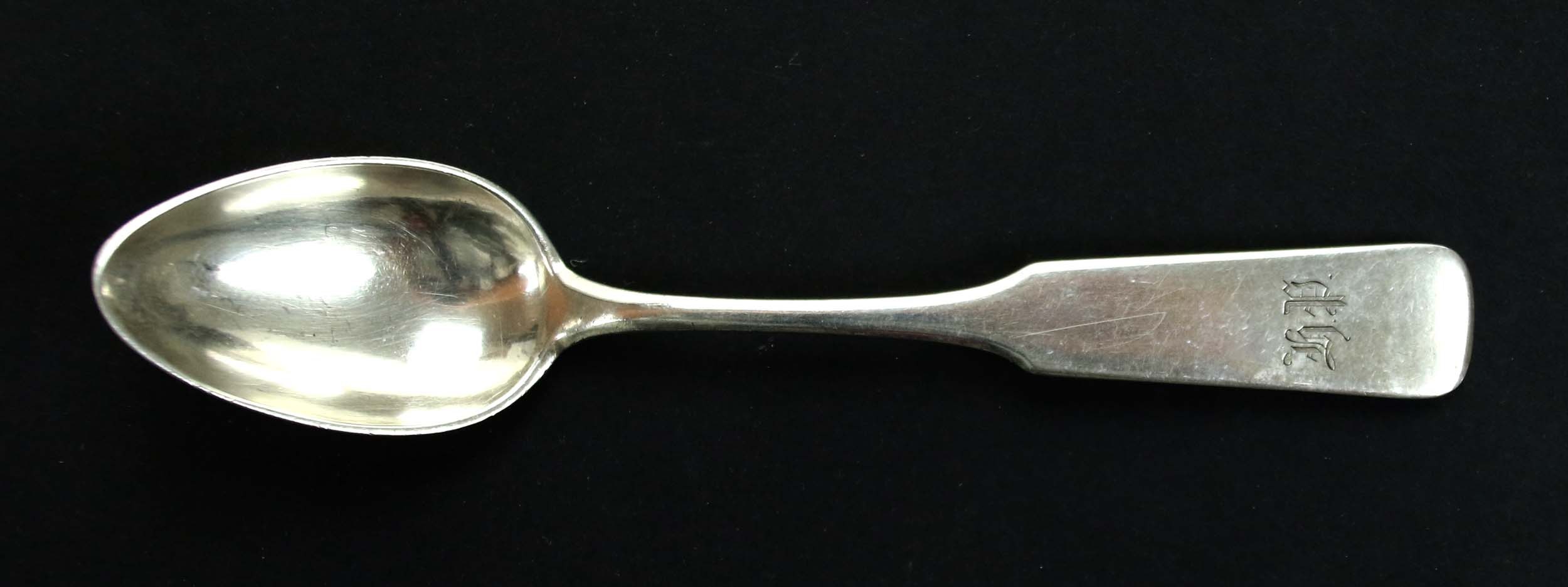Łyżka, Ludwik Walenty Nast, Warszawa 1883 r. Srebro, warszawska cecha srebra z 1883 r. oraz sygnatura wytwórcy. Srebro, waga 26 g. Długość 15,7 cm.
