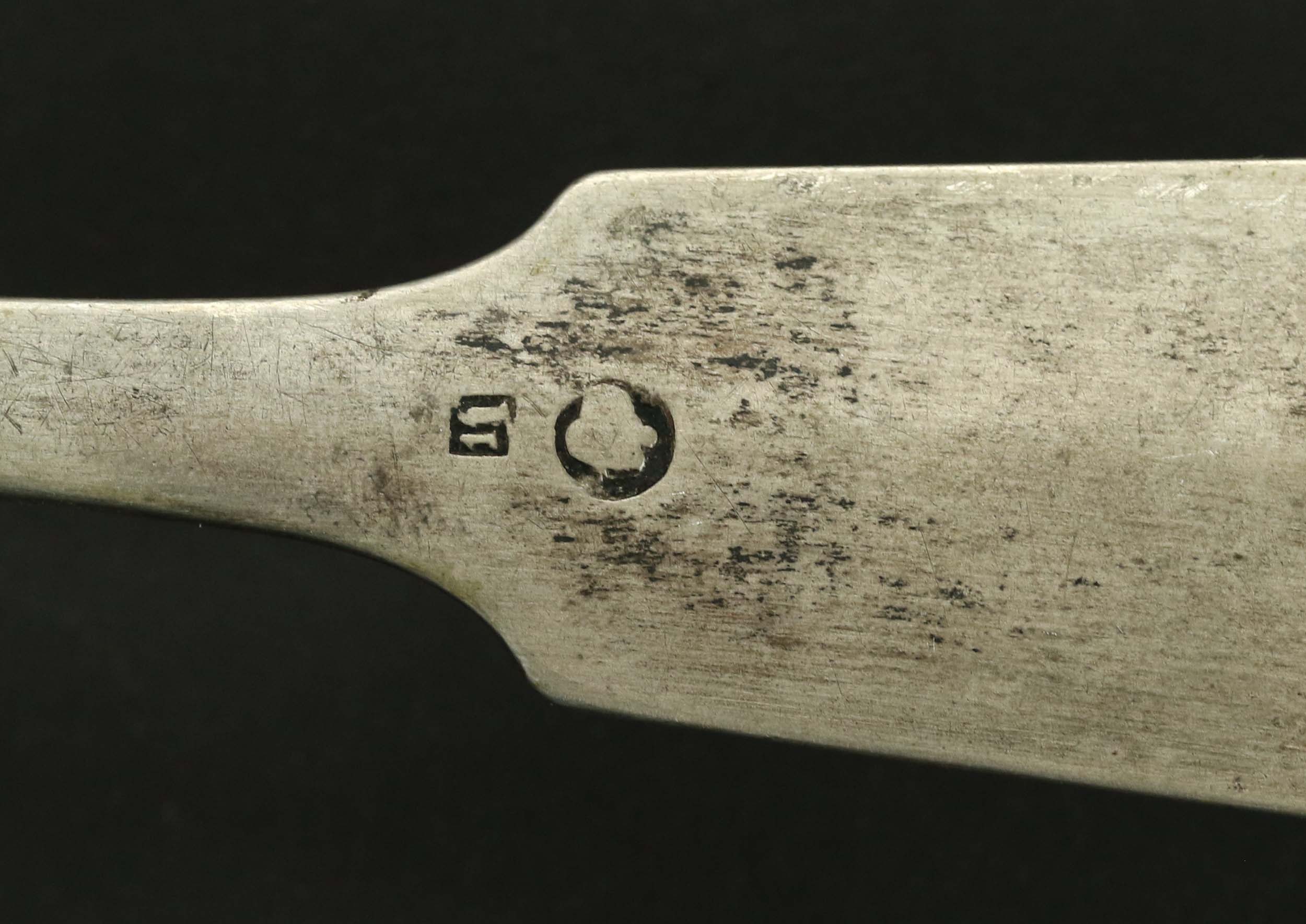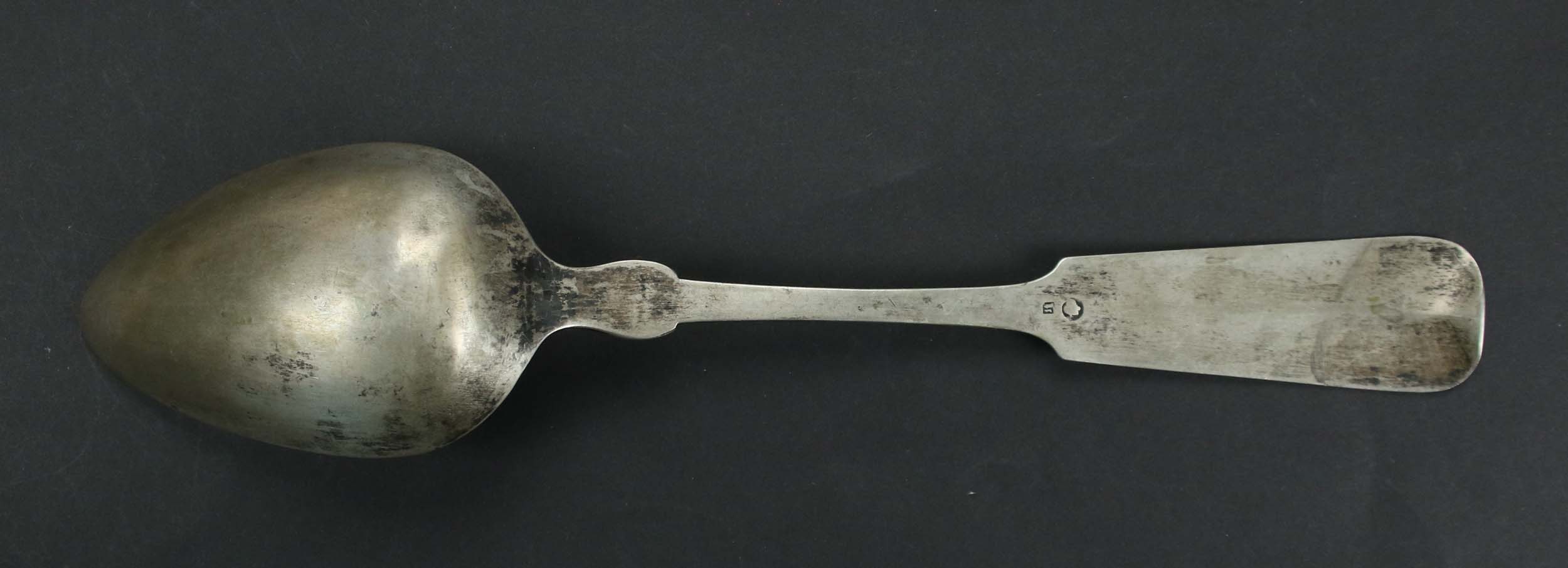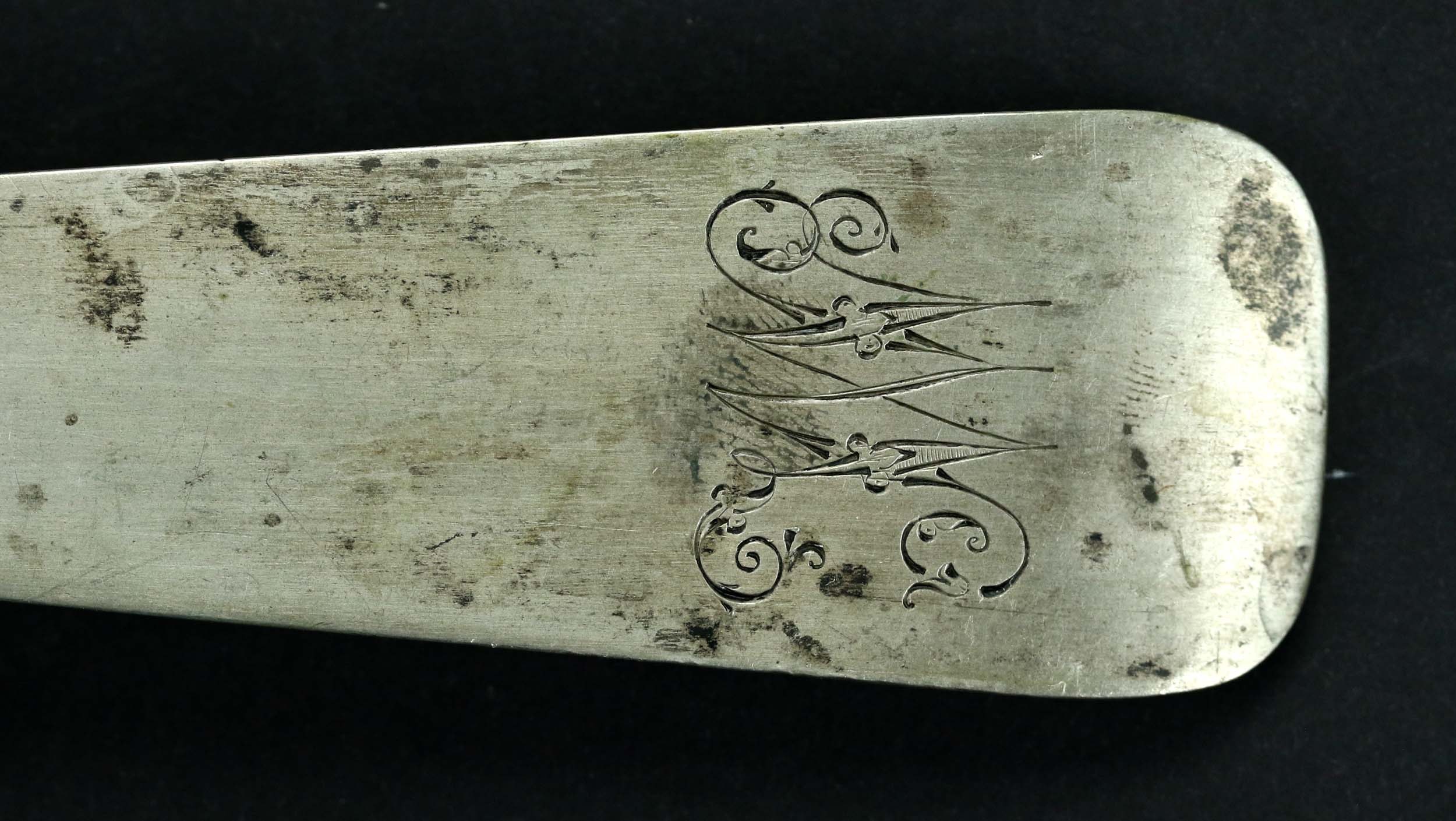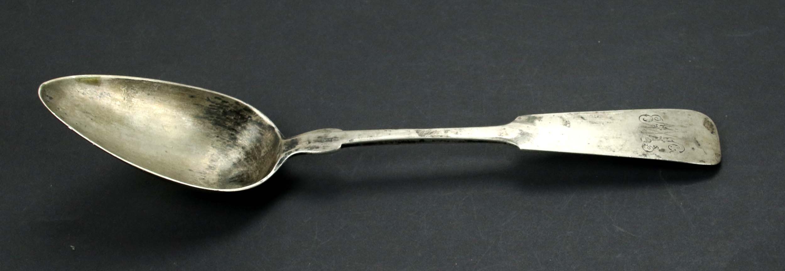 Łyżka półmiskowa XIX w. Długość 30,5 cm, srebro 11, waga 119 g.