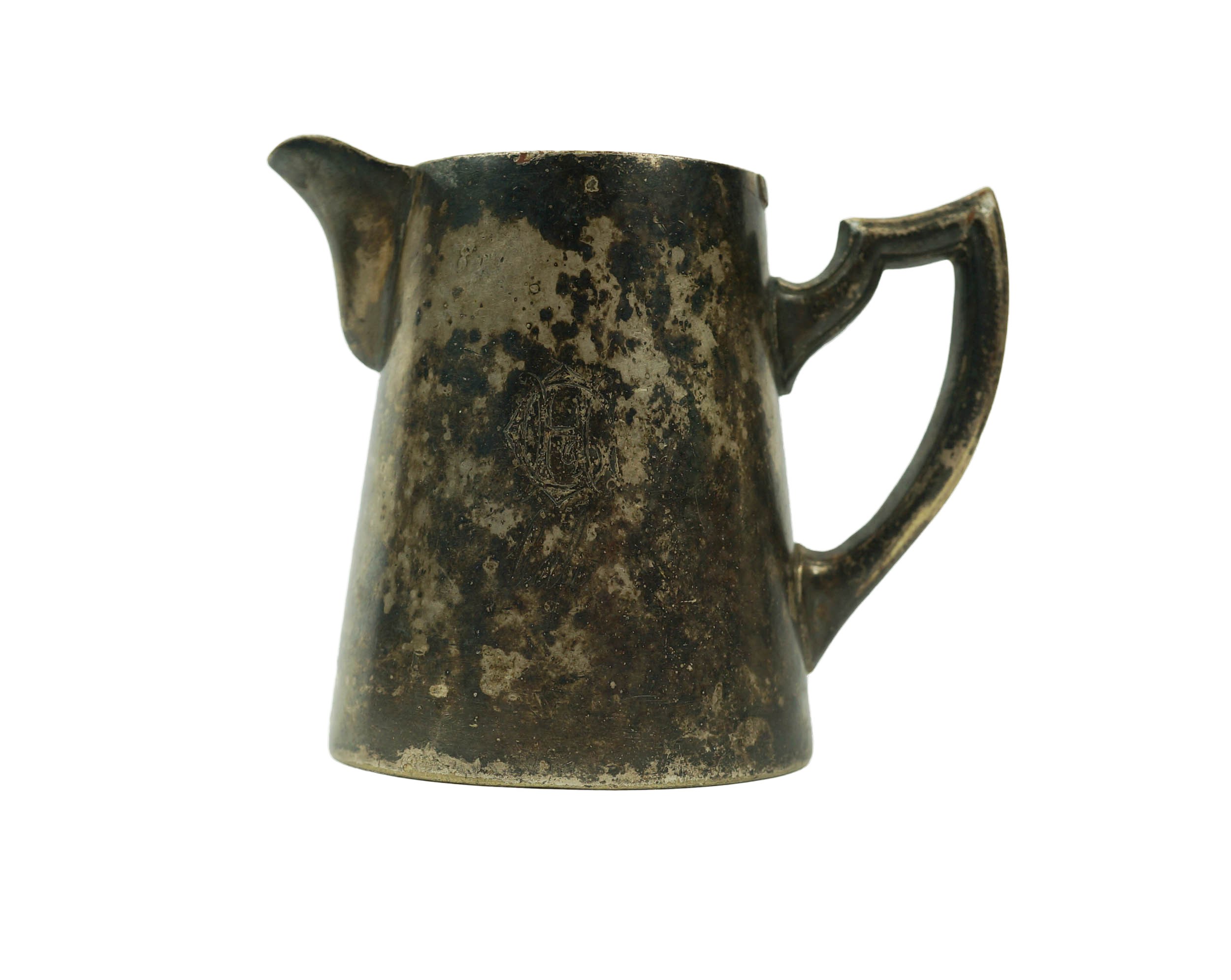 Mlecznik z Grand Hotelu wykonany w zakładach Marcina Jarry [1852-1938] w Krakowie, sygnowany na spodzie, na boku monogram "GH" [Grand Hotel] i napis "Cafe", średnica podstawy ok. 7cm, wysokość ok. 8cm, średnica górnej wylewki ok. 5cm, [B]