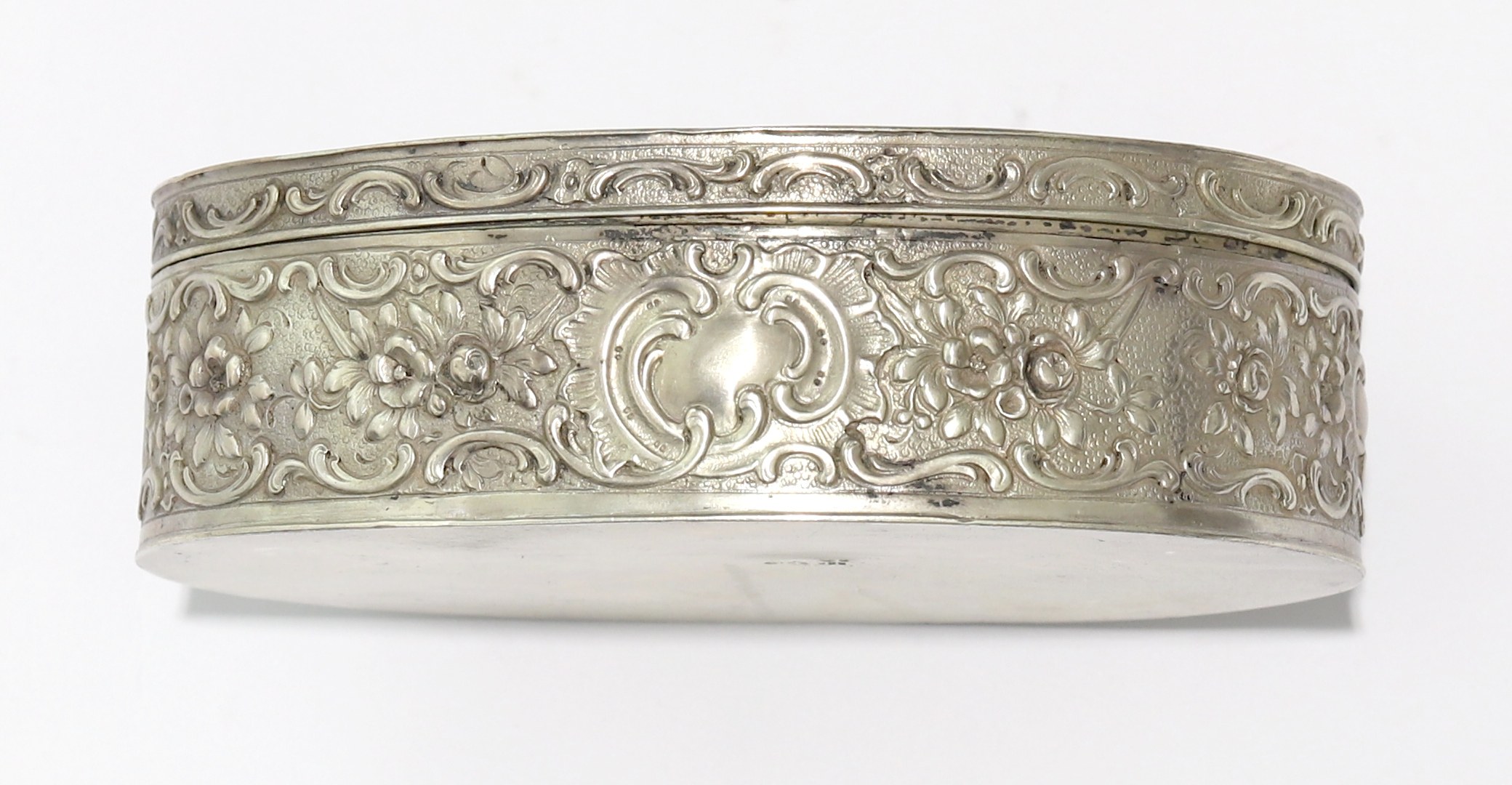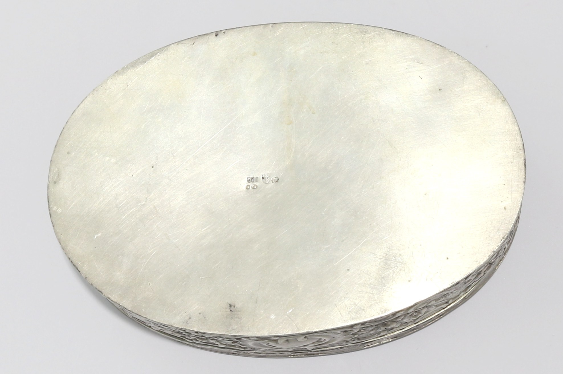 Srebro .800, wymiary 10x14cm, wysokość 4,2cm, waga 270 g.