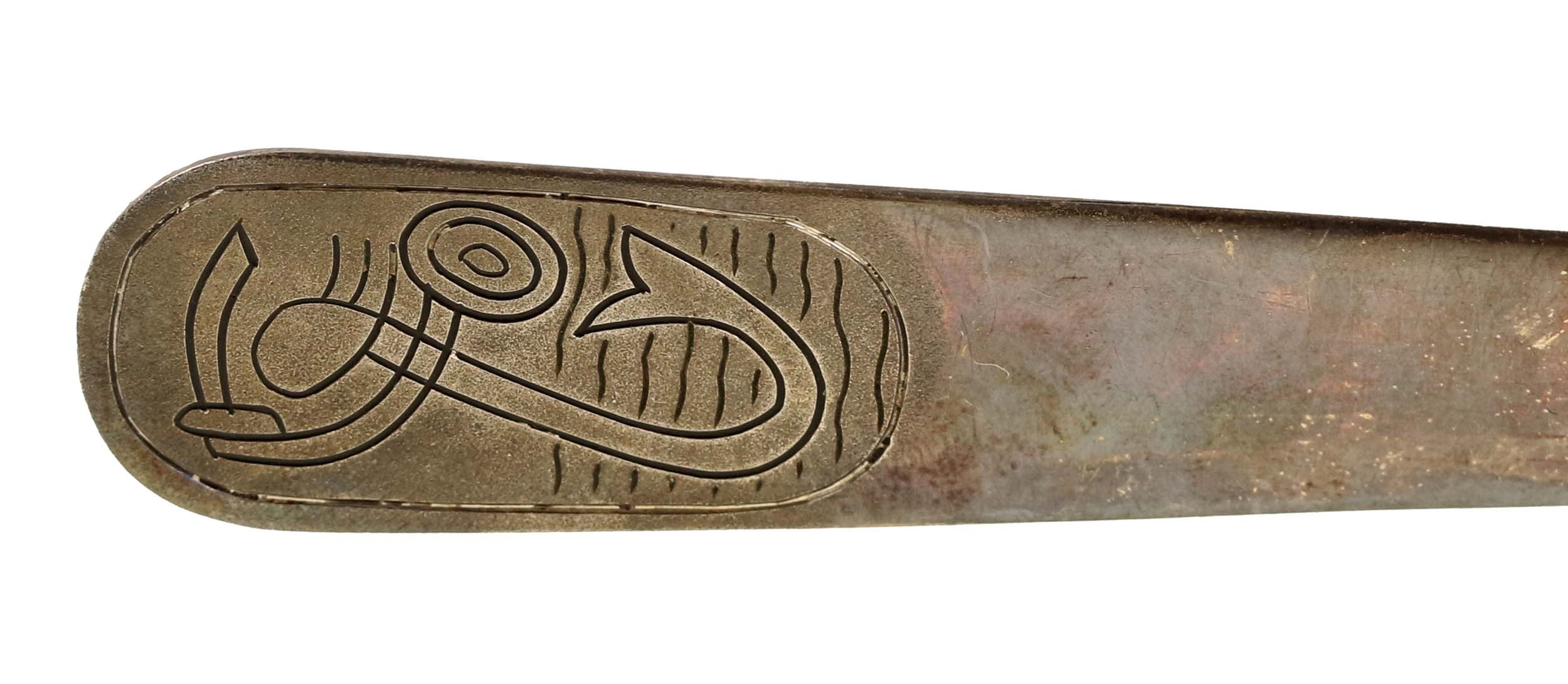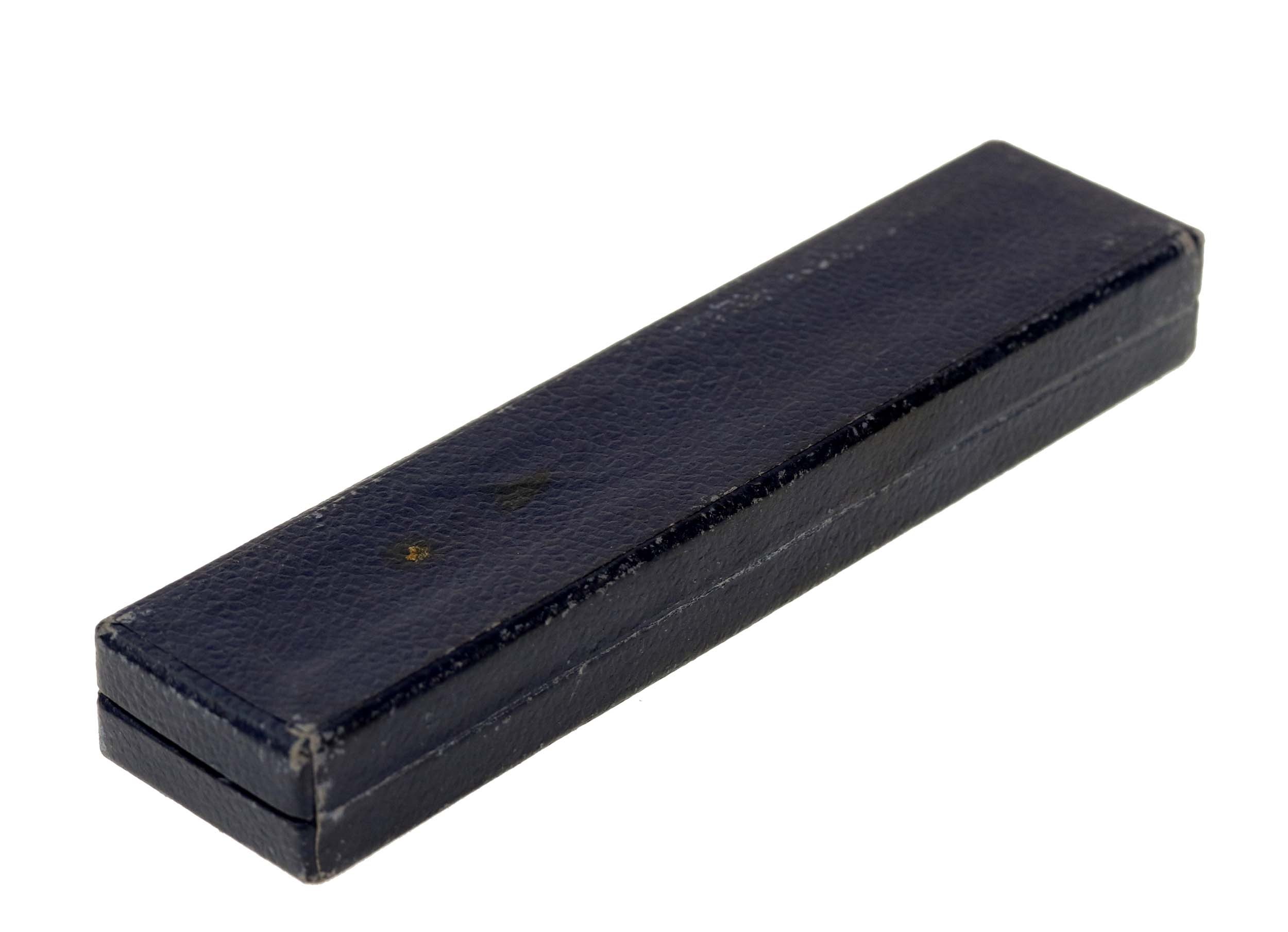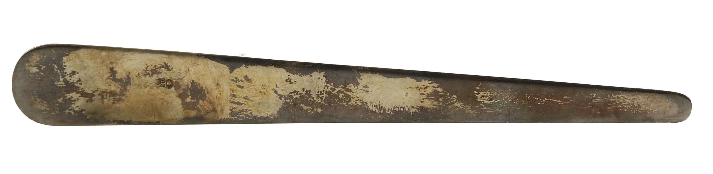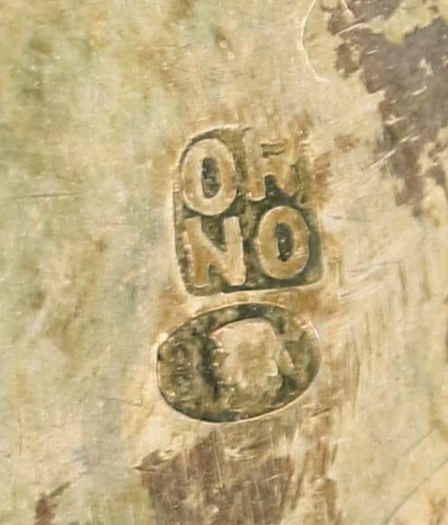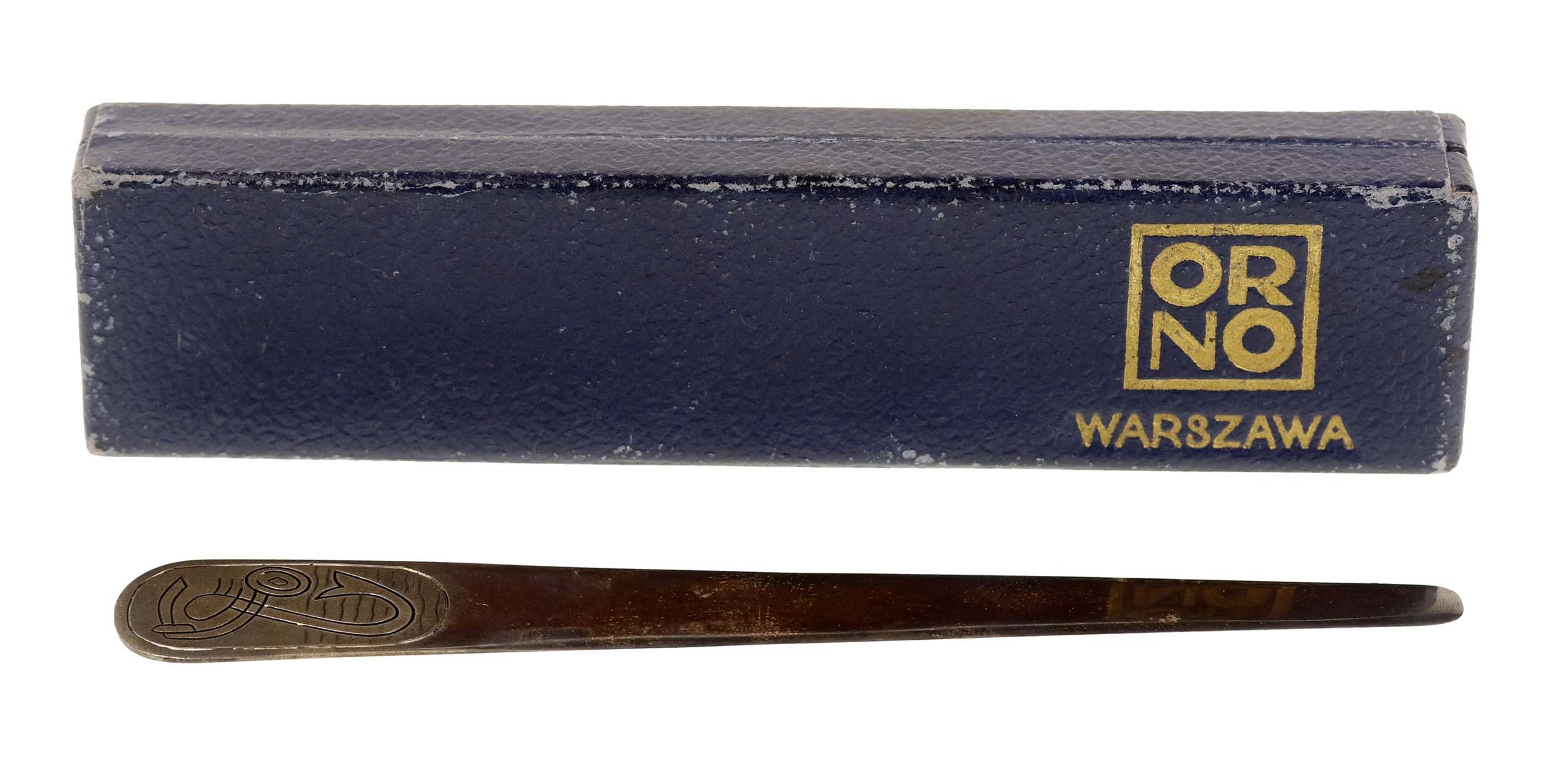 Nóż z Syrenką do papieru w etui, ORNO. Długość nożyka 14 cm. Na rączce wyobrażenie Syrenki Warszawskiej. Po drugiej stronie sygnatura ORNO oraz próba srebra "3". Pudełko tekturowe, tłoczona nazwa wytwórni ORNO WARSZAWA.