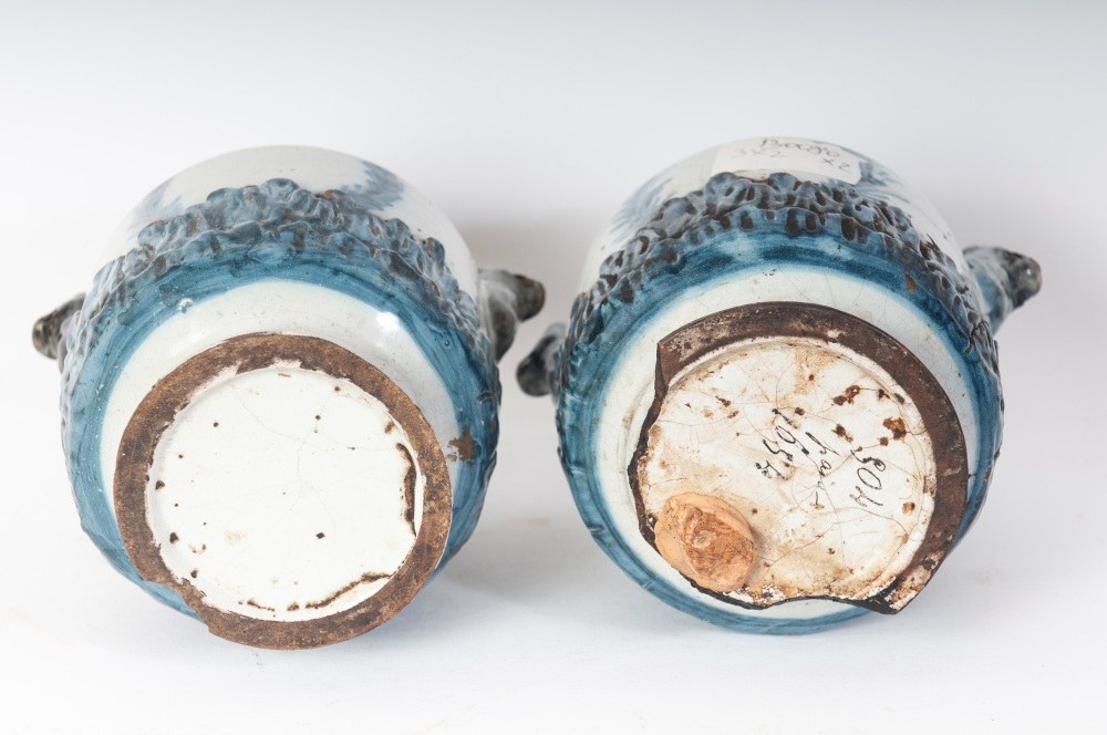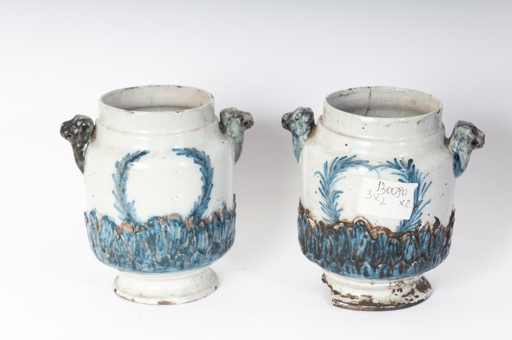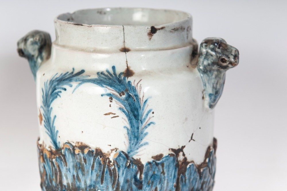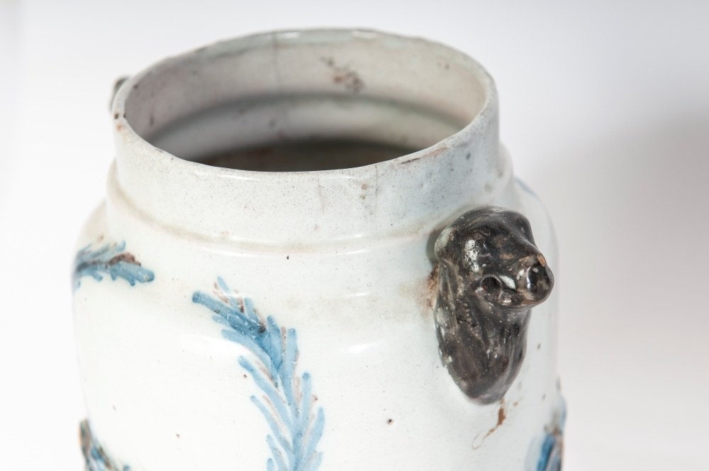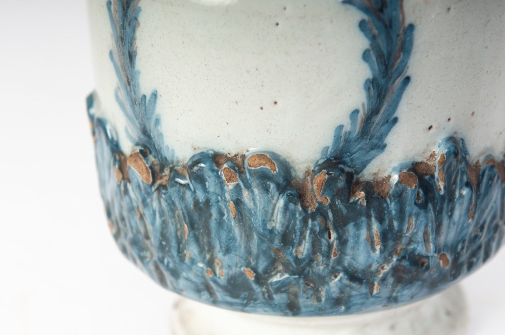 Cylindrical ceramic vase with lion-head handles and a base with embossed leaves. Disc-shaped base with a vertical upper rim. Leaf-motif decoration in manganese blue on a berettino background.