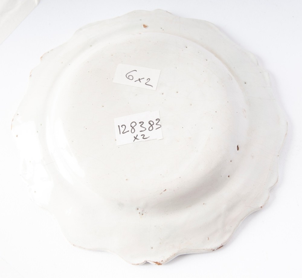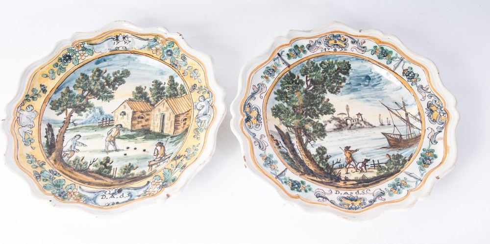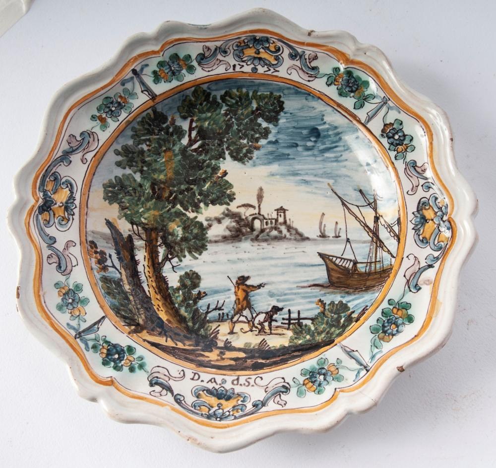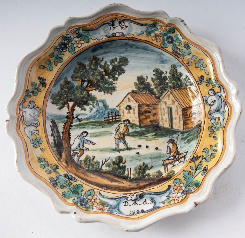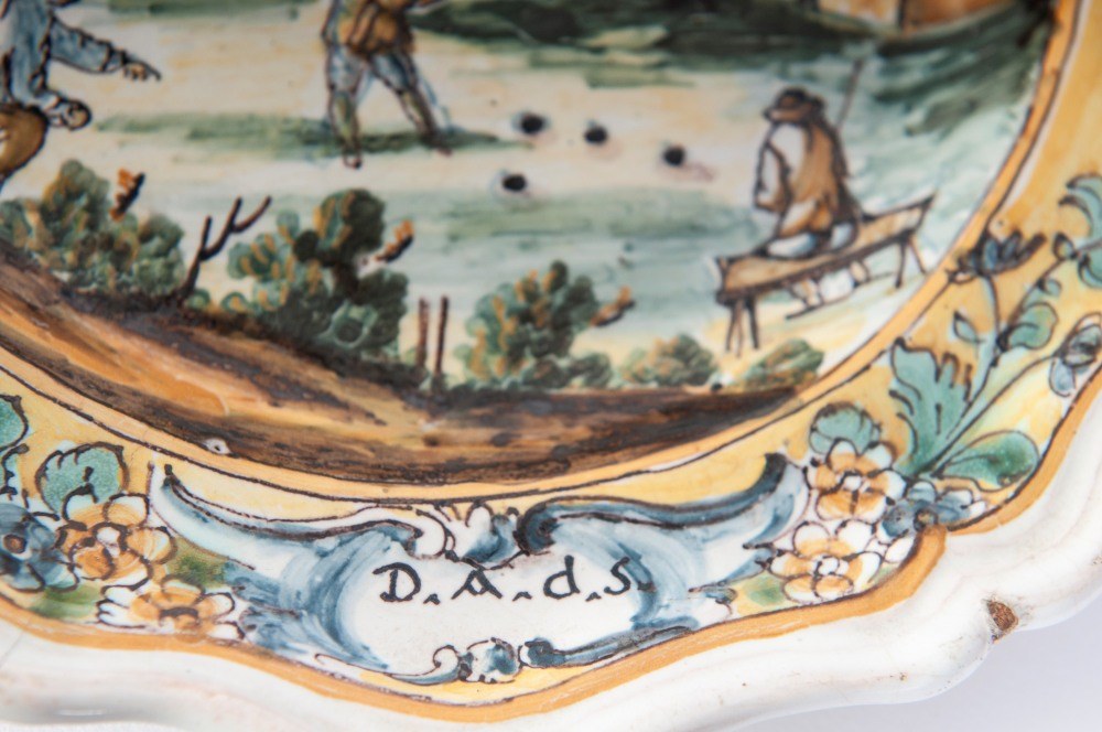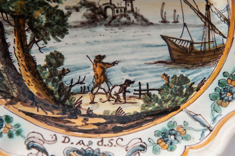 Six-pointed ceramic bowl, with a mixtilinear edge and a narrow brim, a short flounce, and a wide base. The back has a smooth base. Decorated with a landscape and figures. Campanian manufacture, second half of the 18th century.
