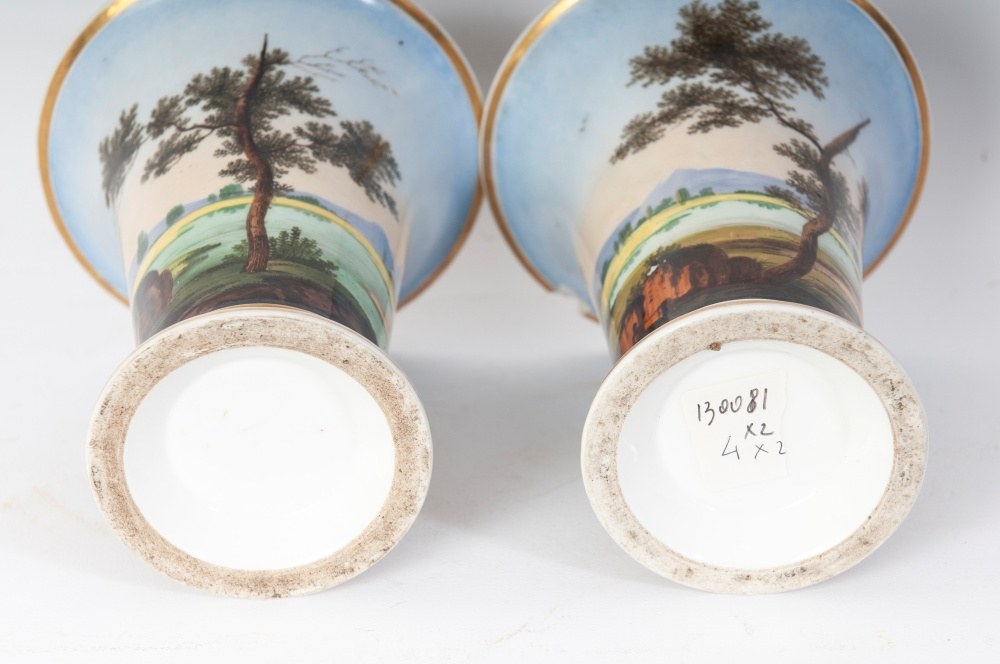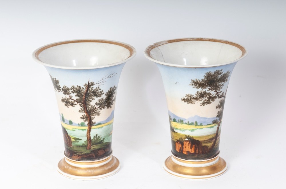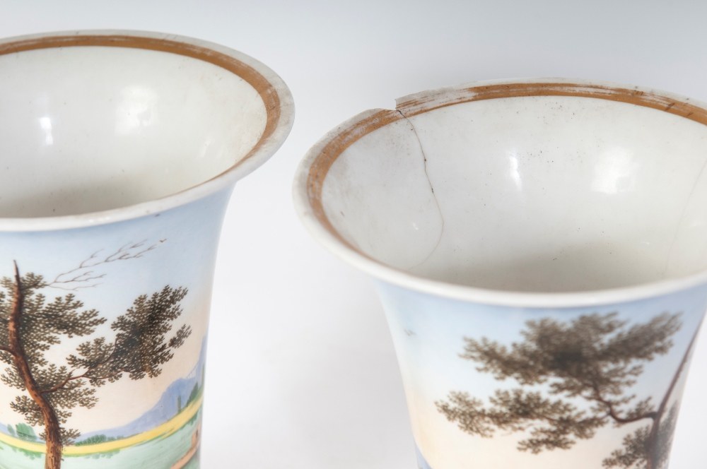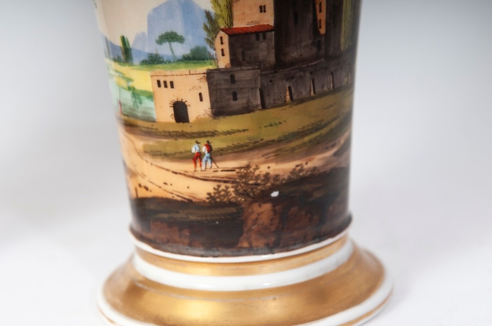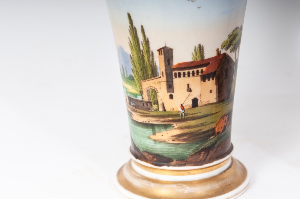 Polychrome porcelain. Disc-shaped base with a recessed bottom. Decorated with a landscape in the round on a blue background, finished in pure gold.