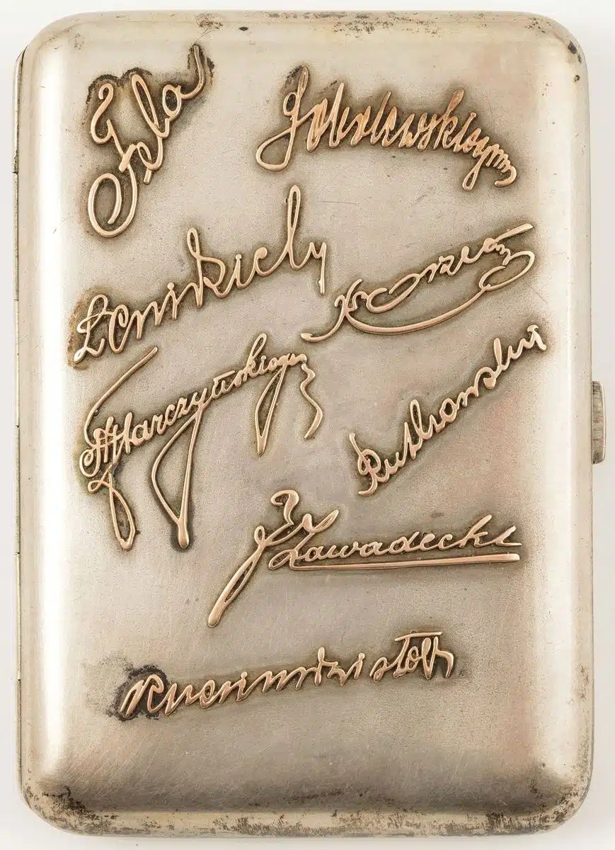 Na wieczku osiem złotych aplikacji: imiona i nazwiska
