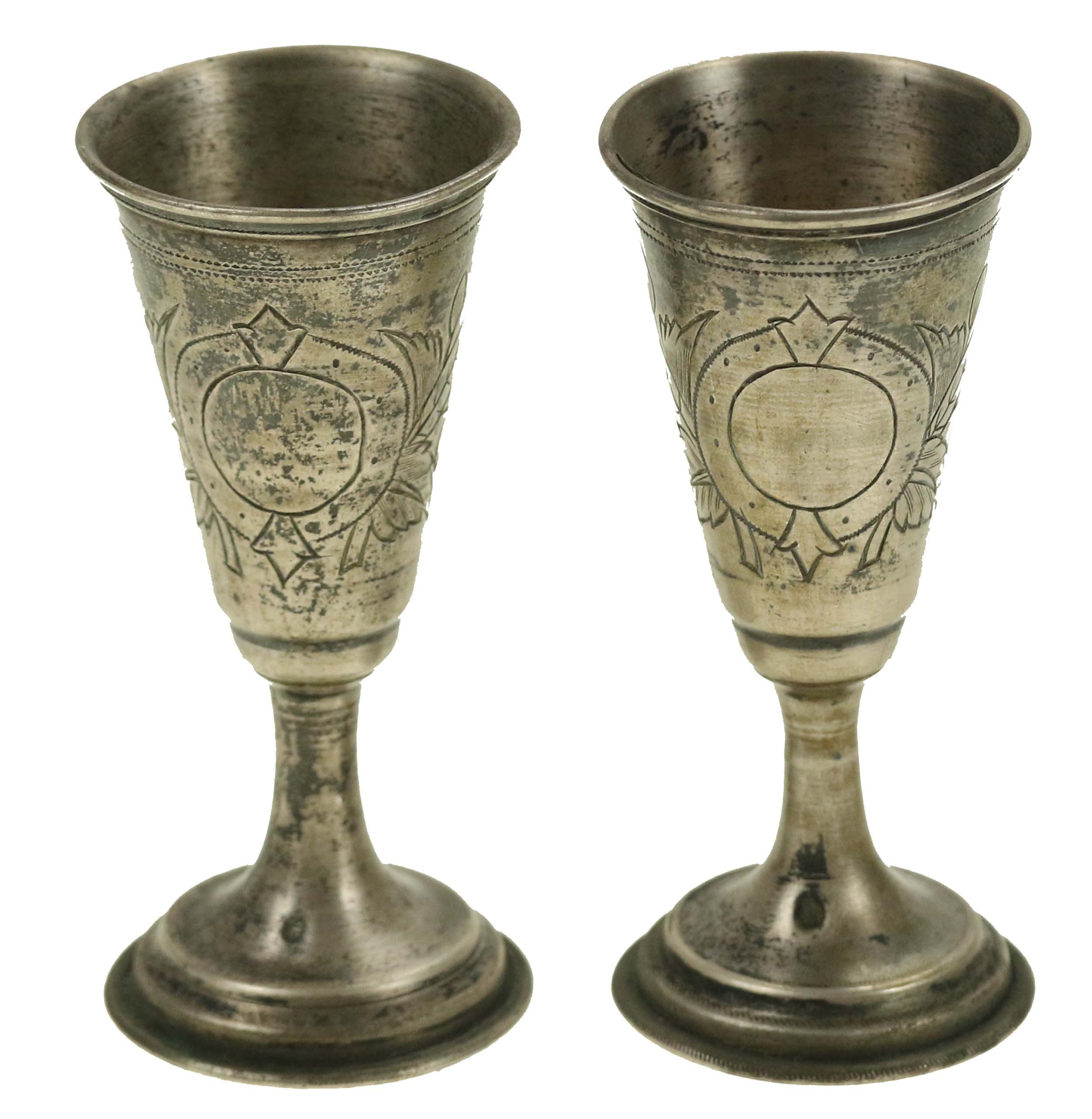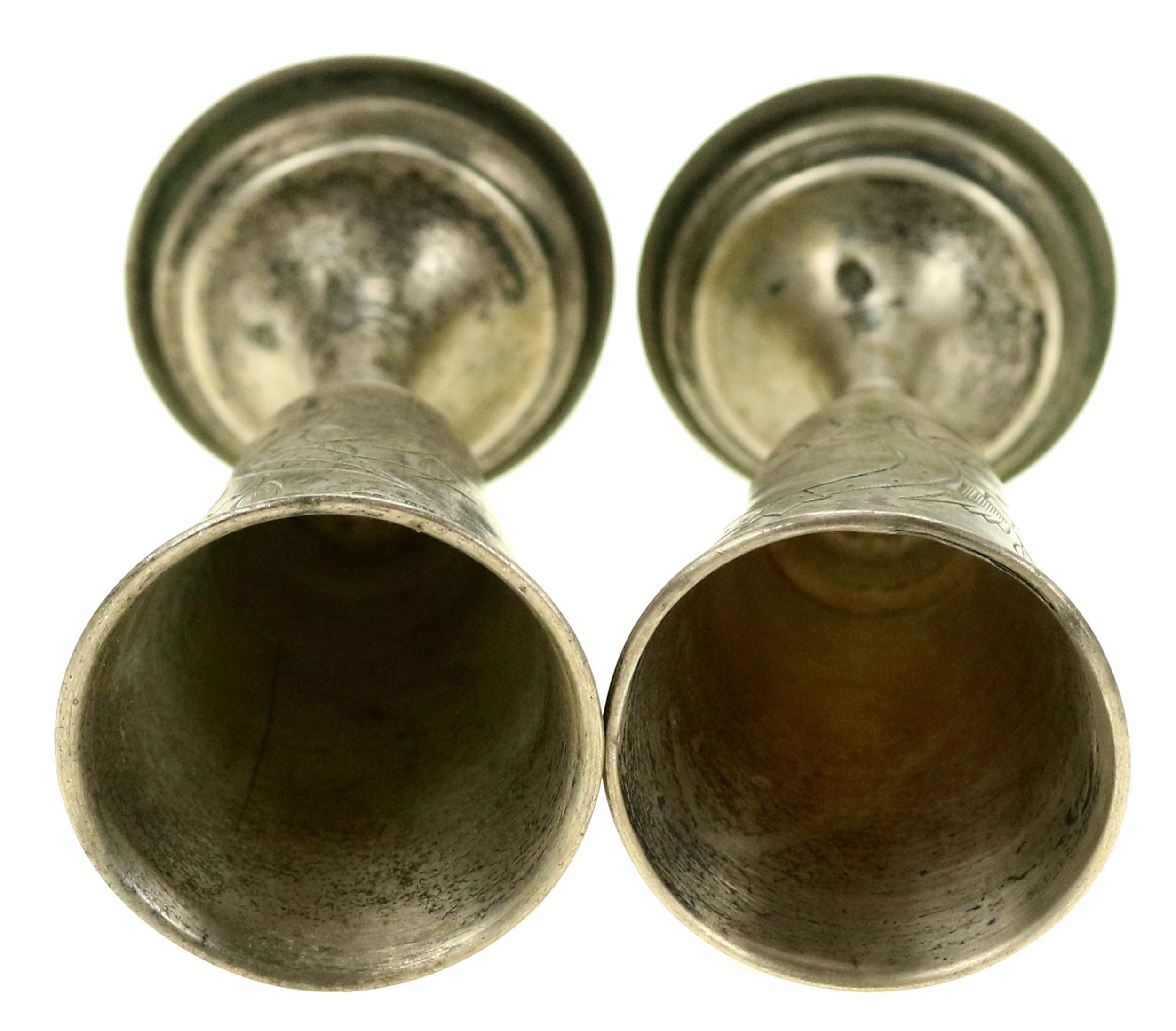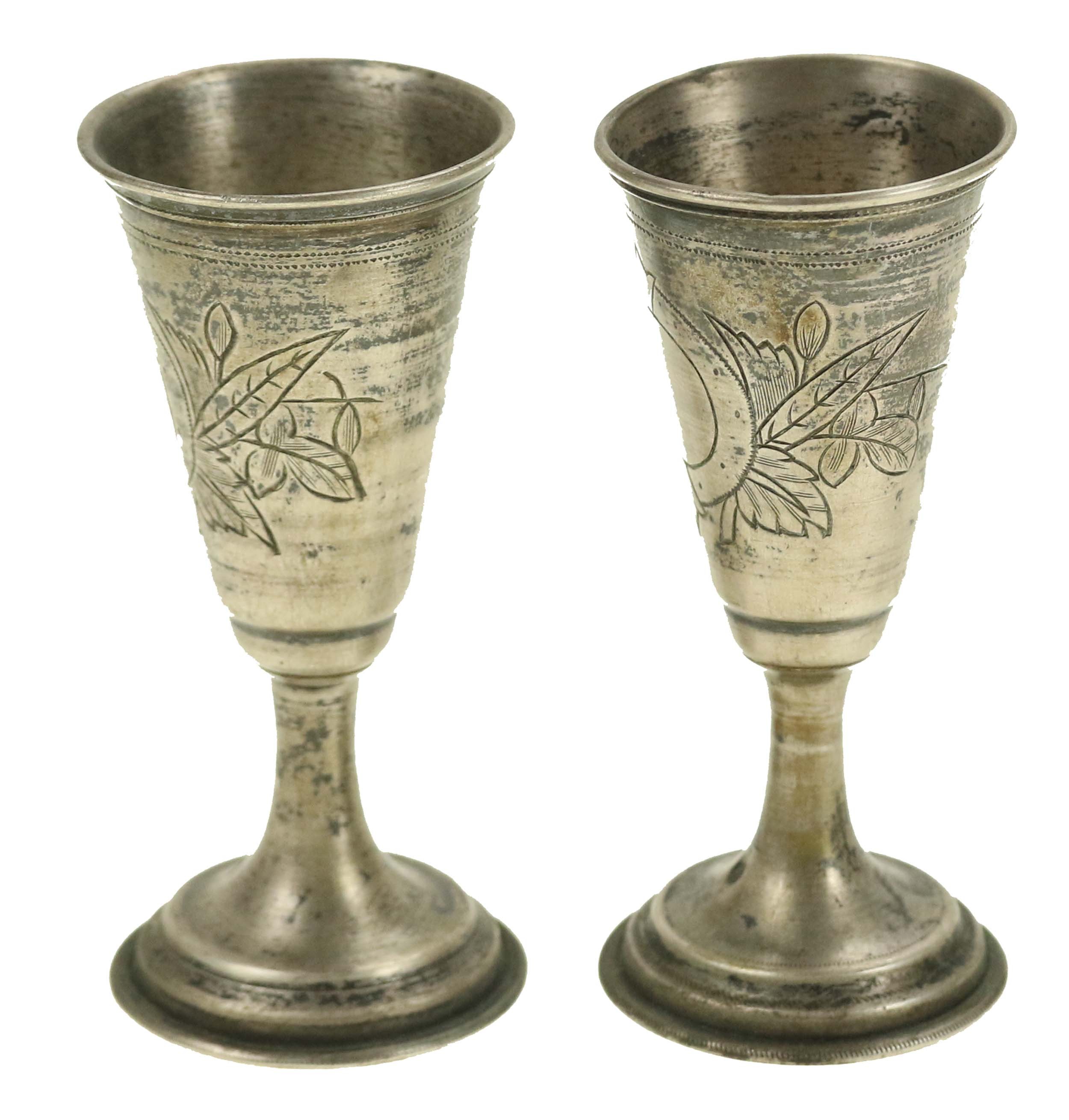 Para kieliszków kiduszowych, Warszawa 1896. Warszawska cecha srebra z 1896 oraz sygnatura wytwórcy "ЛГ". Srebro, waga łączna pary 56 g. wys 8,5 cm.