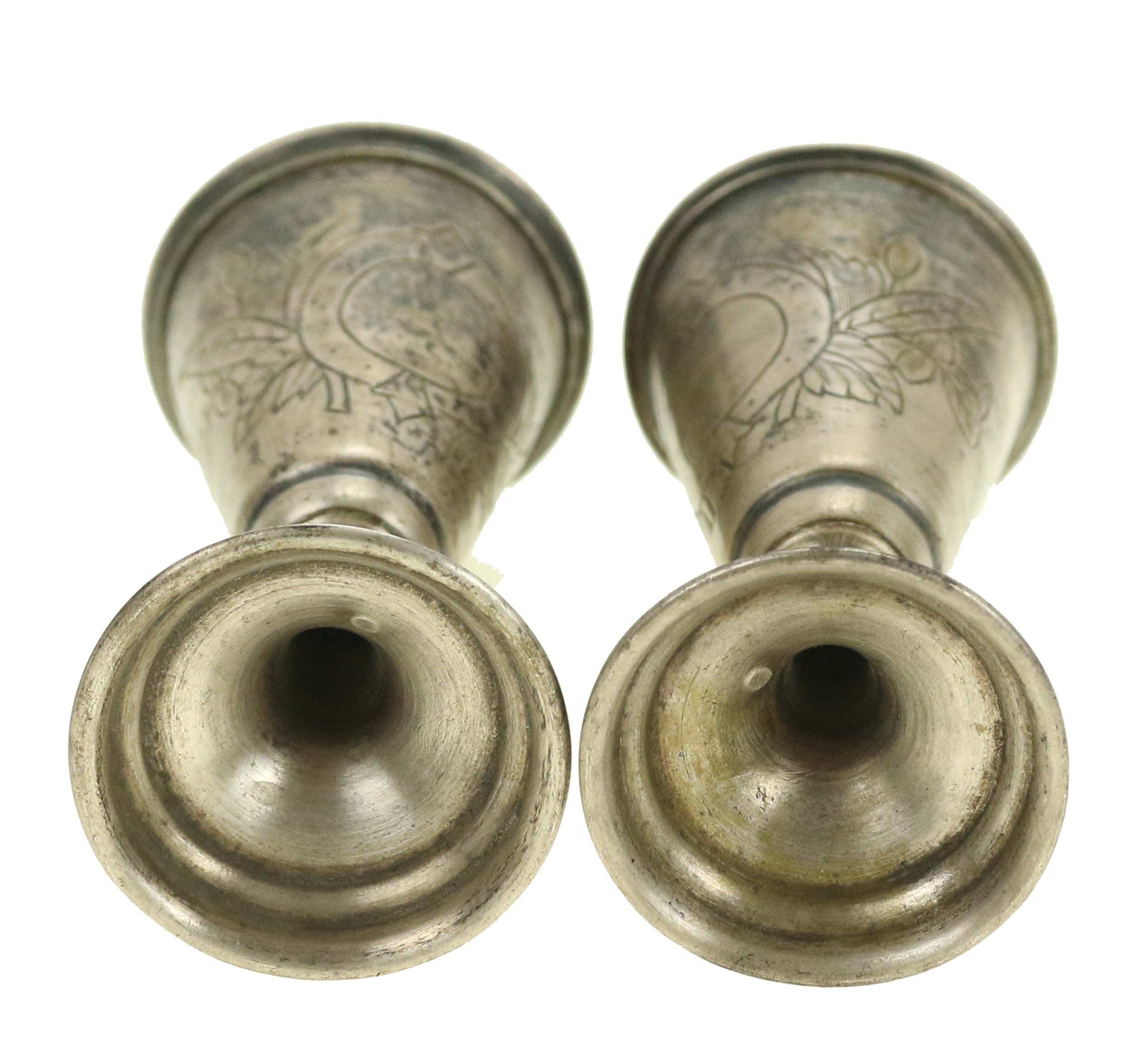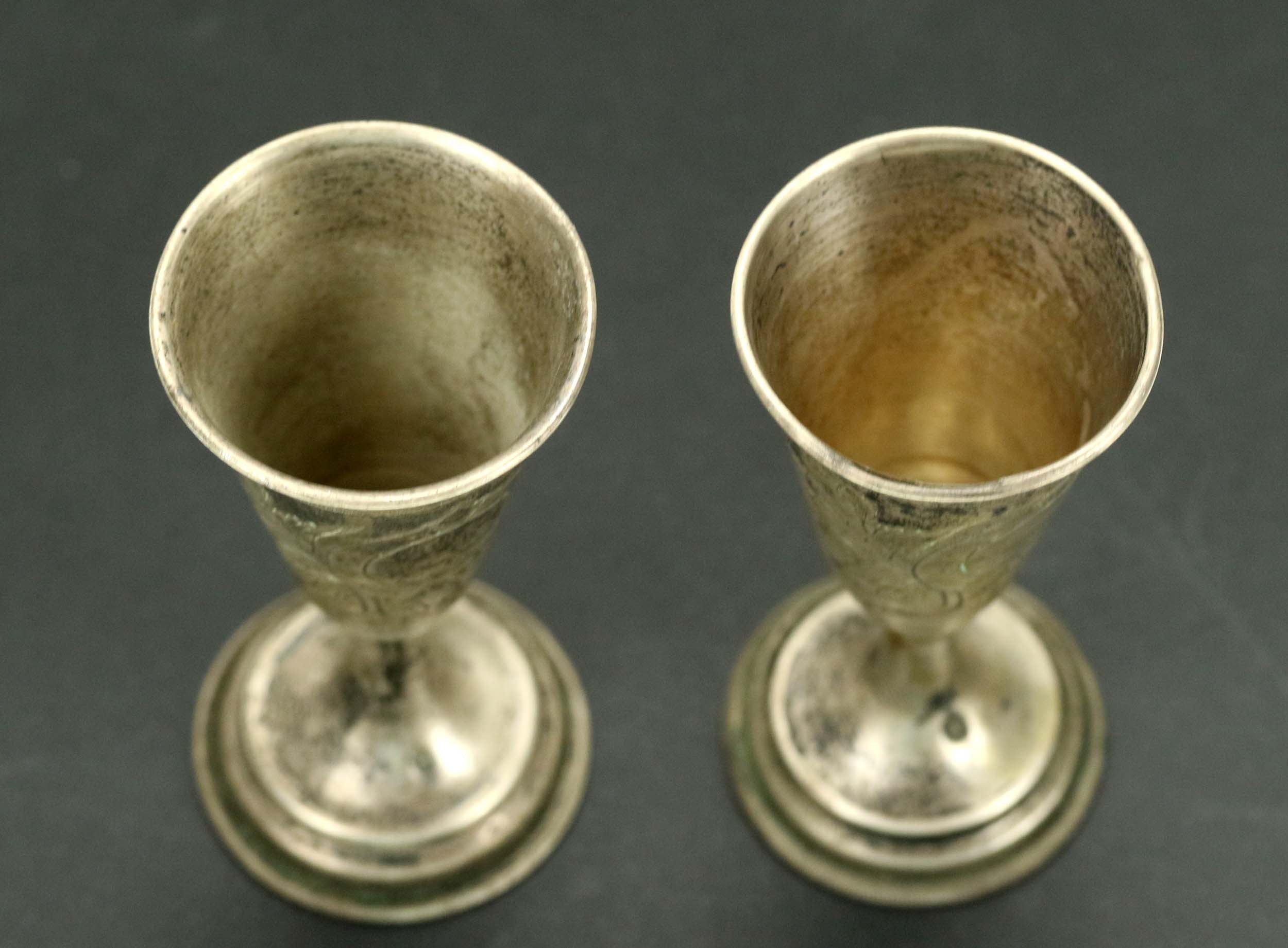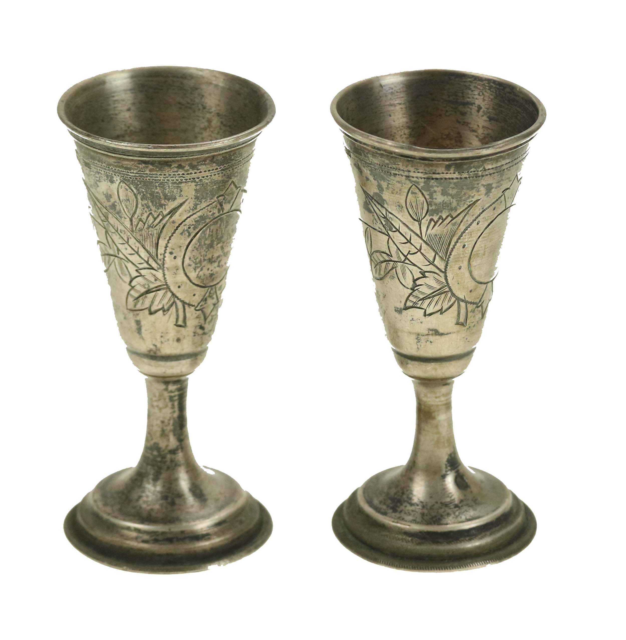 Para kieliszków kiduszowych, Warszawa 1896. Warszawska cecha srebra z 1896 oraz sygnatura wytwórcy "ЛГ". Srebro, waga łączna pary 56 g. wys 8,5 cm.