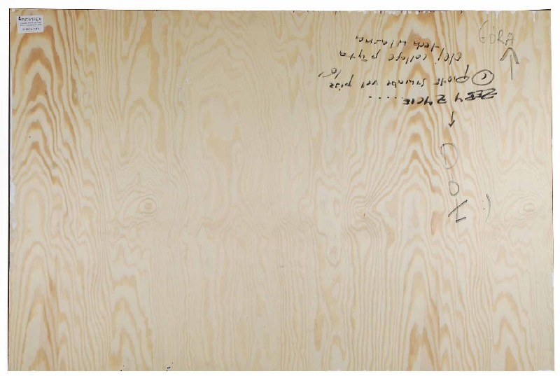 olej, collage, płyta; 80 x 130 cm; sygn., dat. i opis na odwrocie: ŻEBY ŻYCIE ... / piotr szwabe vel pisz / olej, collage, płyta / technika własna