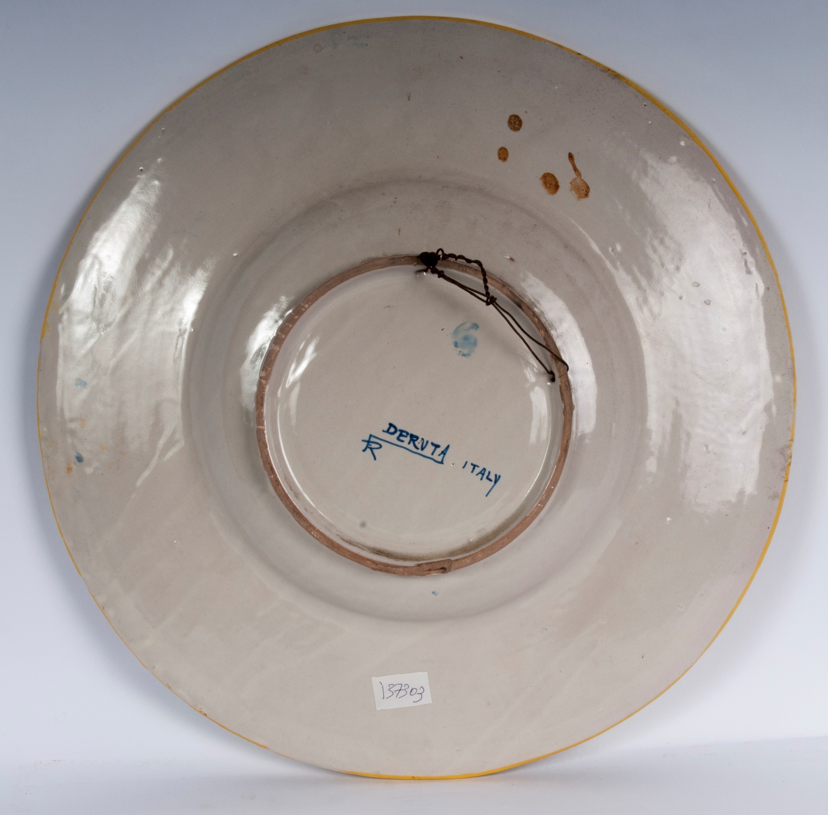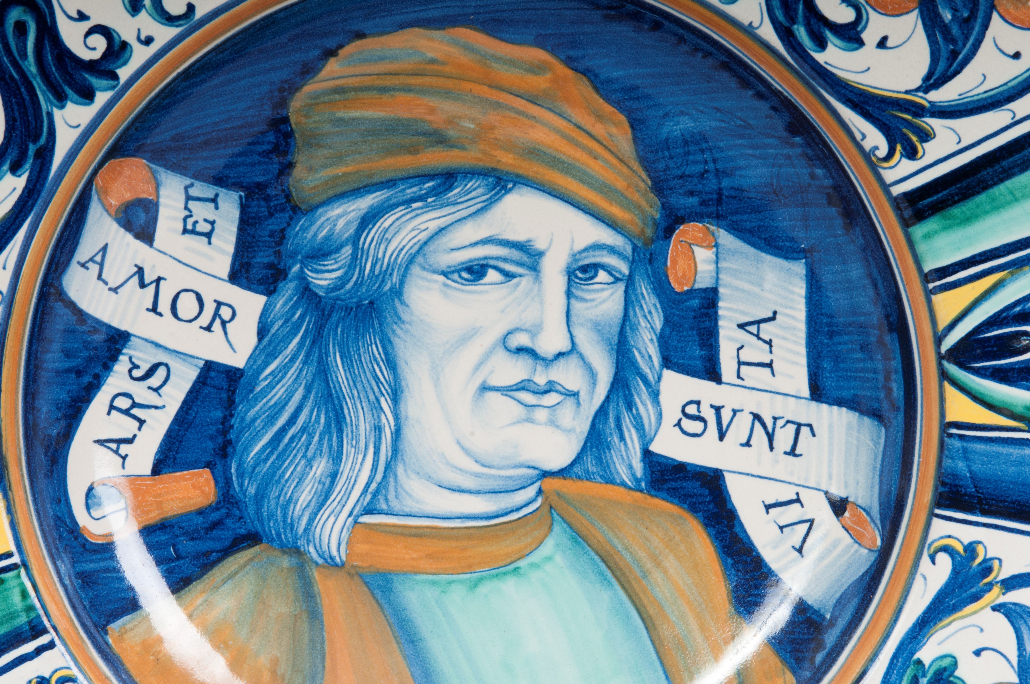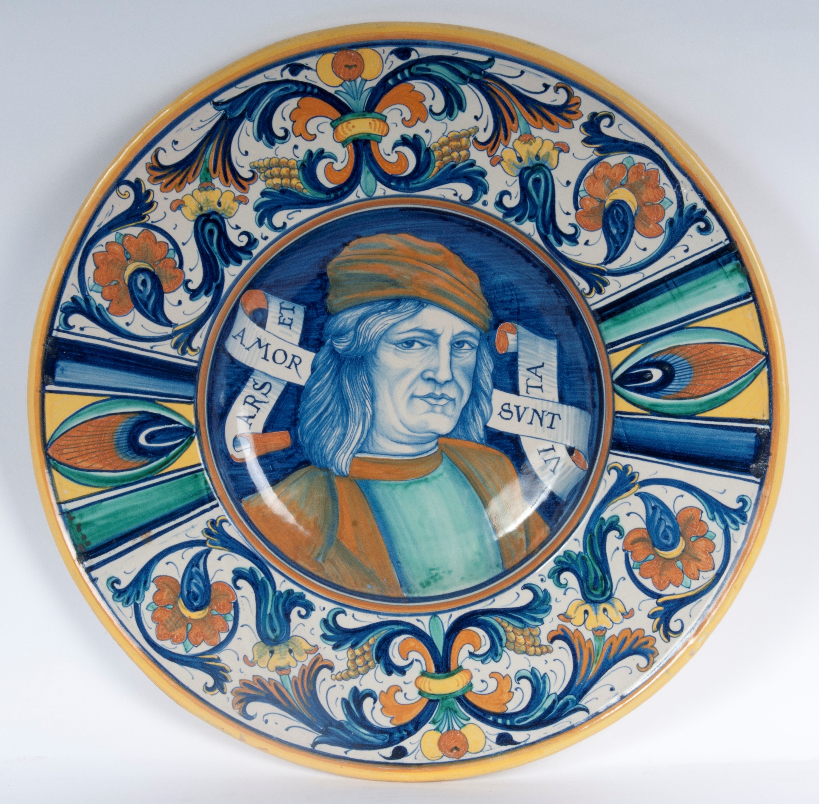 with a wide, short brim, flounce, and a wide base. The rim of the plate has a slightly raised lip. The brim is decorated with leafy scrolls on a white background and peacock-eye metopes. In the background is a portrait of Perugino (P. Vannucci) with a cartouche "ARS ET AMOR SUNT VITA" on a blue background. The back has a ring-shaped support with a lowered background. Signature on the back under the glaze in blue. Deruta manufacture by R. Ficola