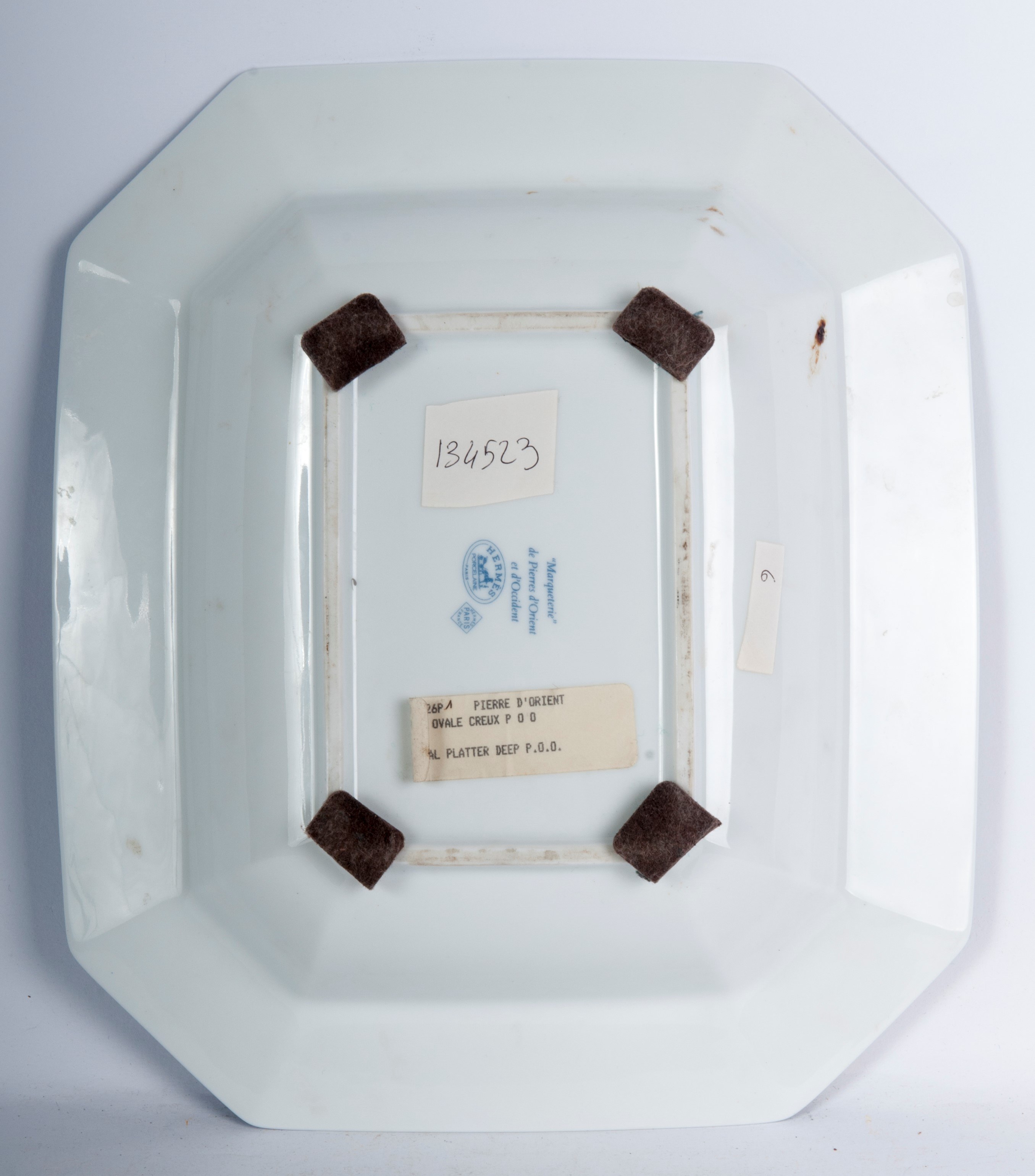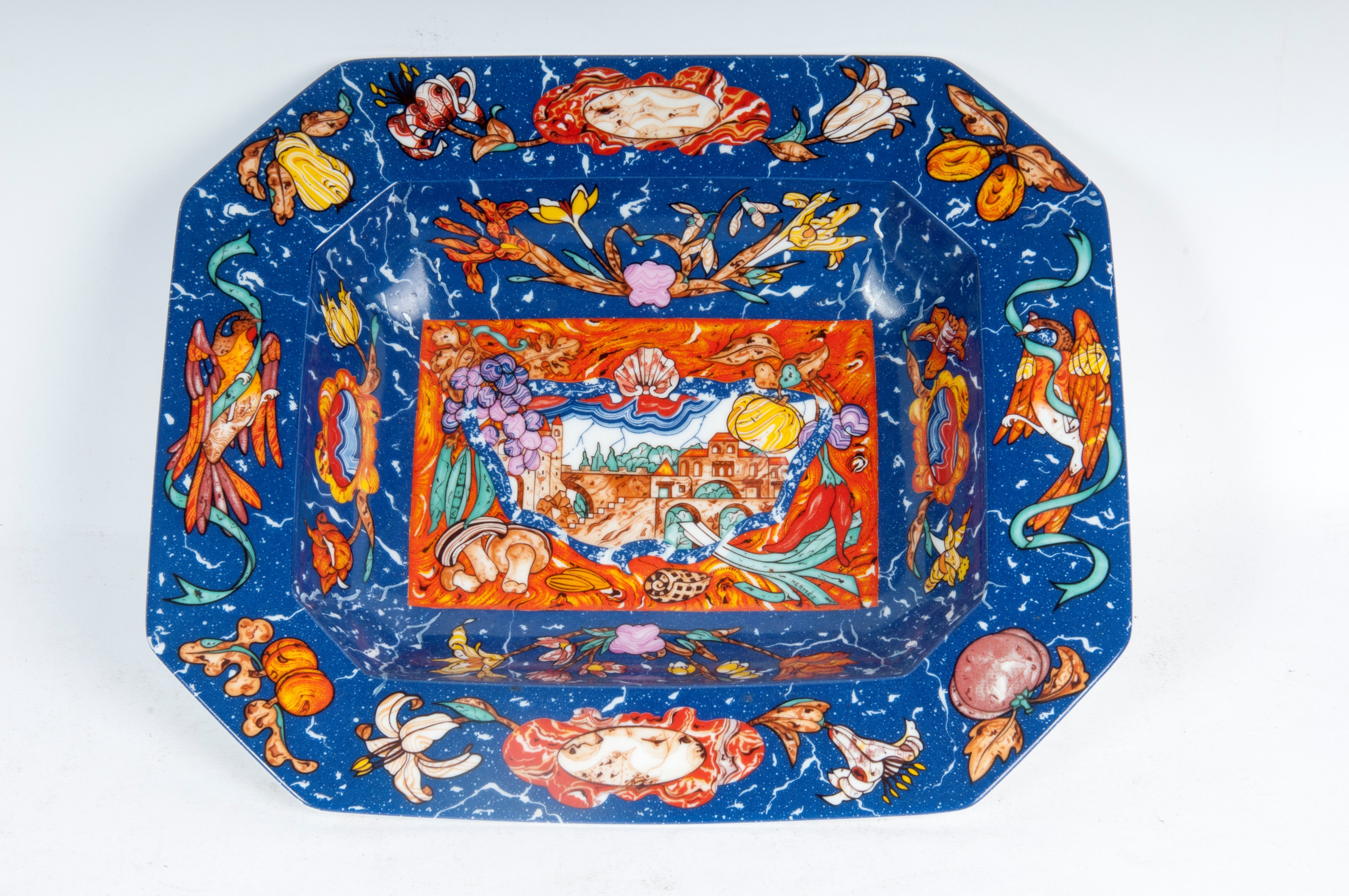 With an octagonal profile. Fruit and flower decoration on a blue and orange marbled background. Made by Hermes.
