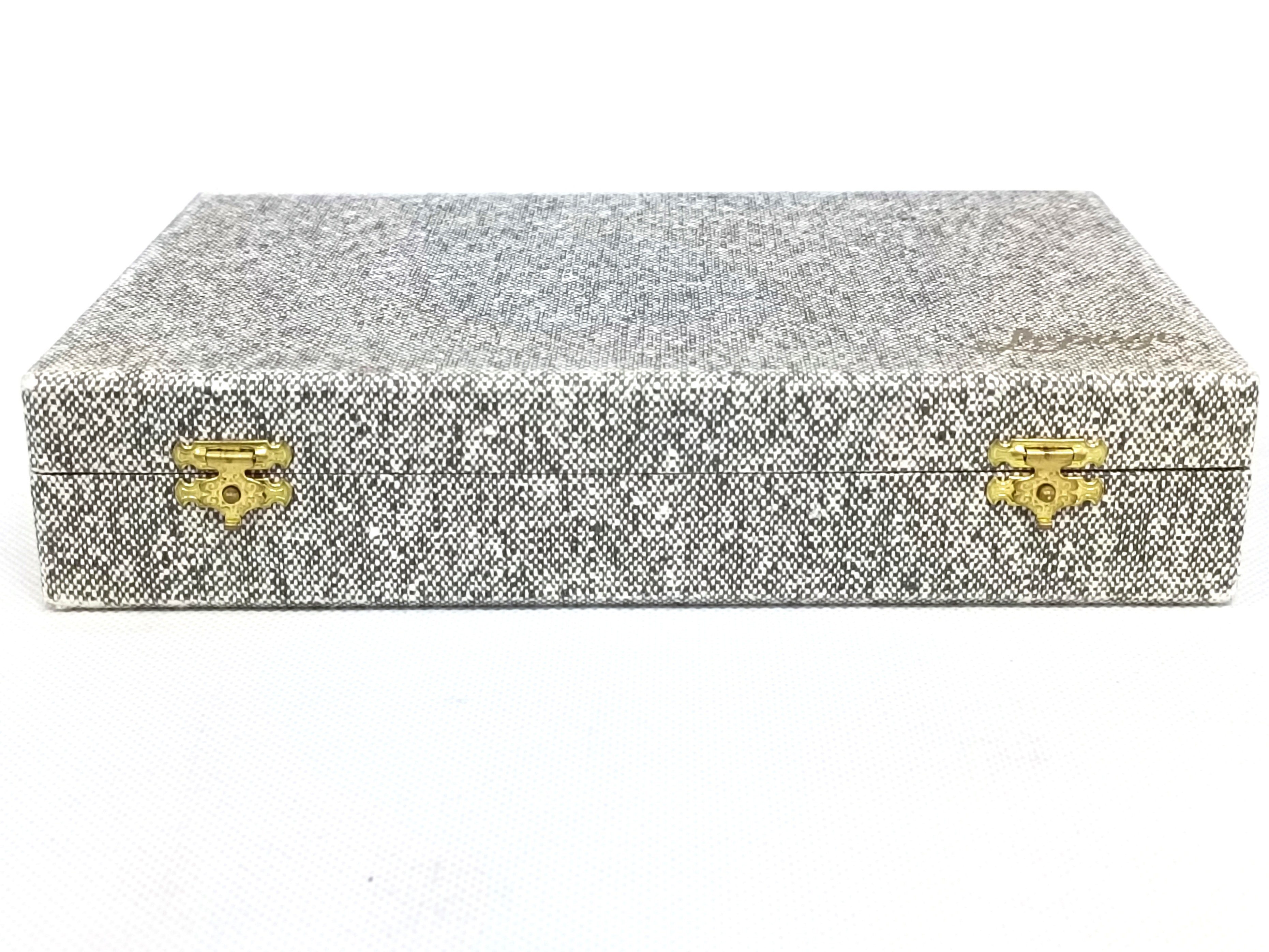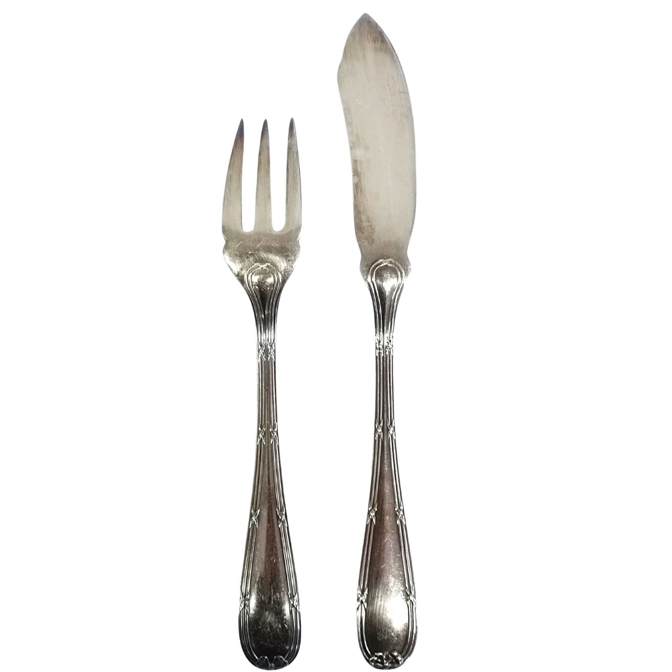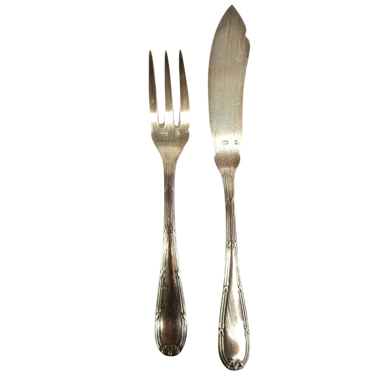 Komplet sztućców do ryb, składajacy się z 5 widelców i 5 noży, w sztywnym etui (dystrybutora?). Trzonki zdobione dekoracyjnym motywem. Punce producenta (François Frionnet / 48). Stan dobry/bardzo dobry, niewielke ślady użytkowania/patyna.