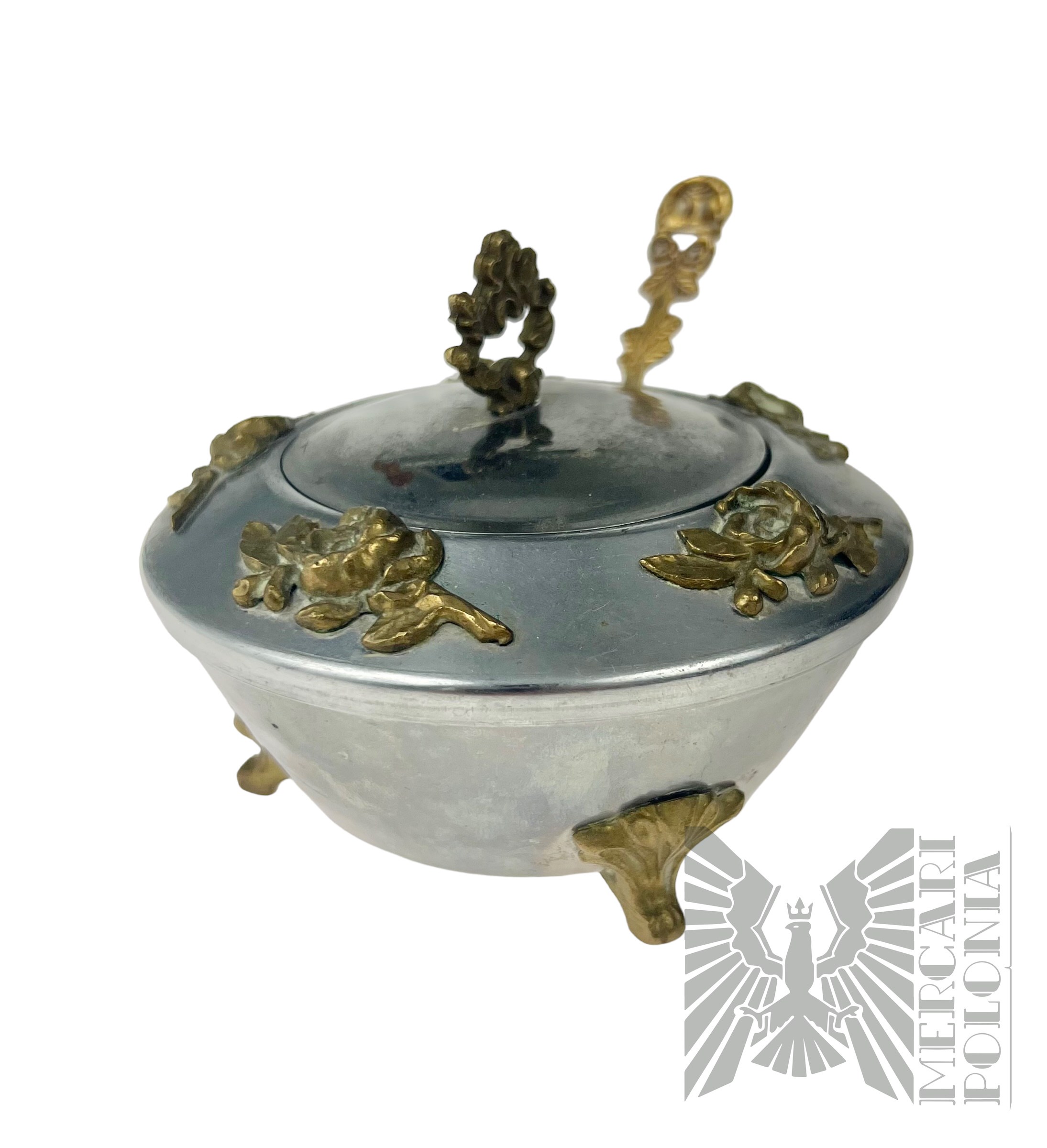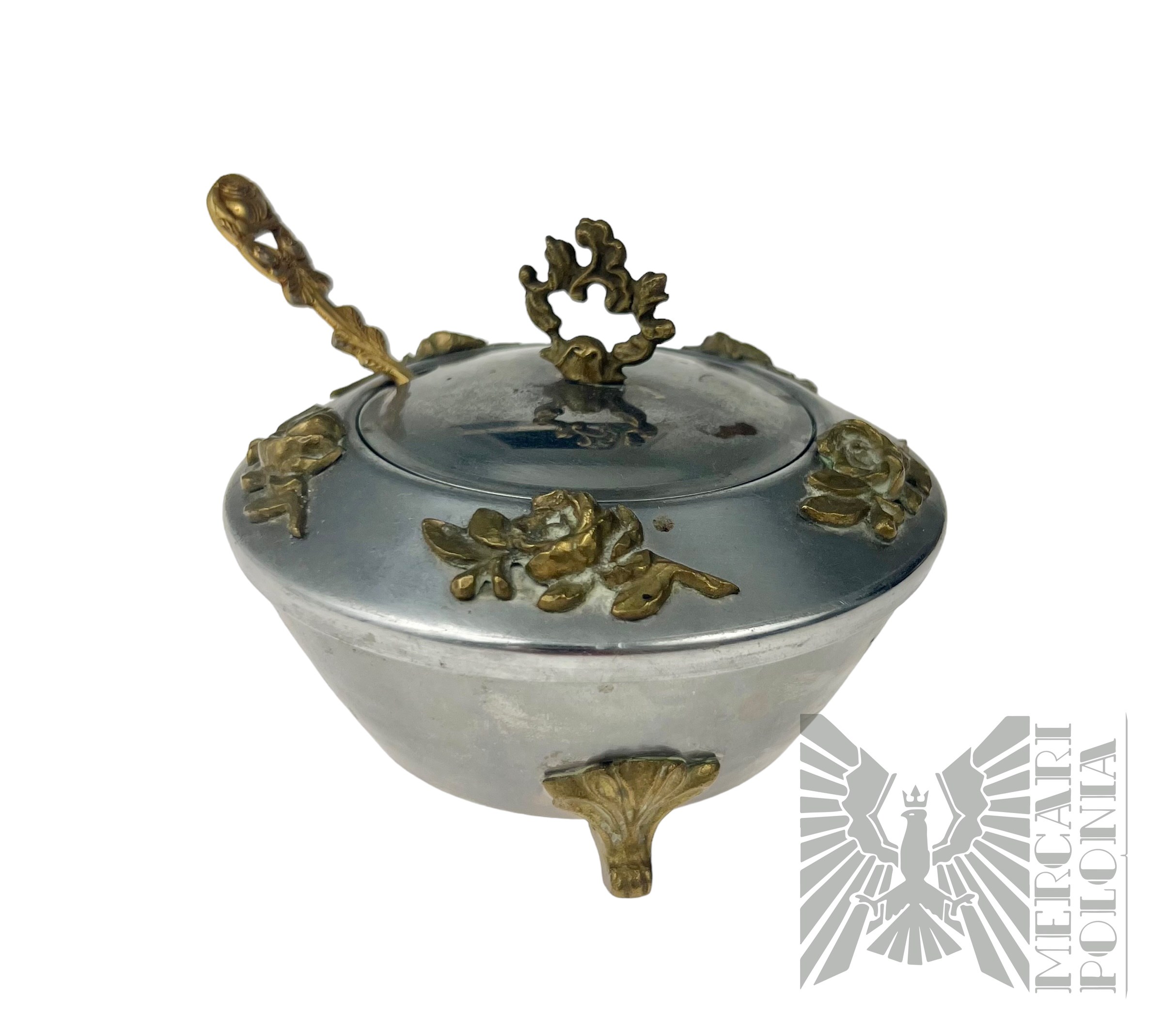Cukiernica wykonana z białego metalu z nabijanymi ozdobami w formie kwiatów. Cukiernica w komplecie z łyżeczką.