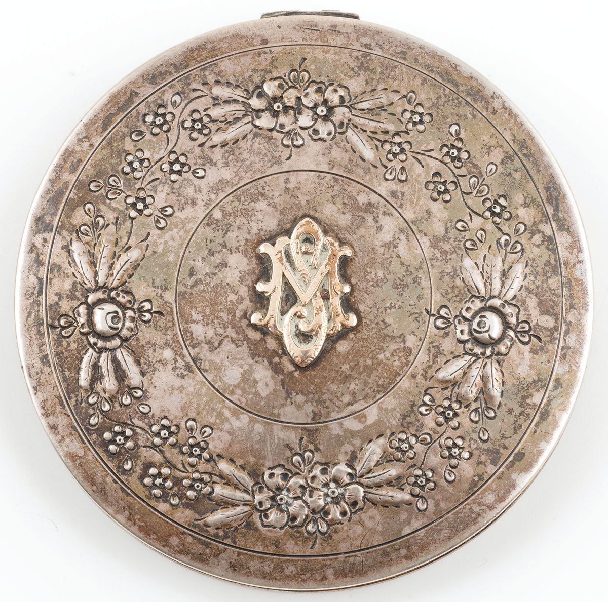 Srebro, złoto (aplikacja - monogram MS), szklo, waga cłk. 118.9 g, śr.8,5 cm