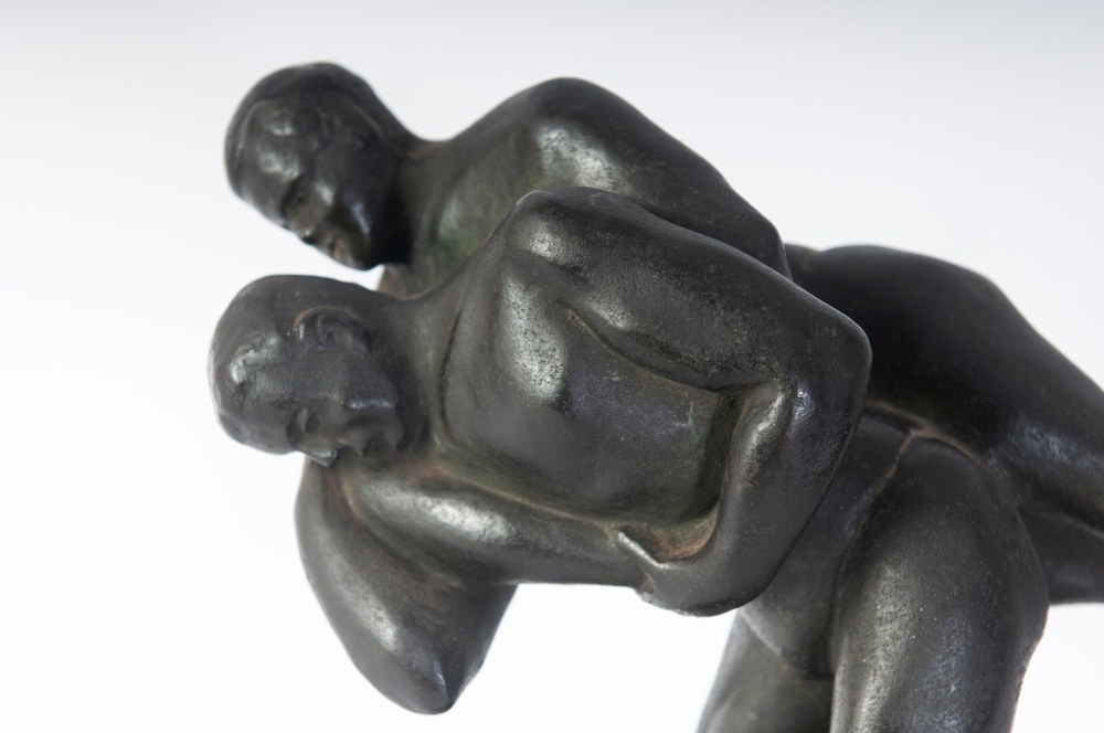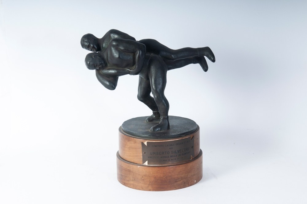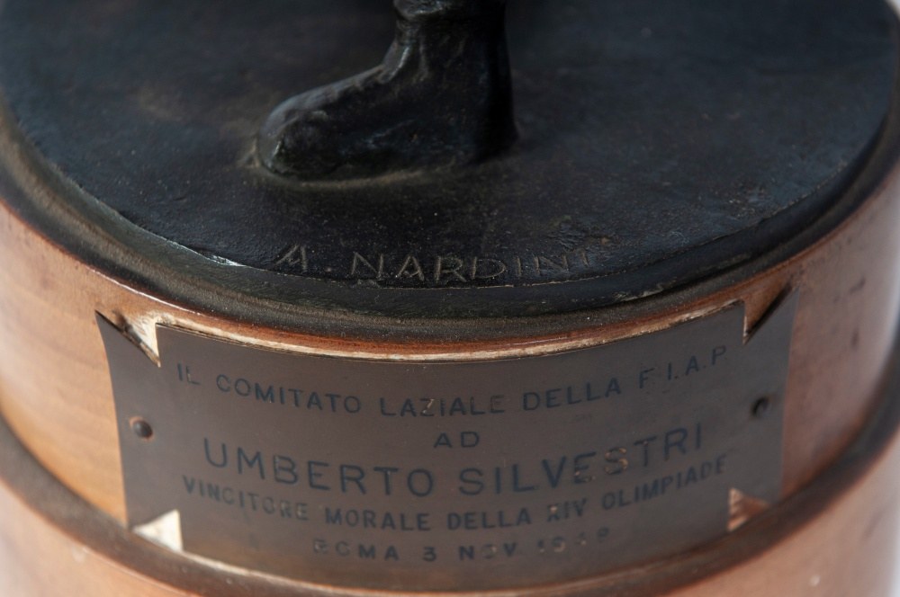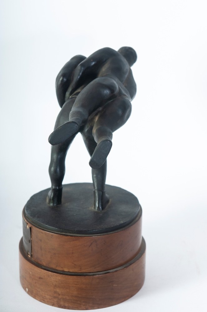 Brown-patina bronze sculpture in the round on a wooden base. With dedicatory cartouche, dated and signed.