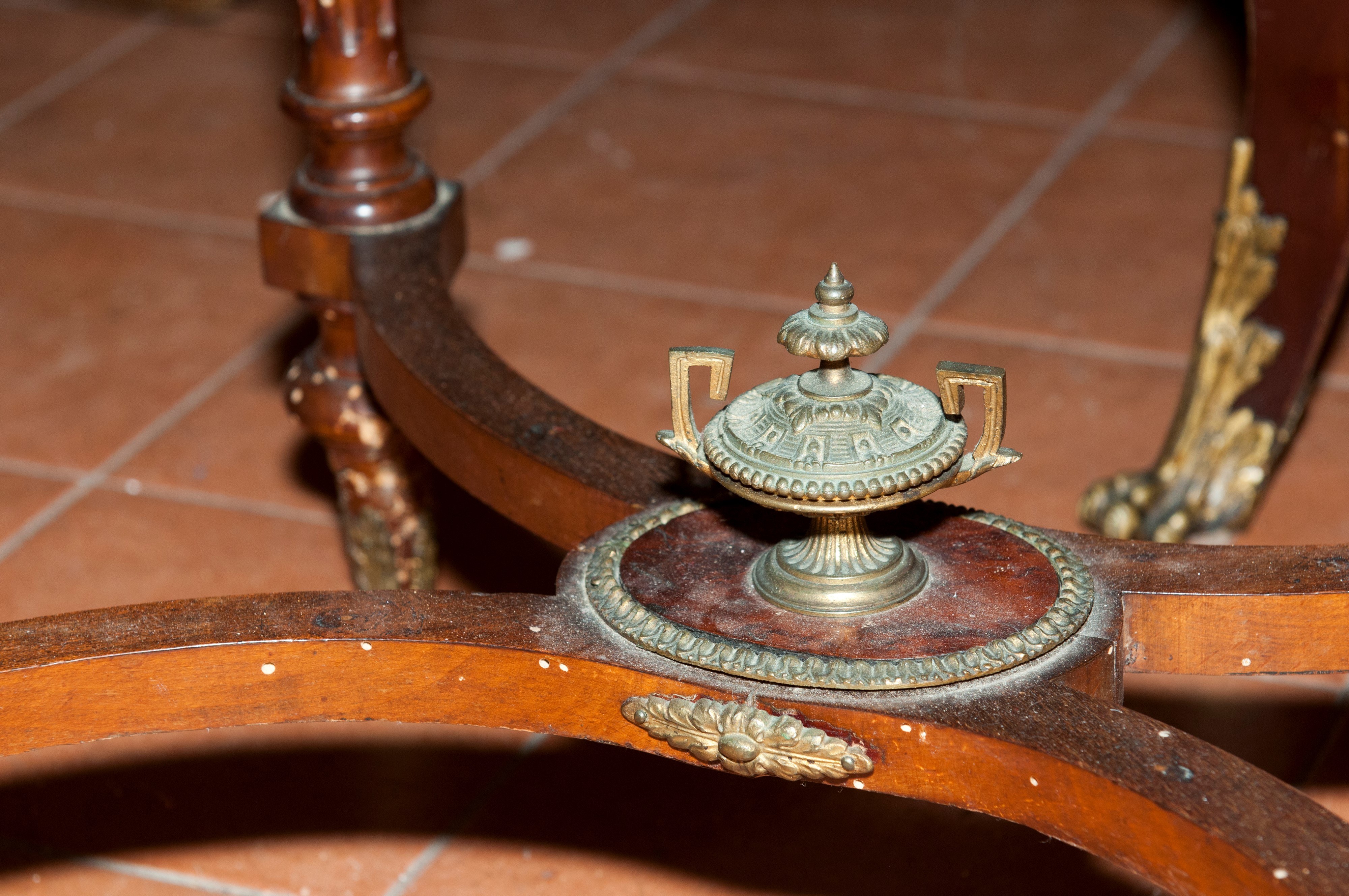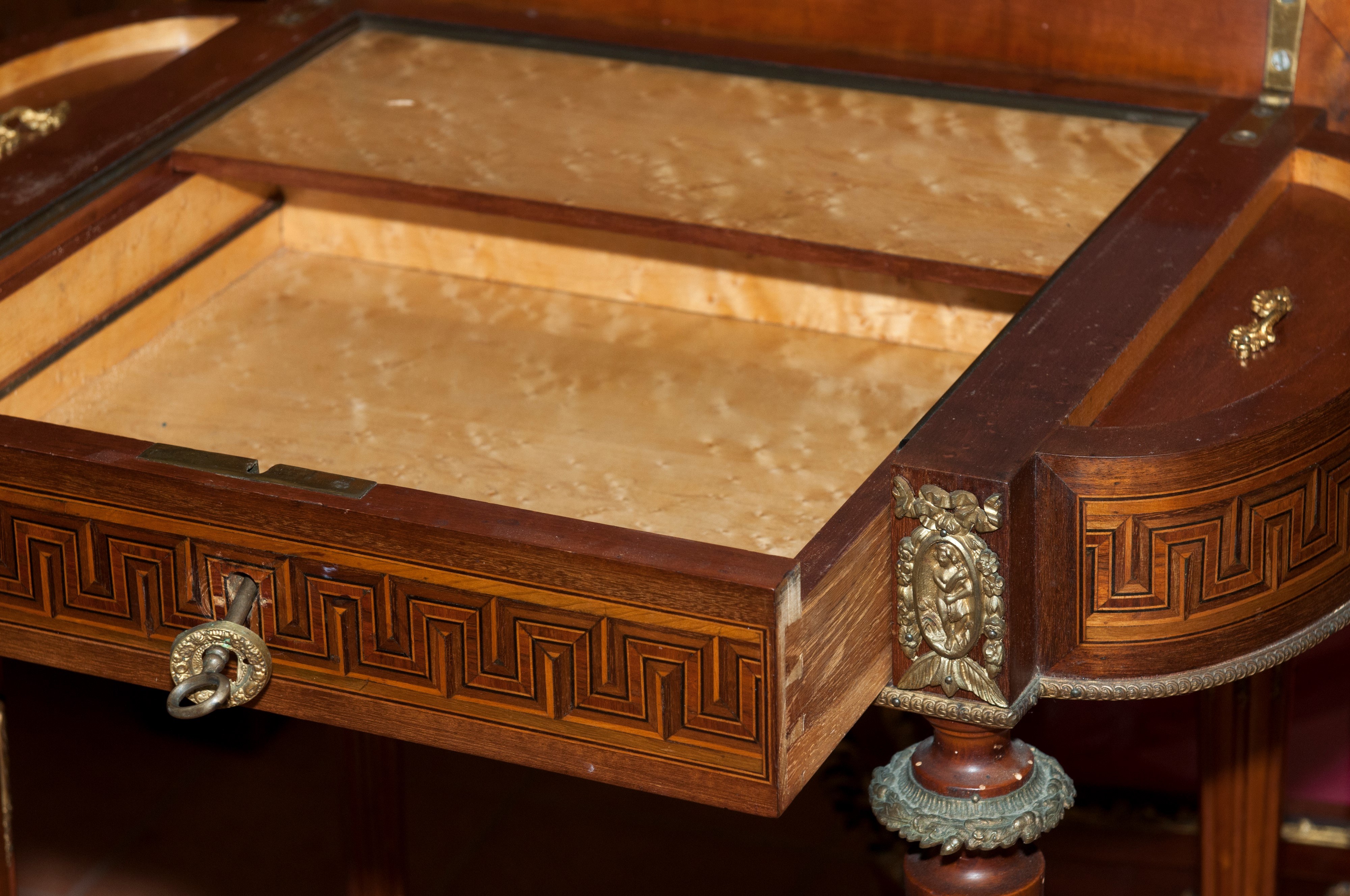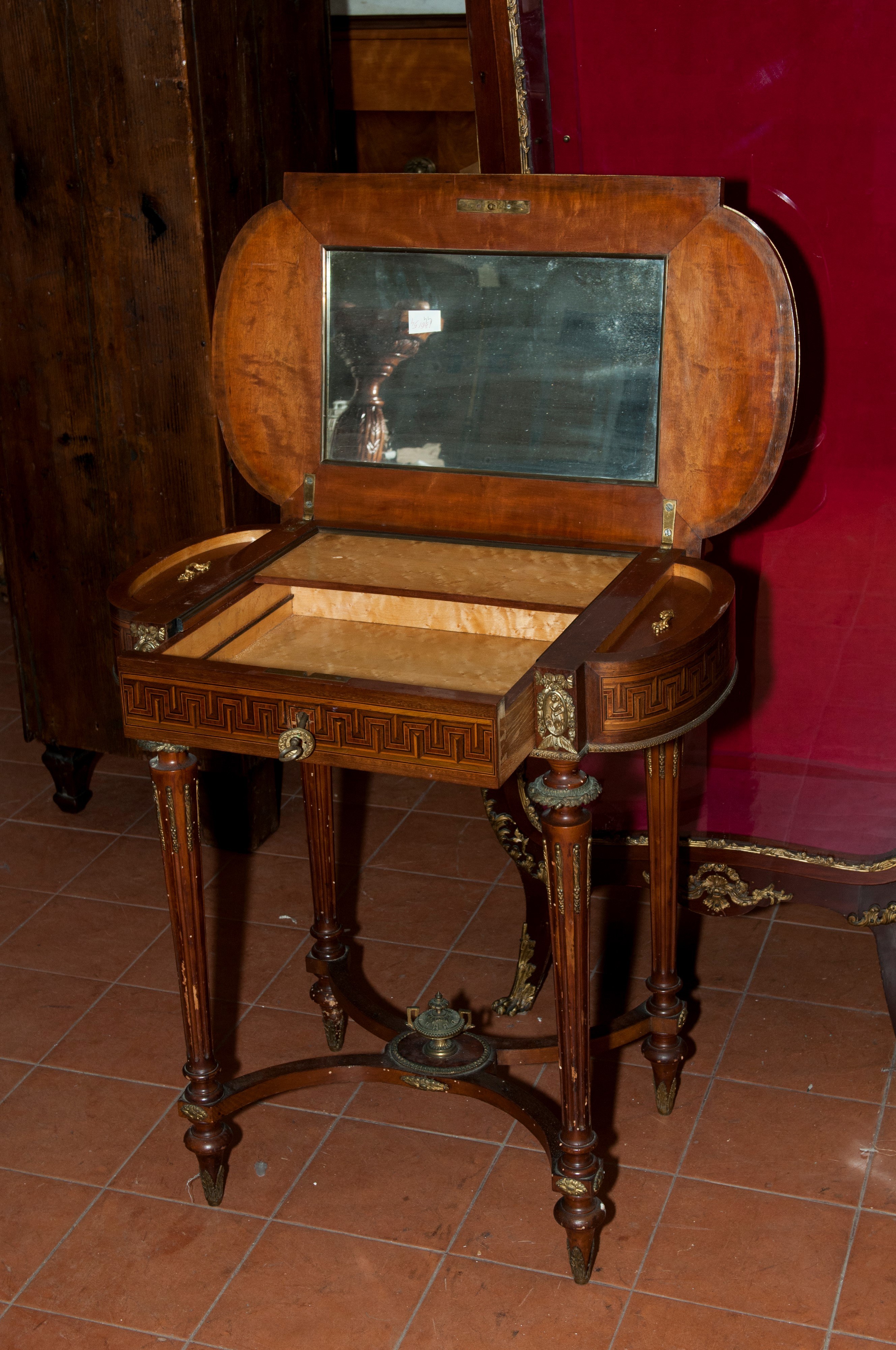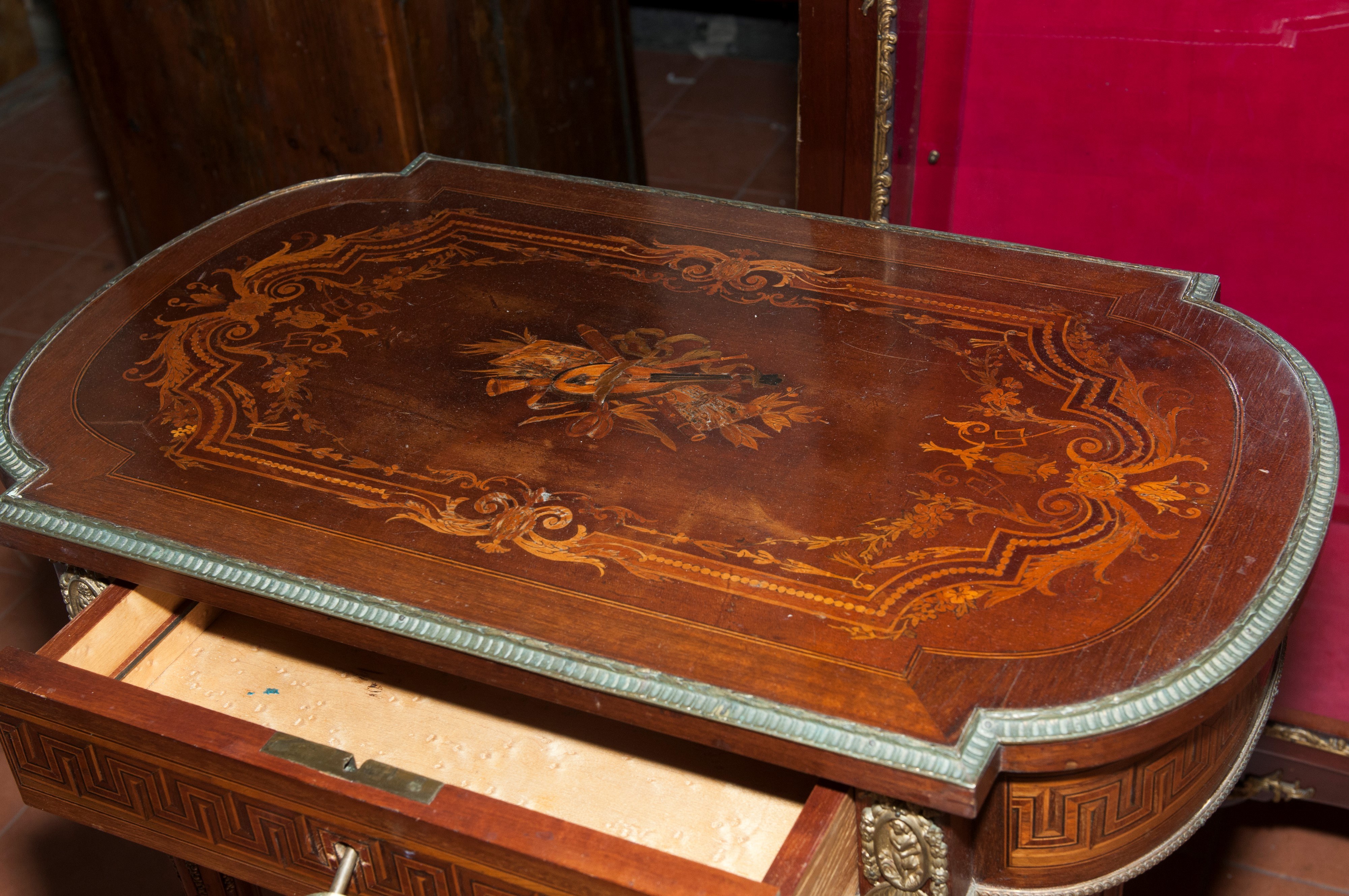 Made of mahogany and thuja wood, it features four fluted legs connected at the base, supporting a curved body with a drawer and a drop-leaf top. Inside, a compartment with two side drawers and a central mirror. The top is finished in fruitwood with musical instruments and foliage.
