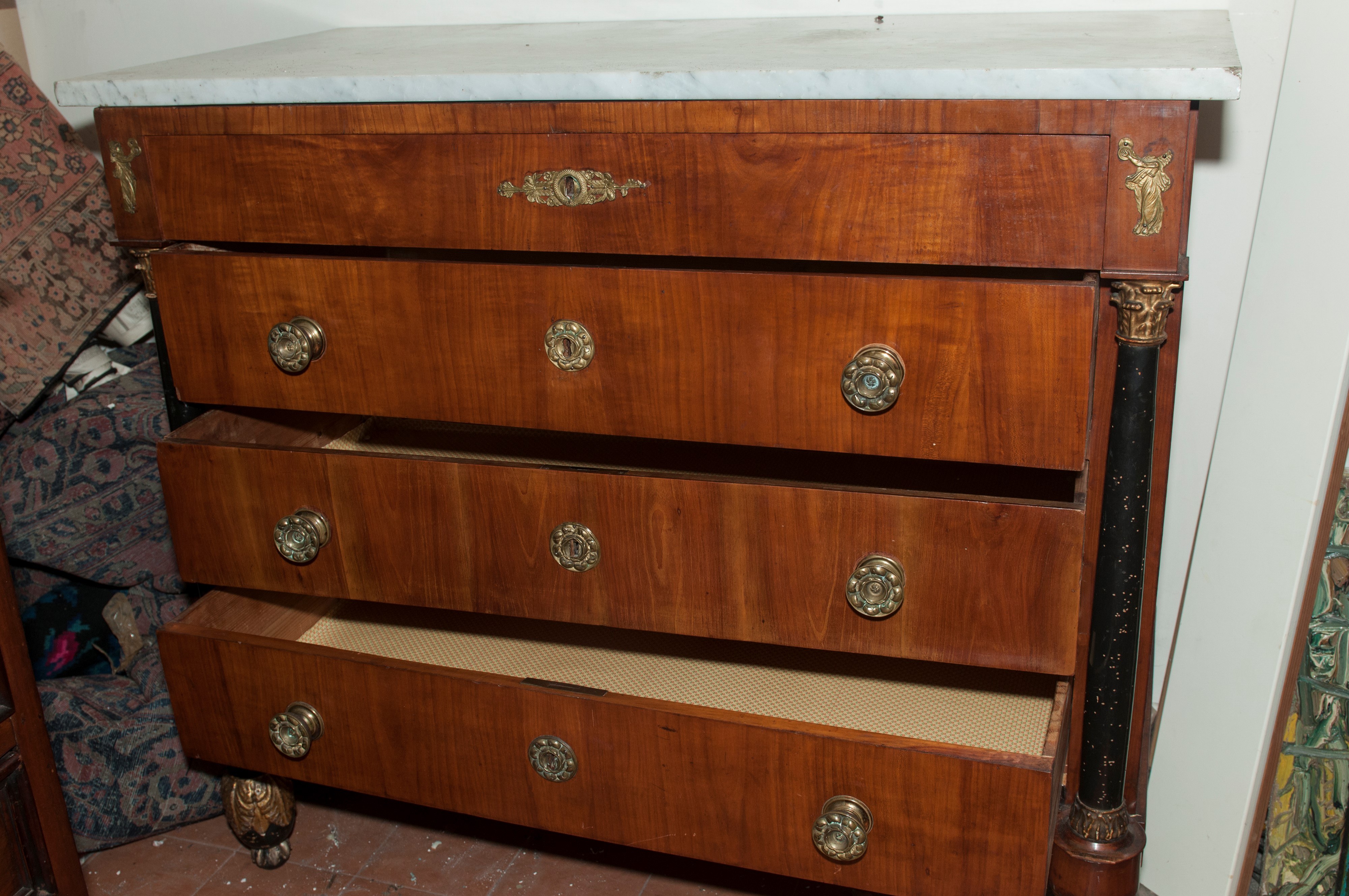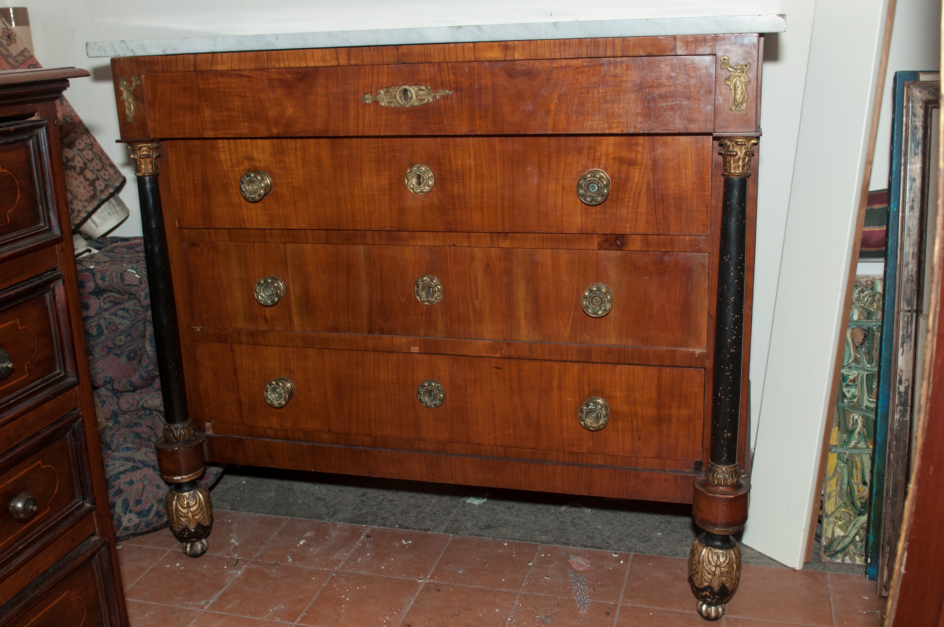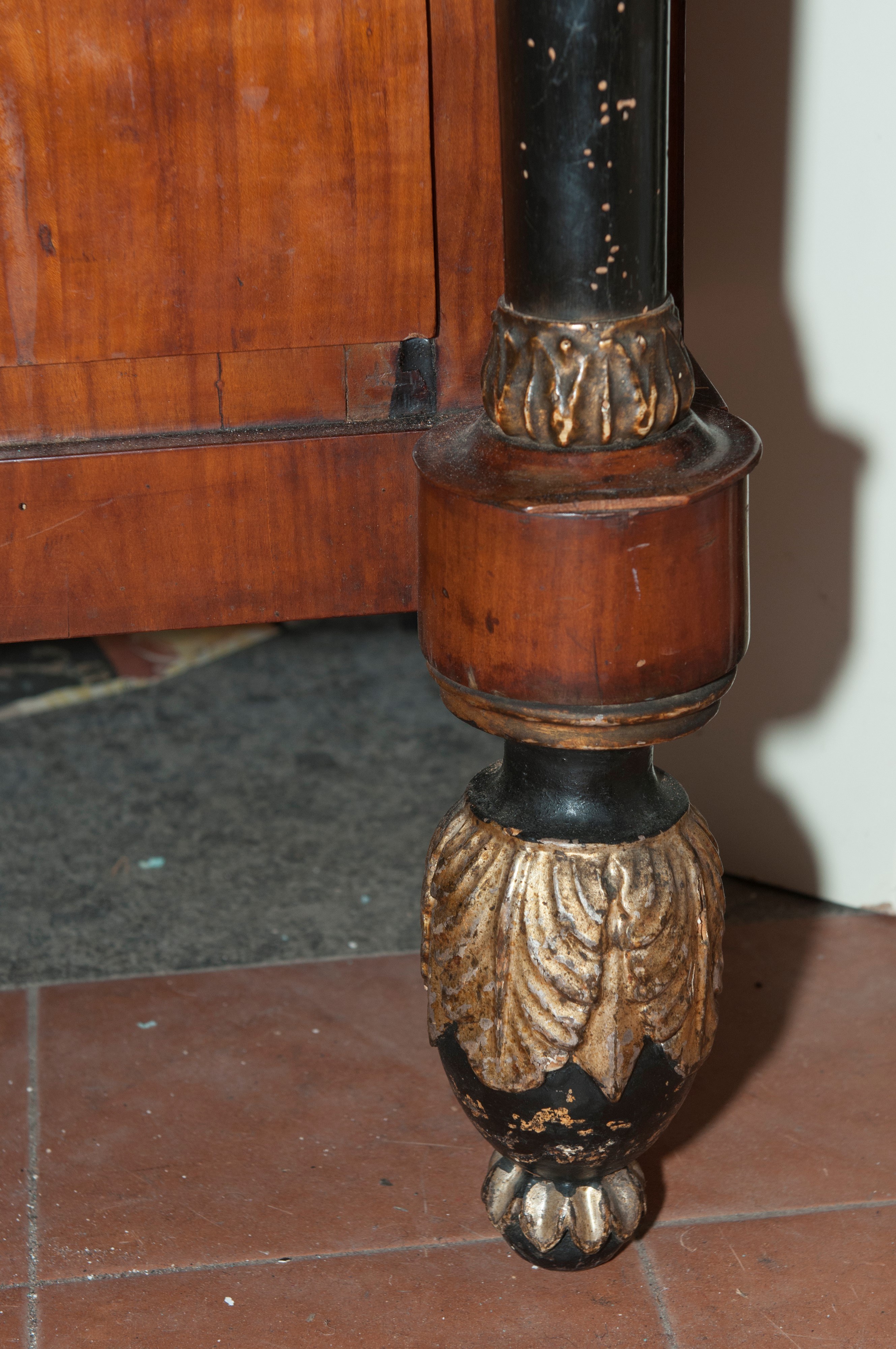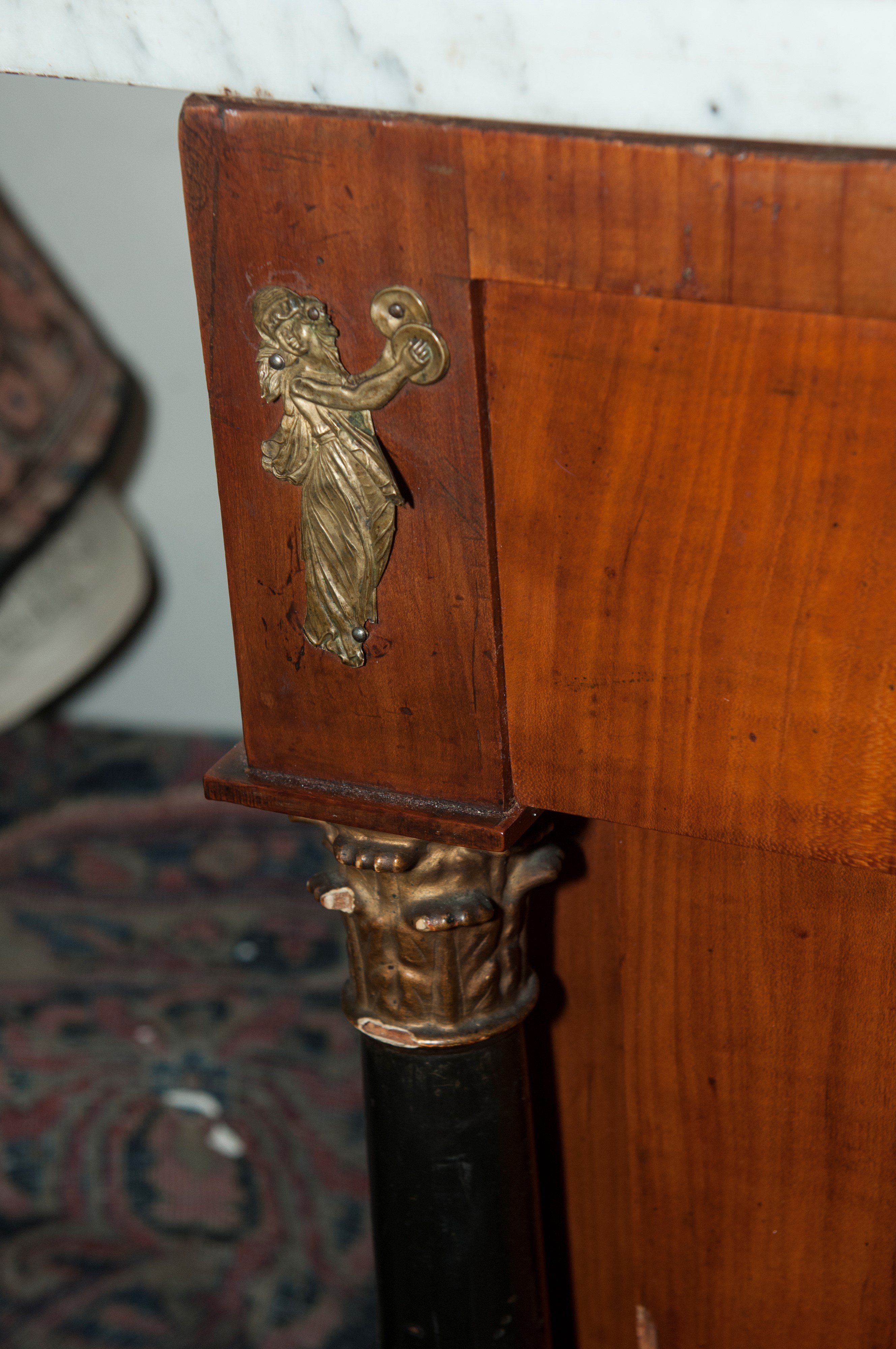 of which the thinnest one projects into the band below the rectangular white marble top. Front with slightly curved ebonized wood column supports with gilded wood bases and capitals, smooth sides, pear-shaped front feet with gilded leaves, straight rear feet.