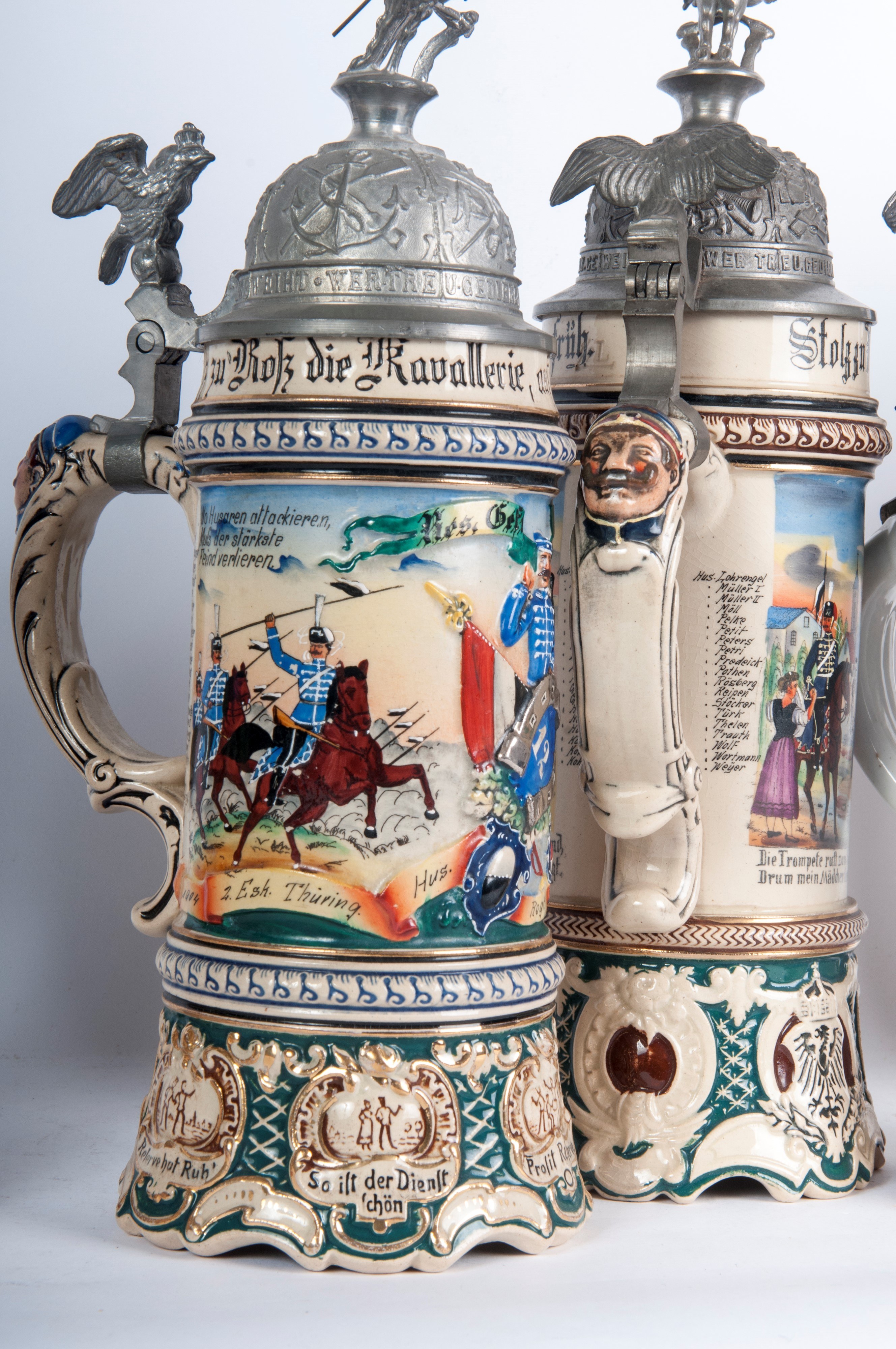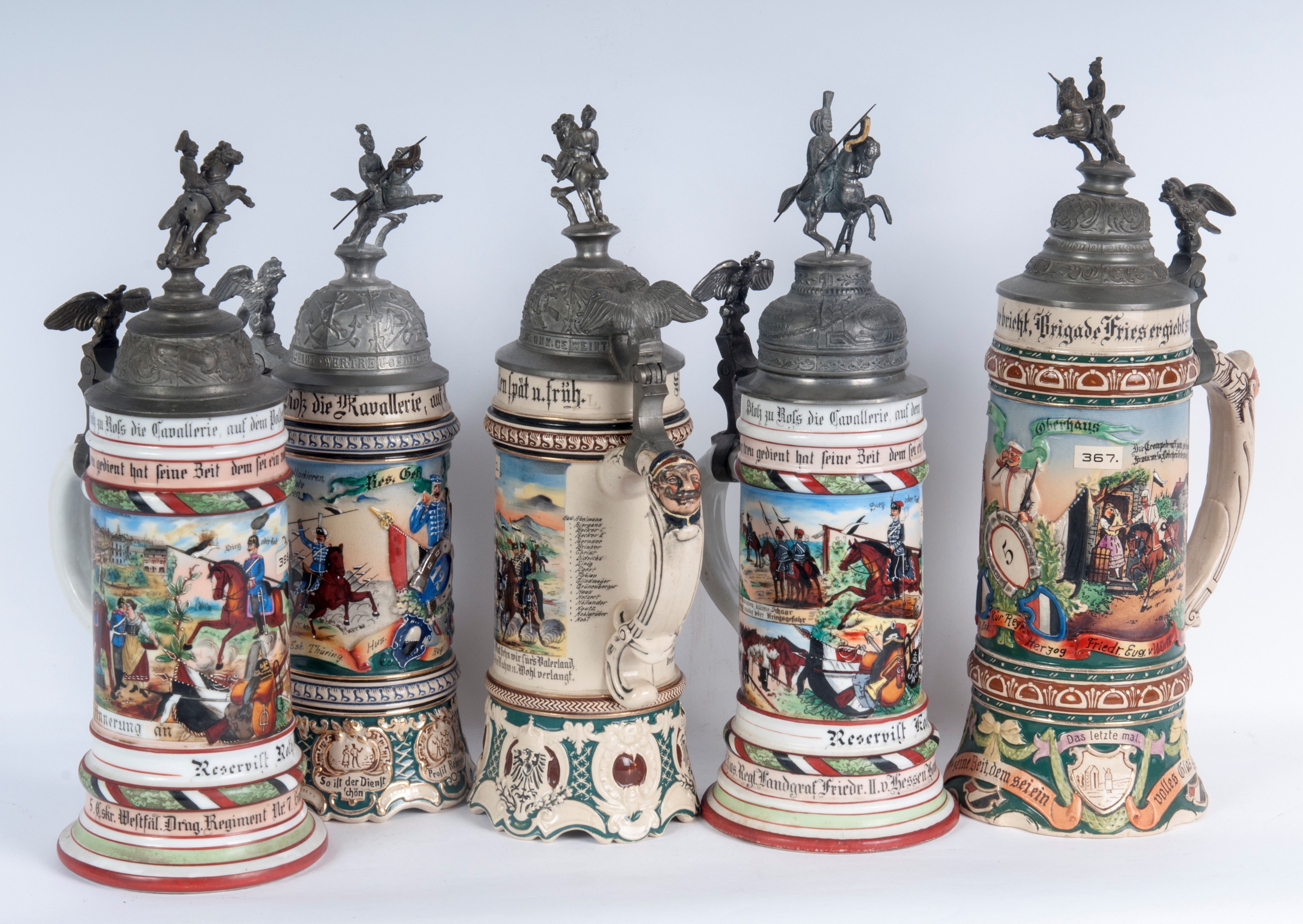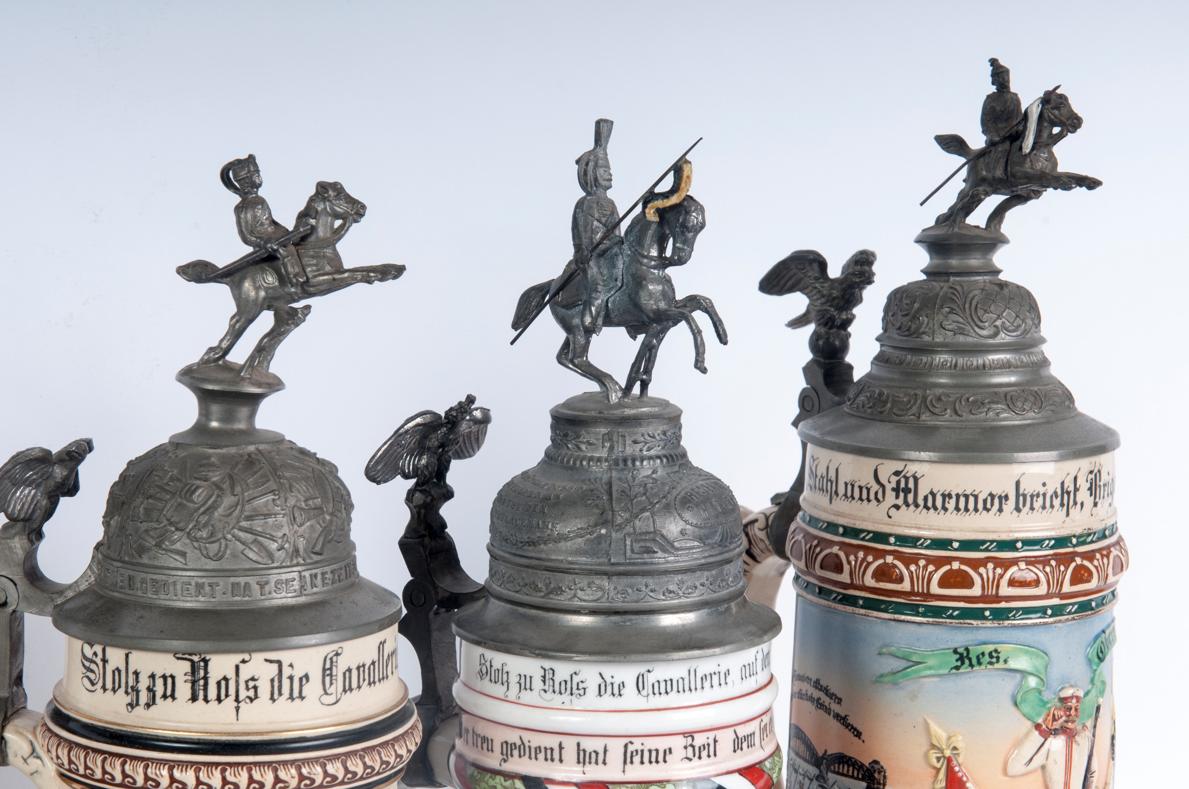 in polychrome ceramic with pewter lid surmounted by soldiers on horseback.