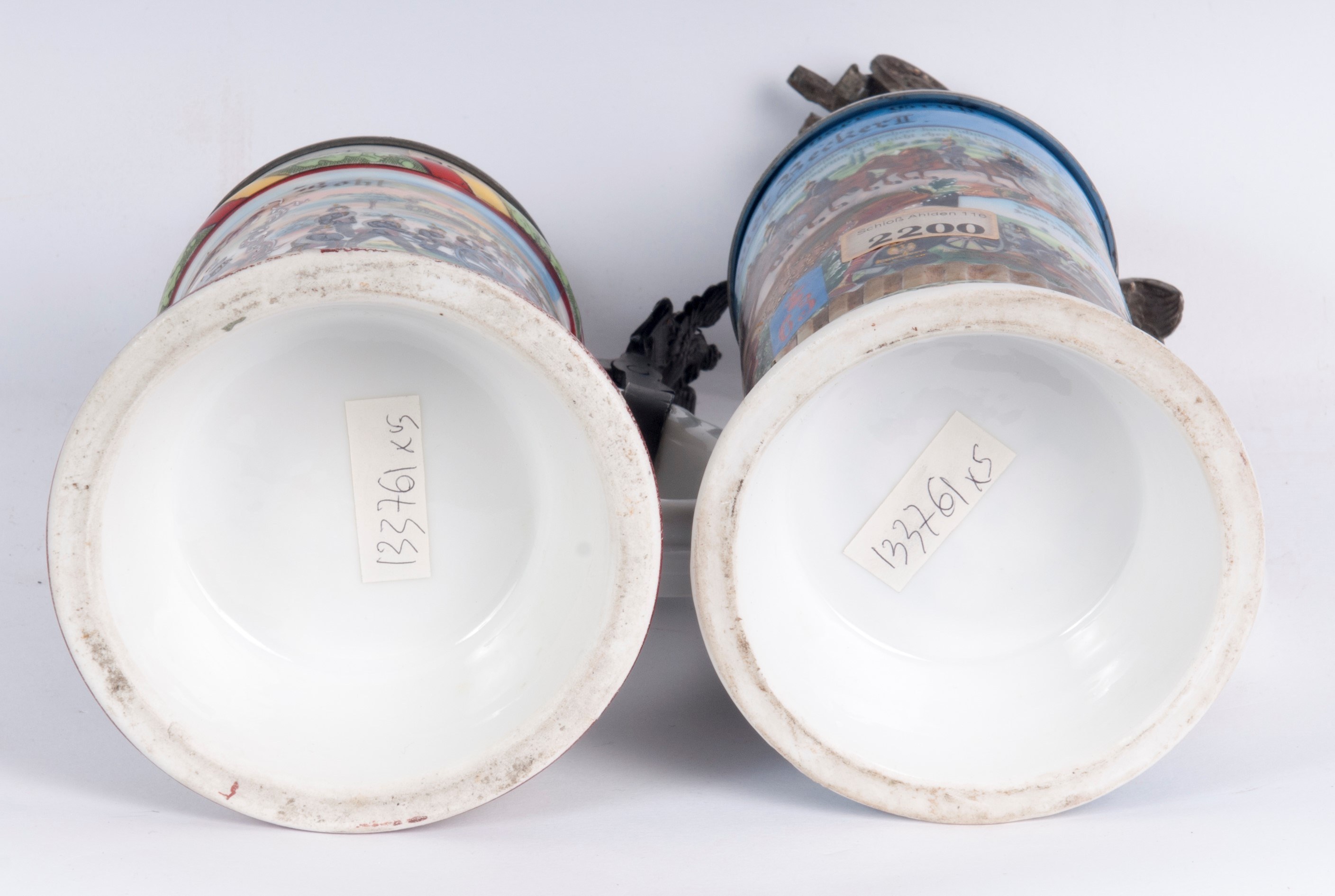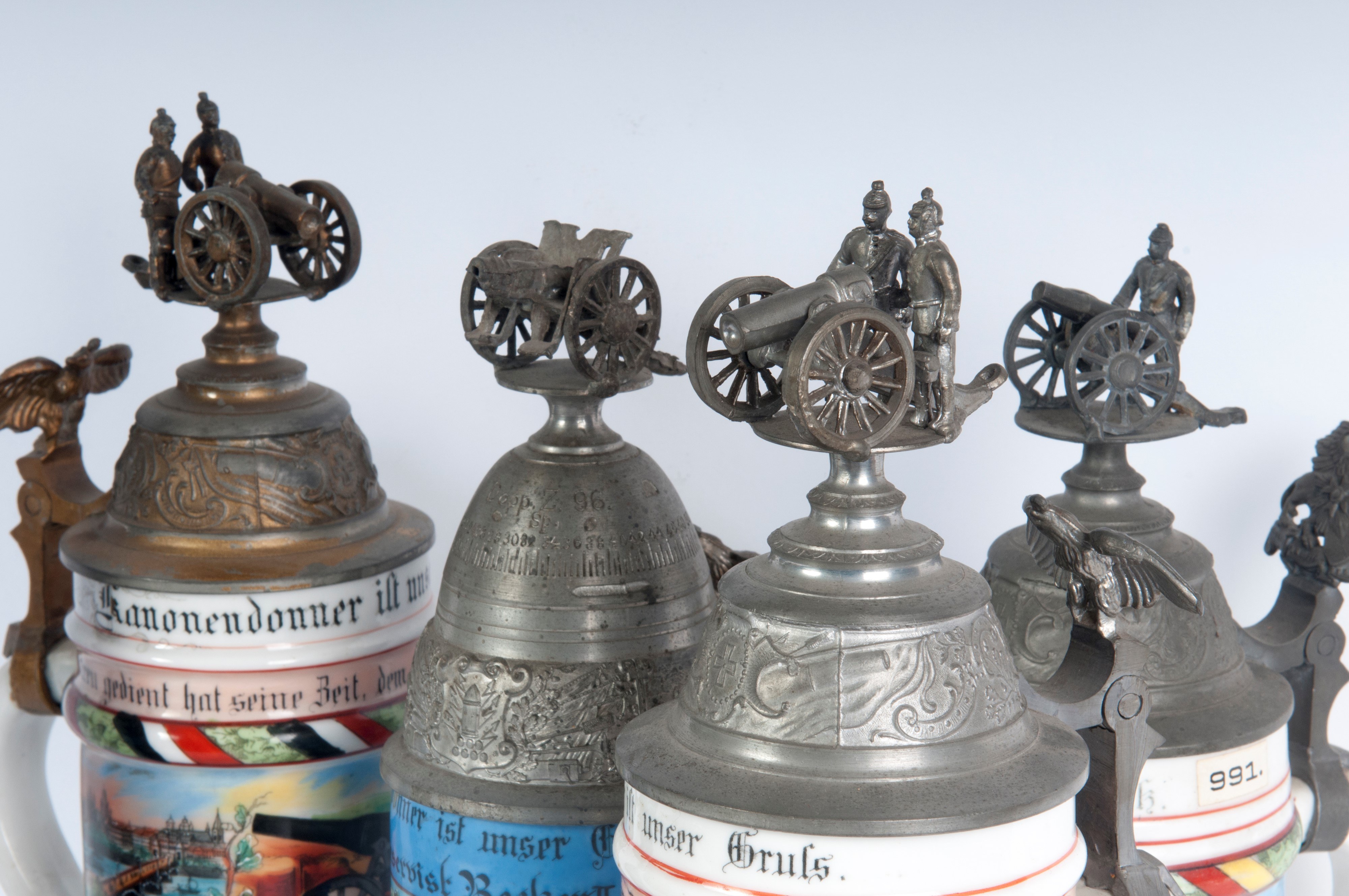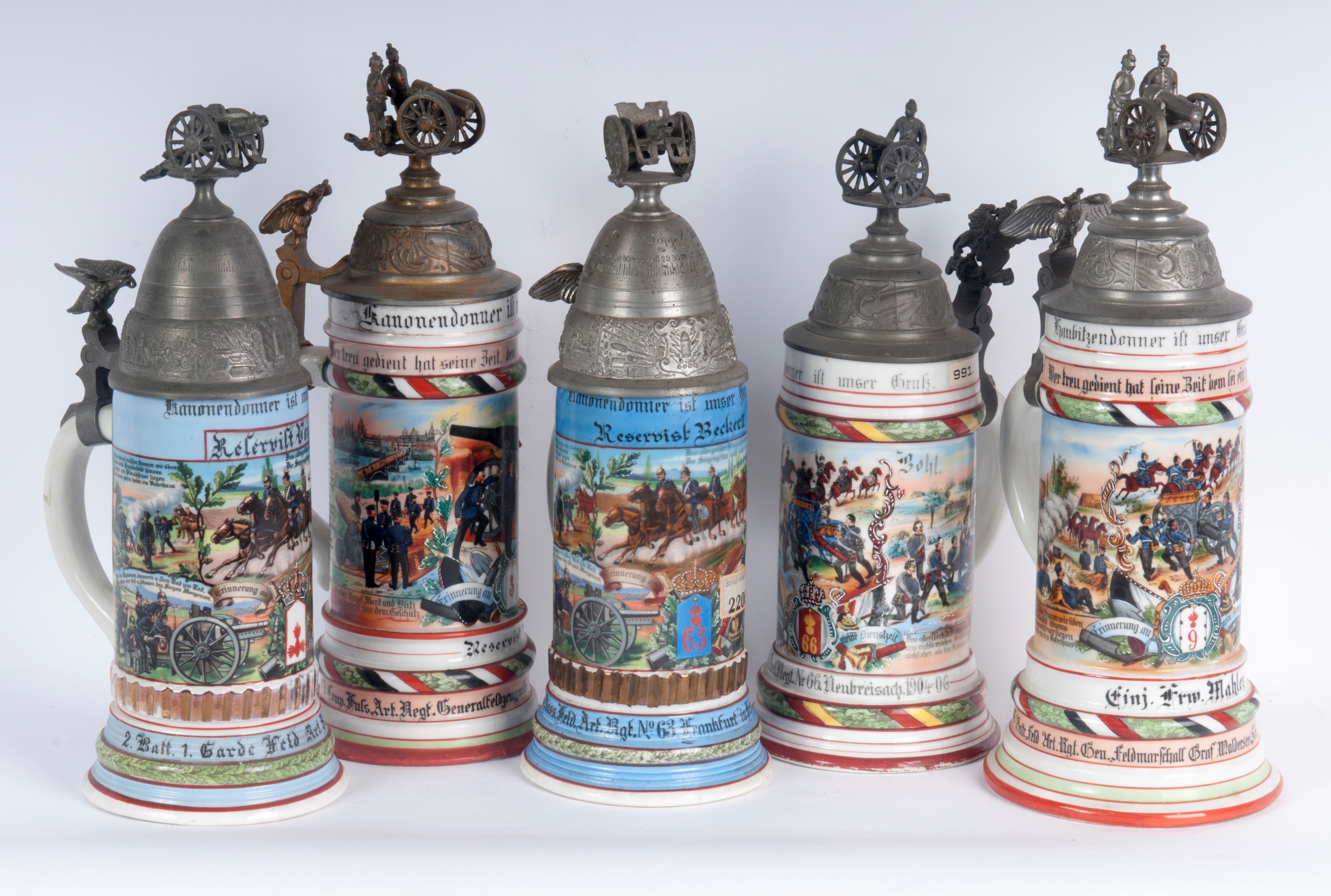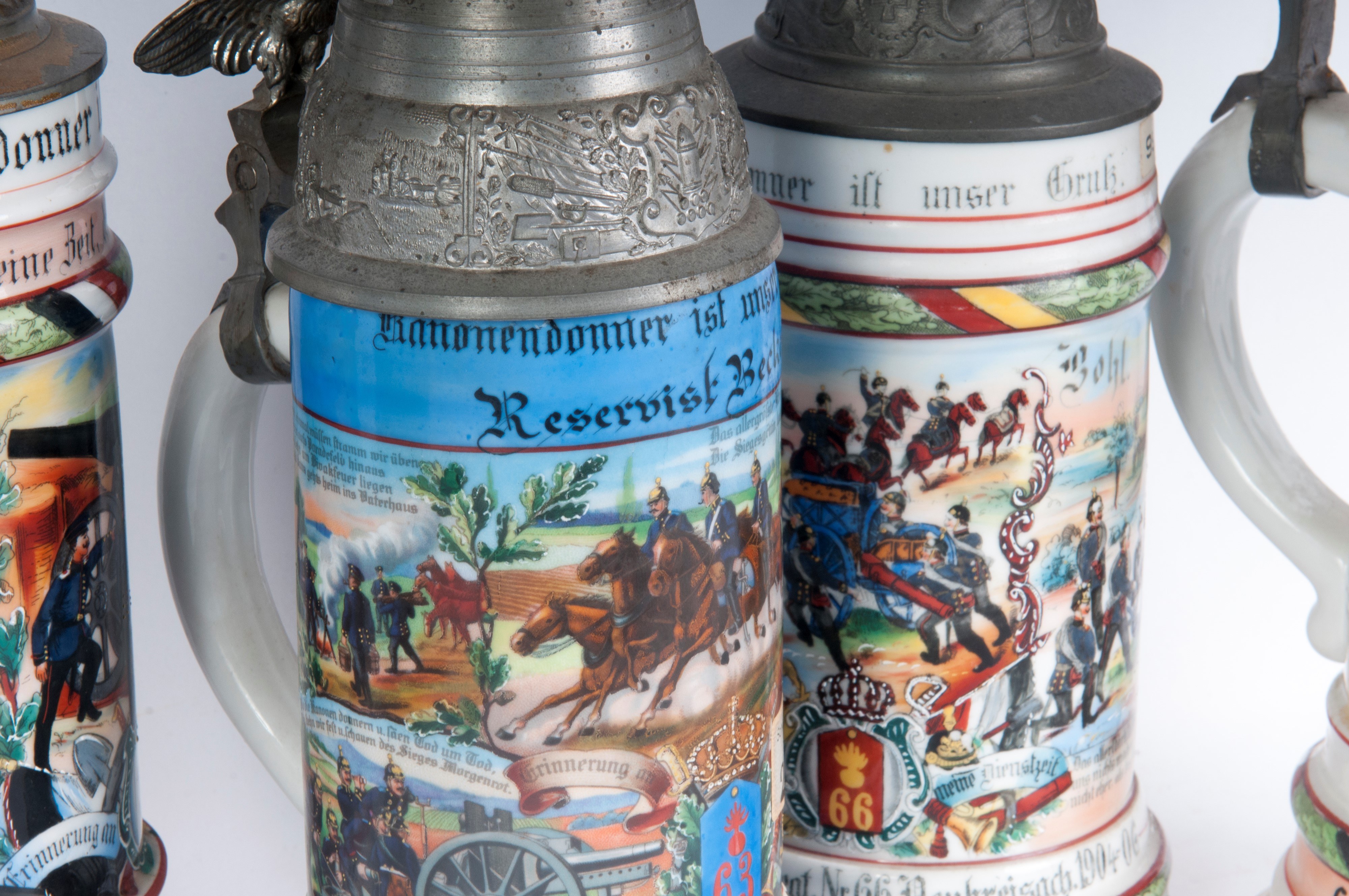 Polychrome ceramic with a pewter lid surmounted by a cannon. Decorated with the inscription of the unit and military scenes.