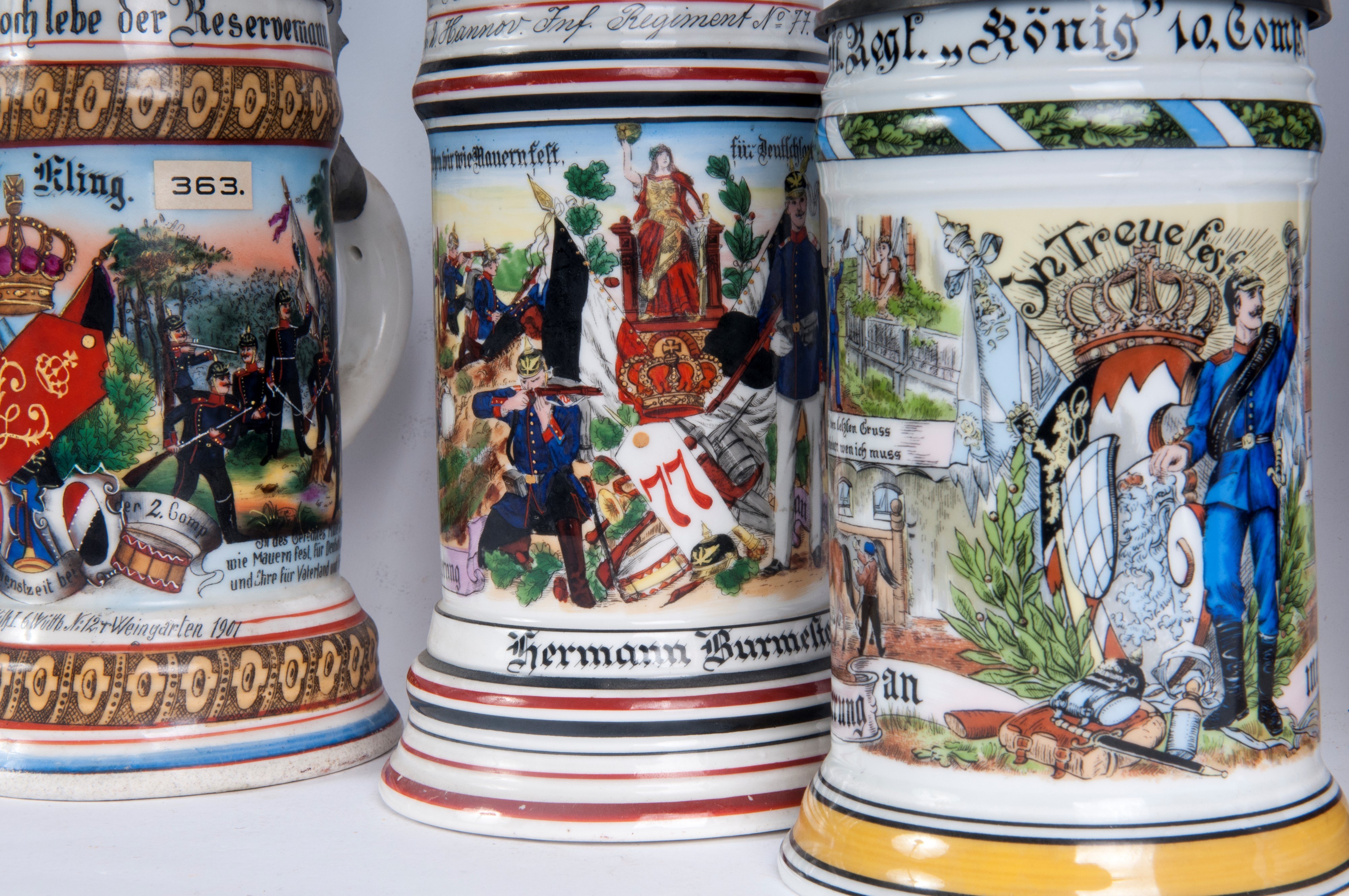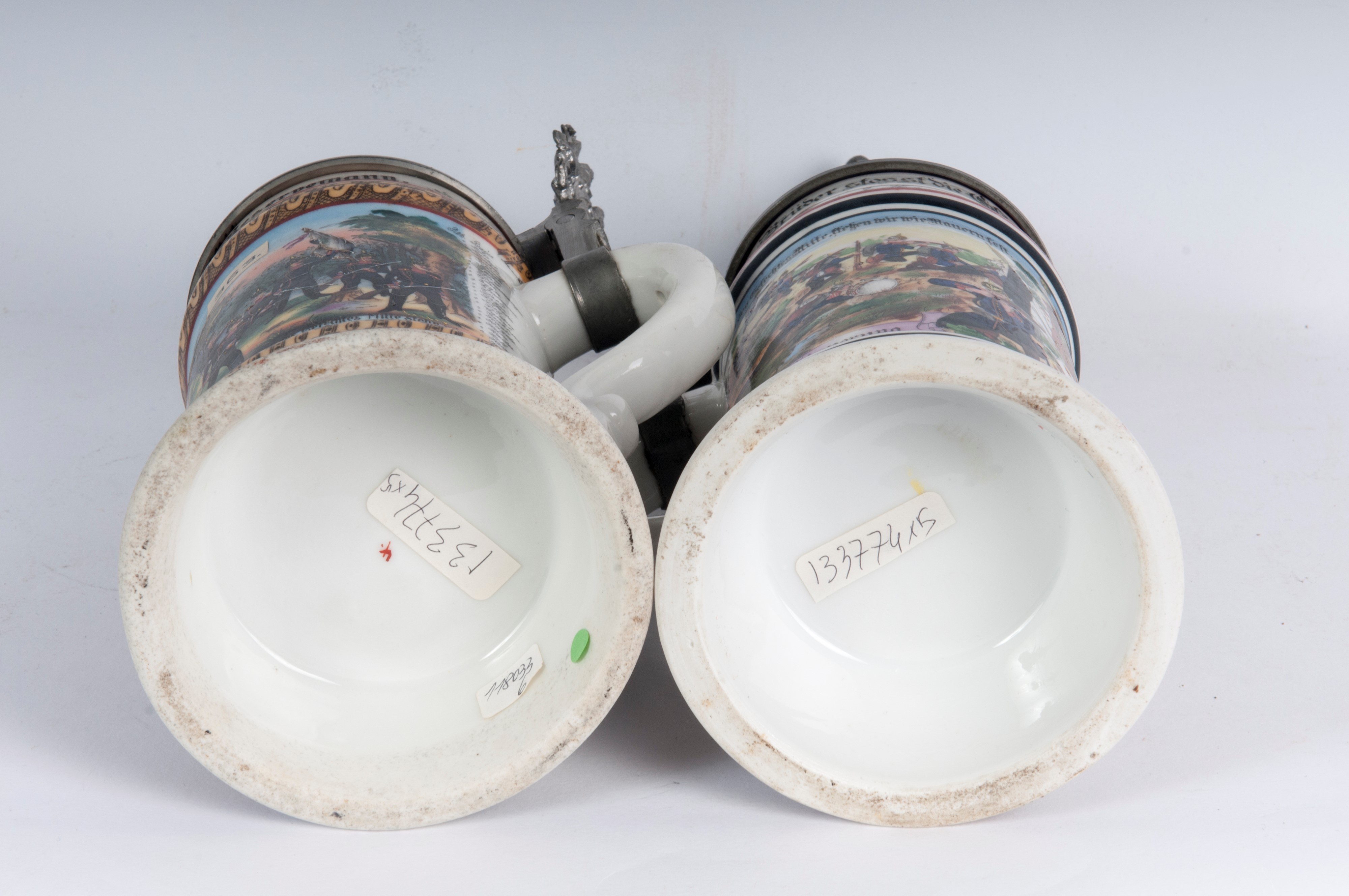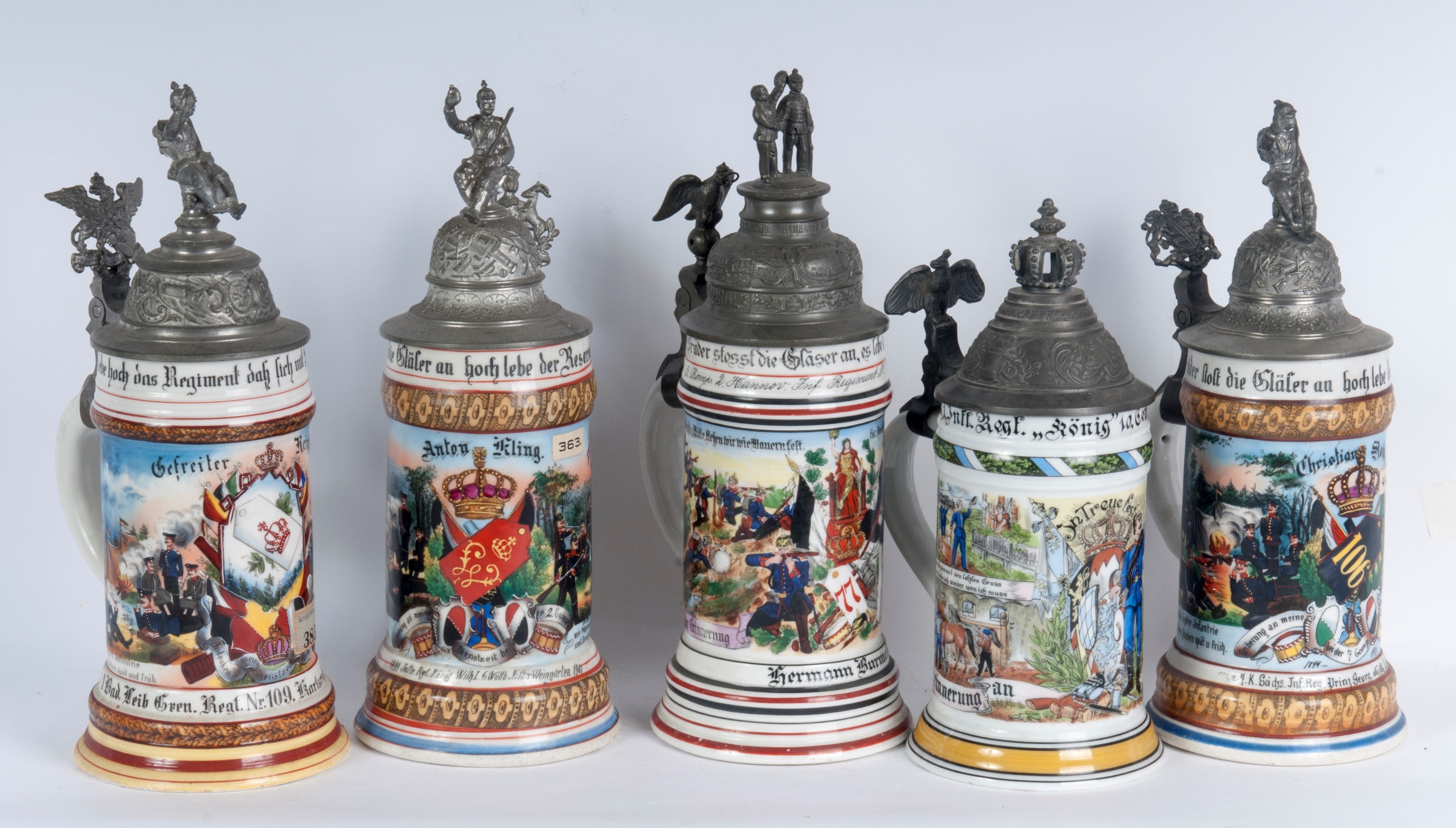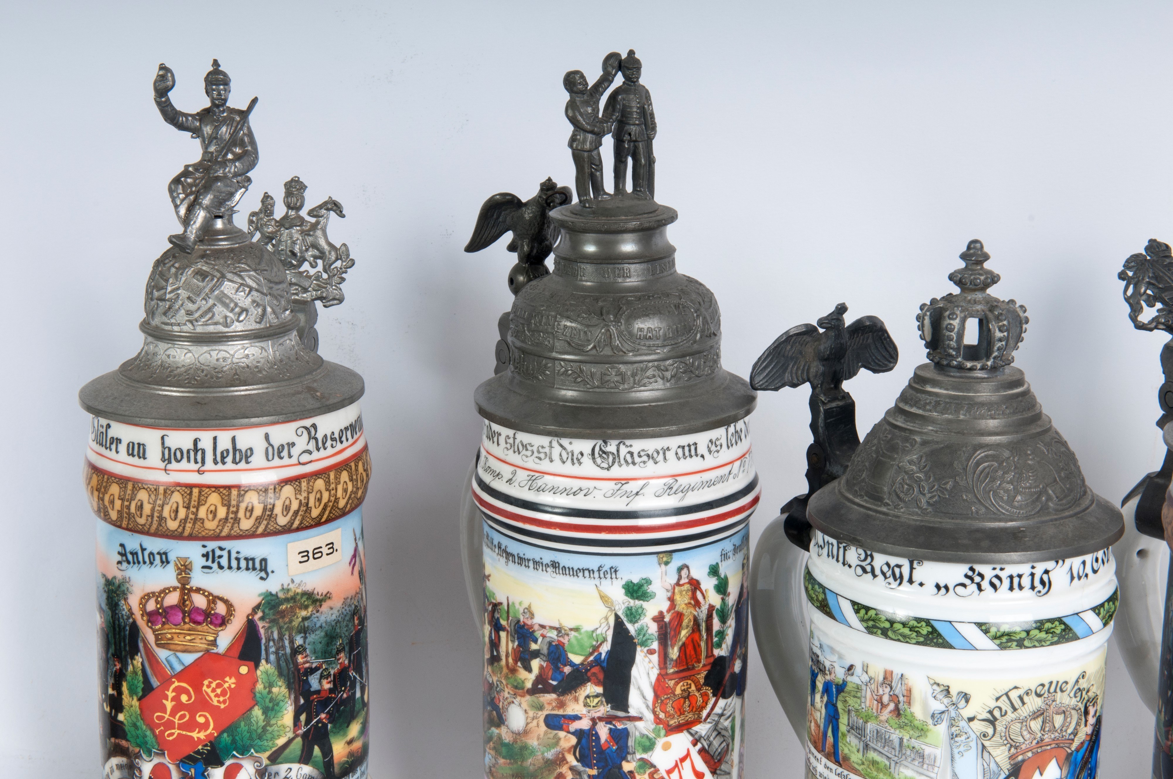 in polychrome ceramic with pewter lid, four of which are surmounted by soldiers and one by a crown.