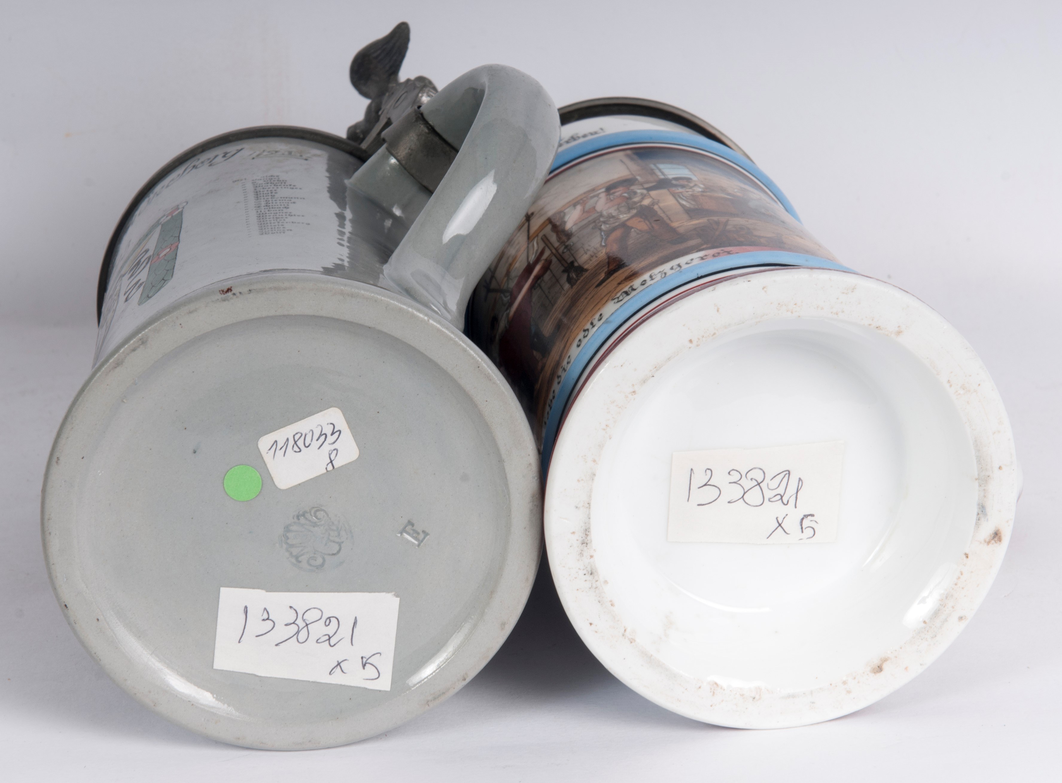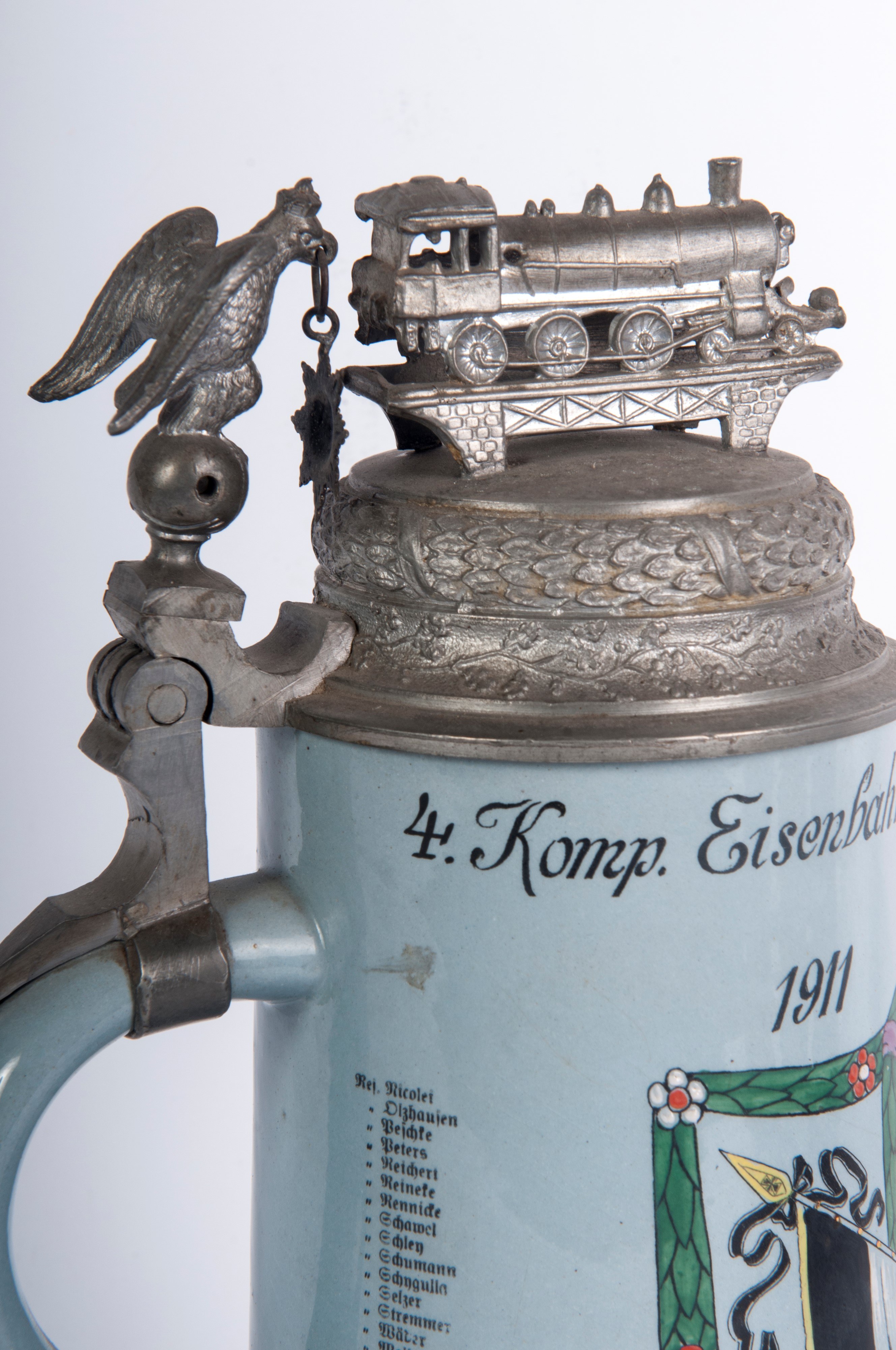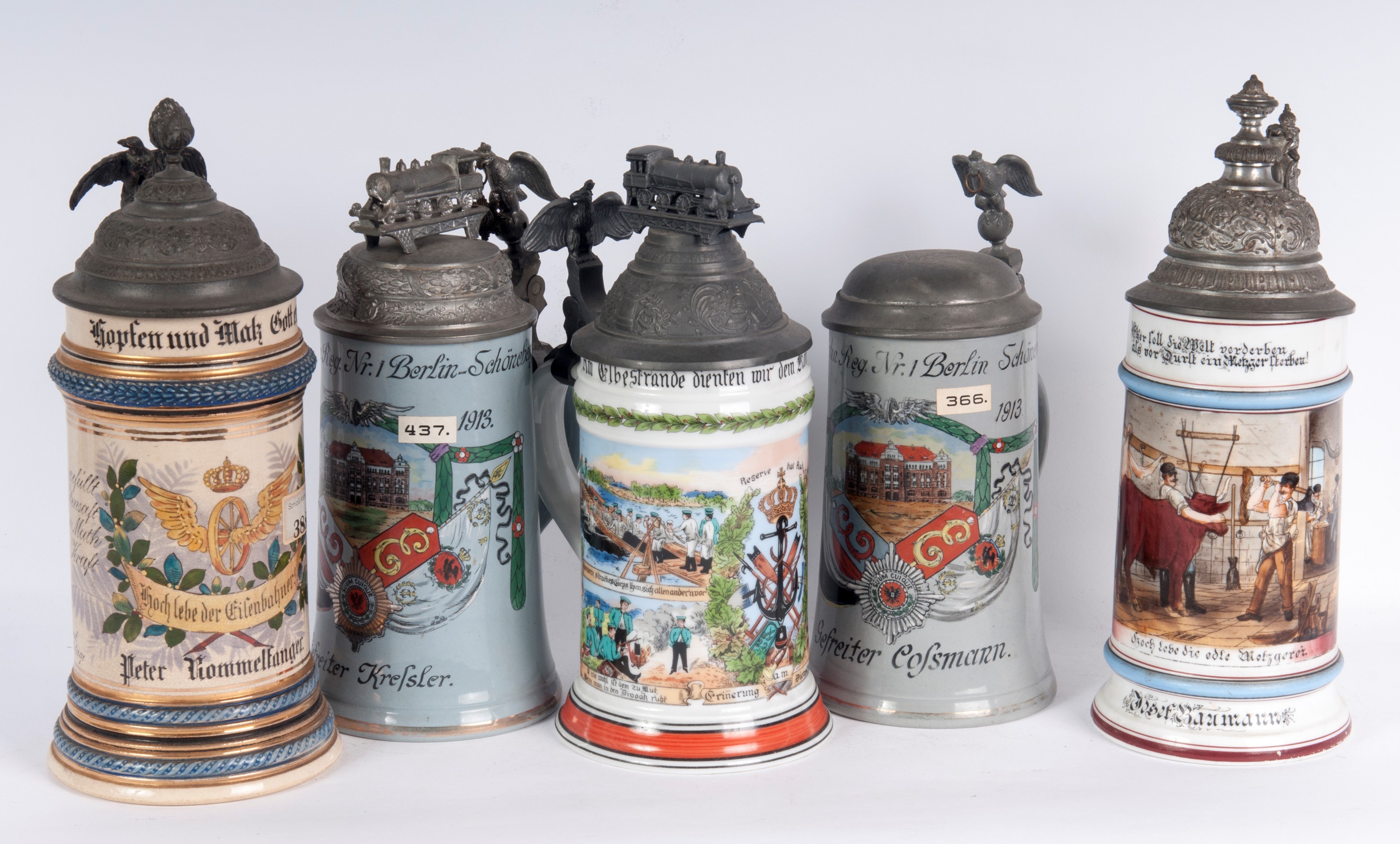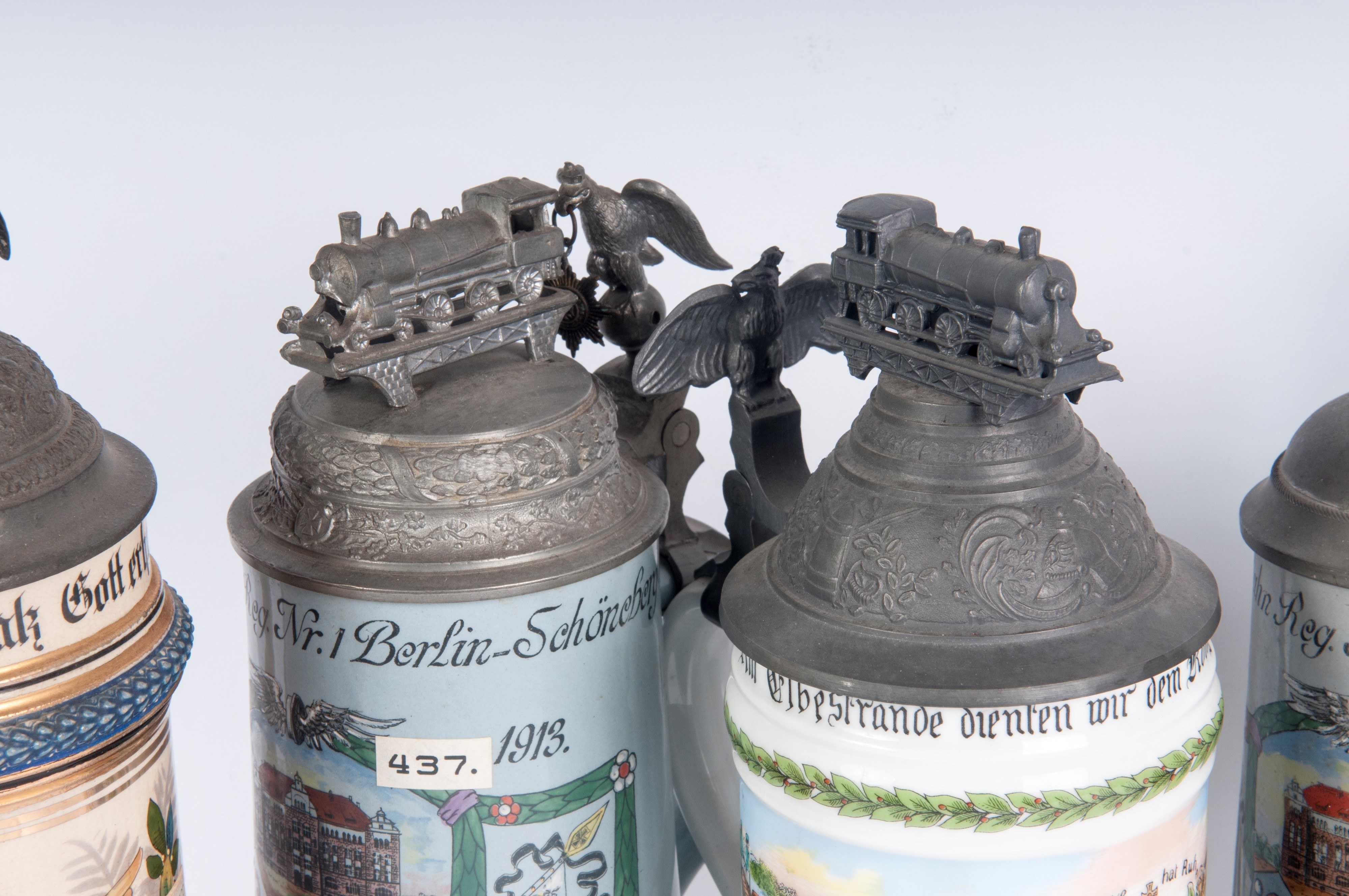 in polychrome ceramic with pewter lid, two of which are surmounted by locomotives and three with domed lids.