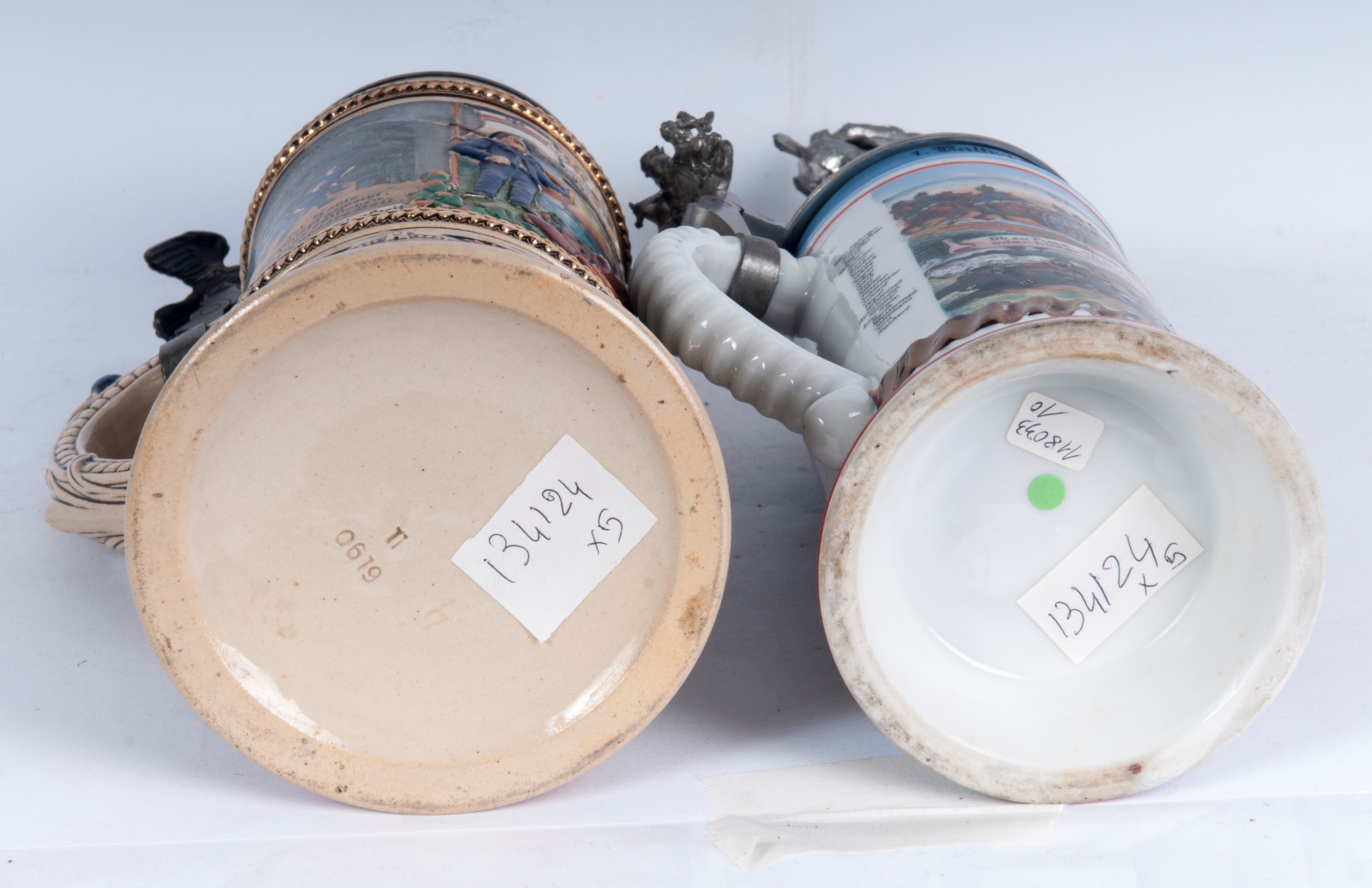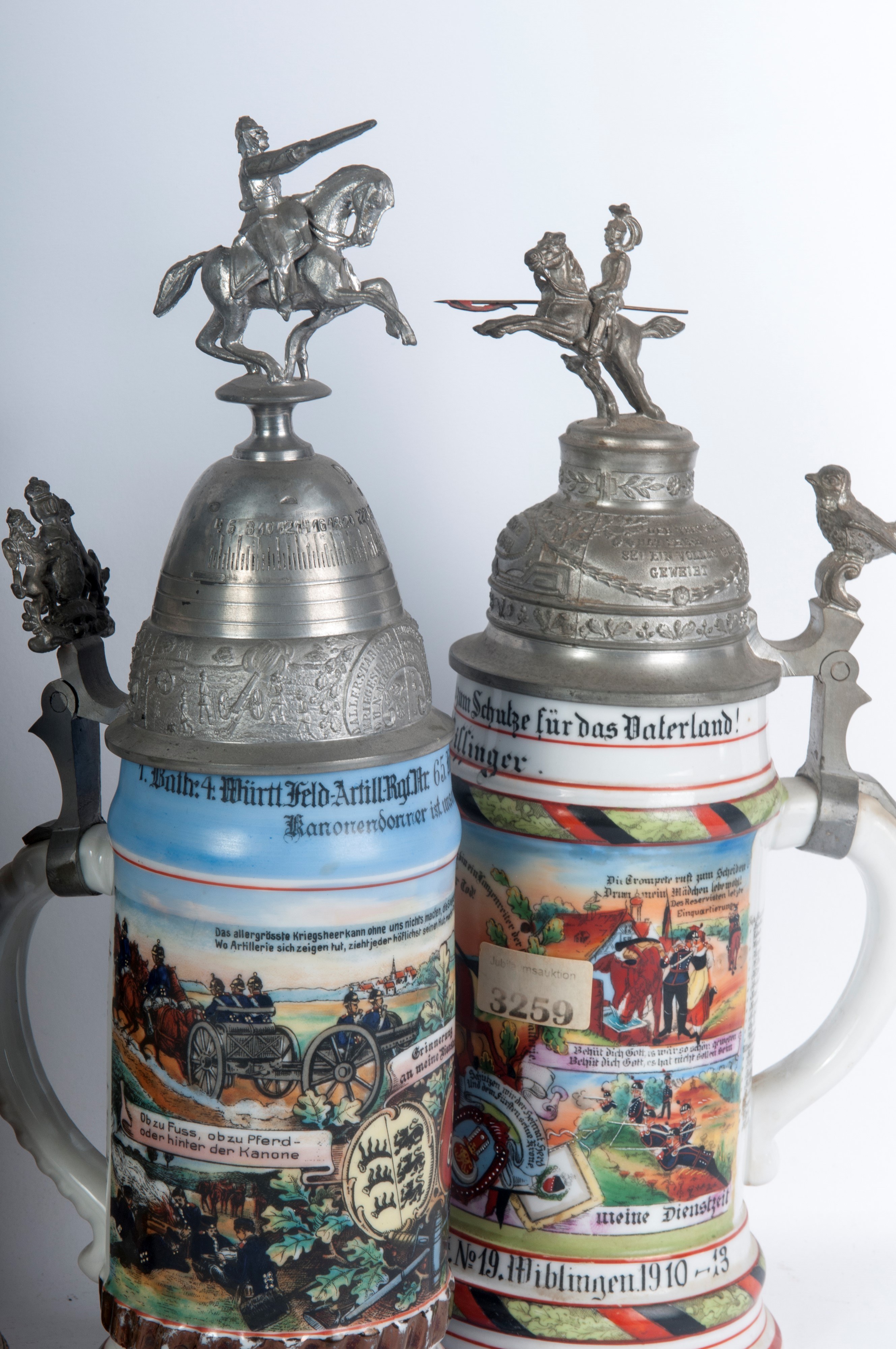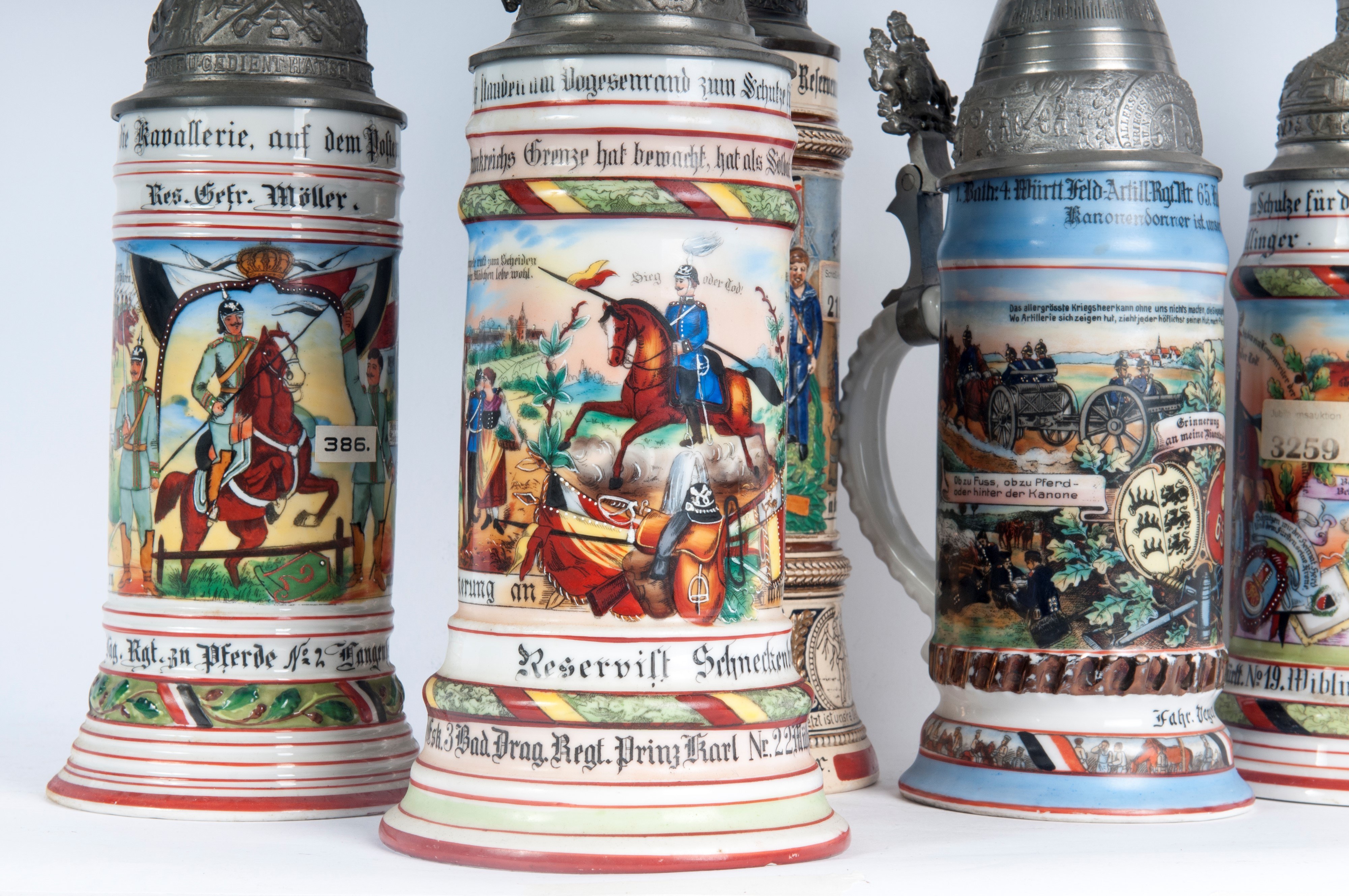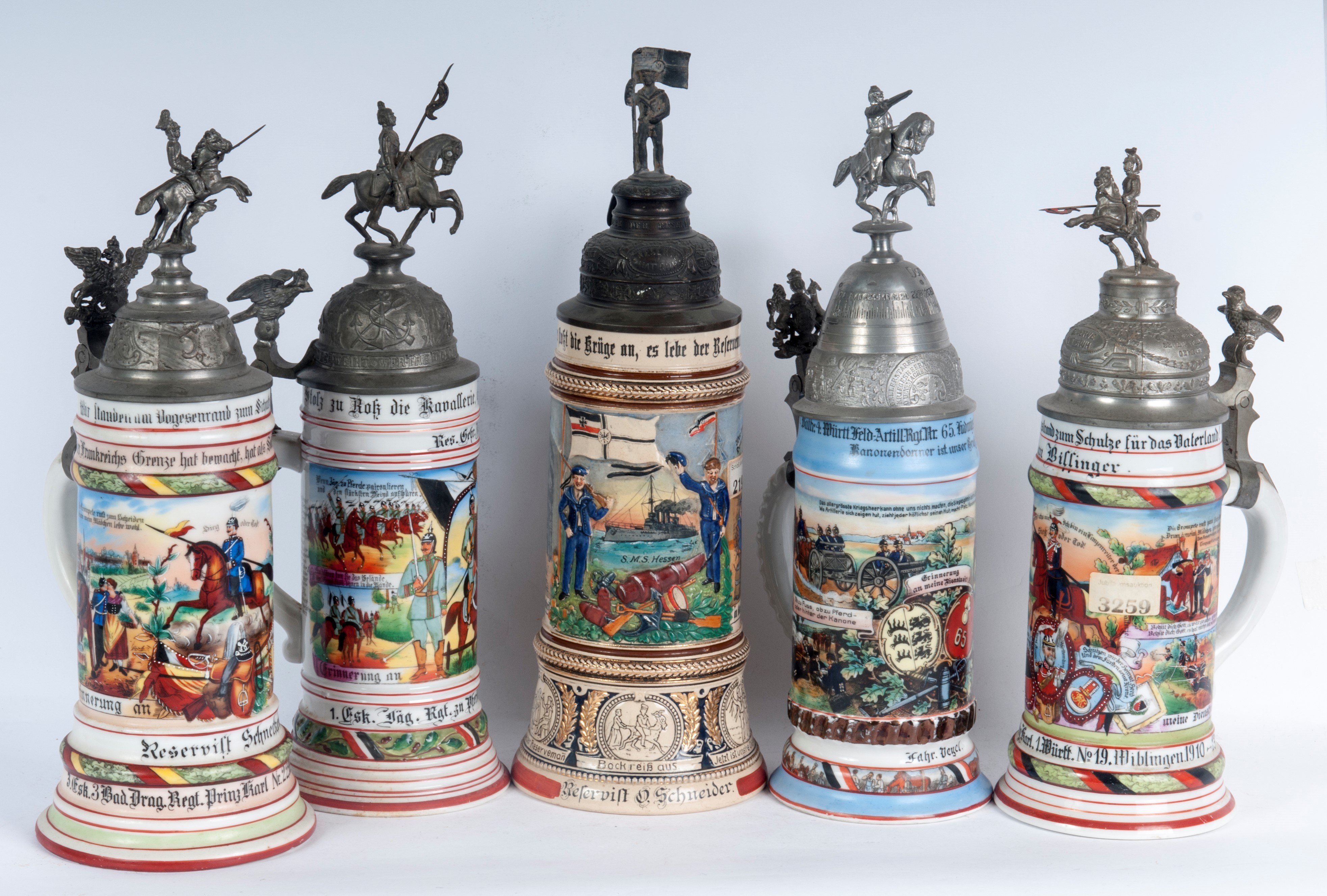 in polychrome ceramic with pewter lid, four of which with soldiers on horseback and one with a dome.