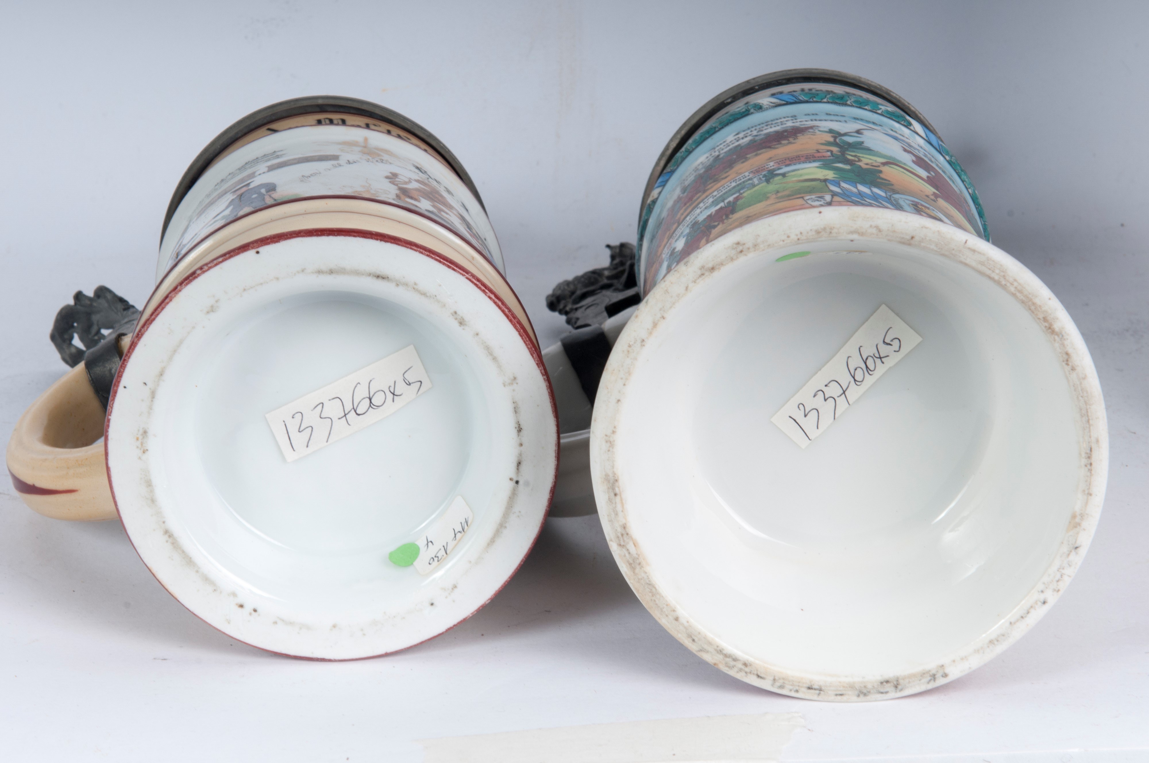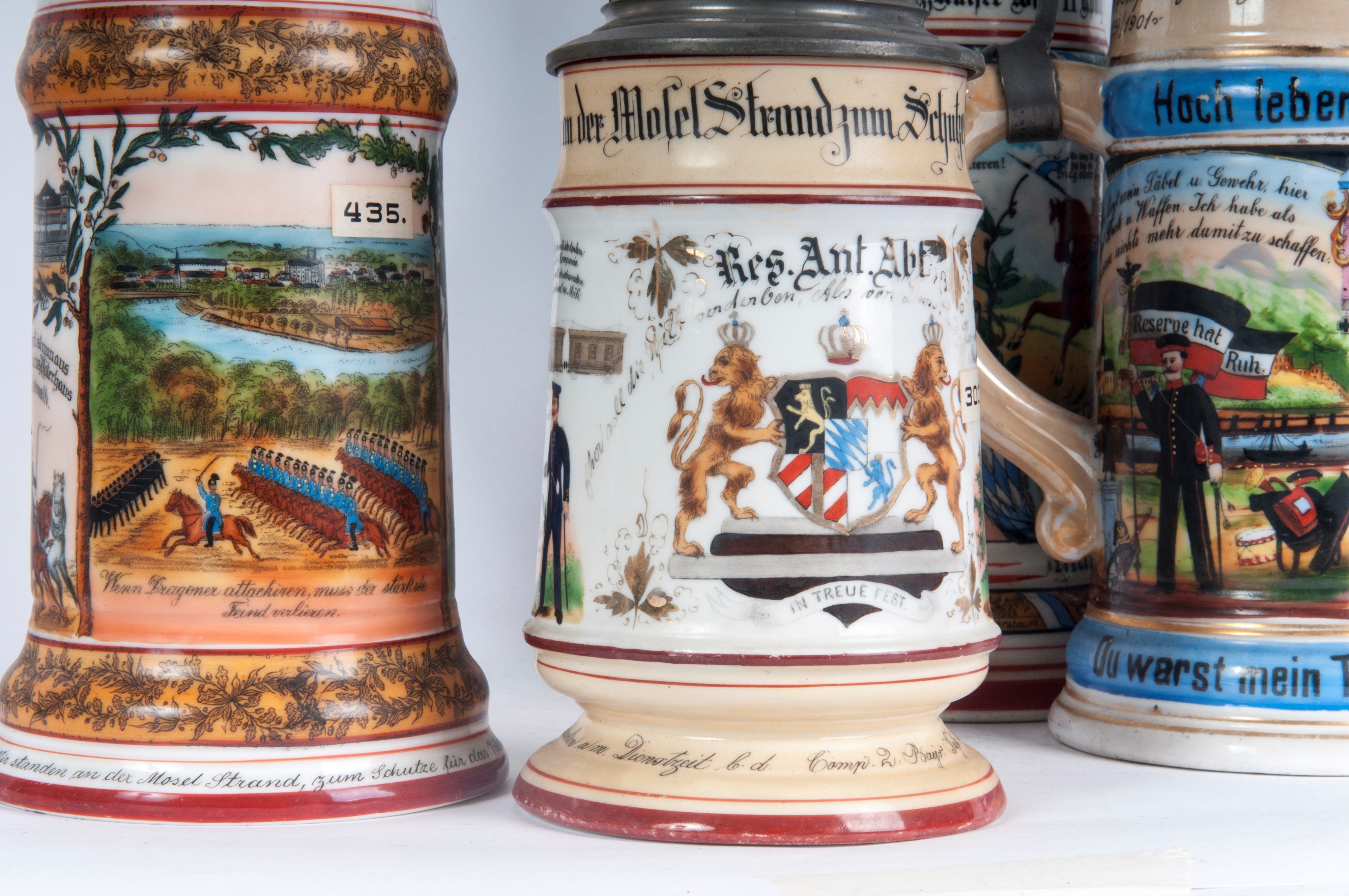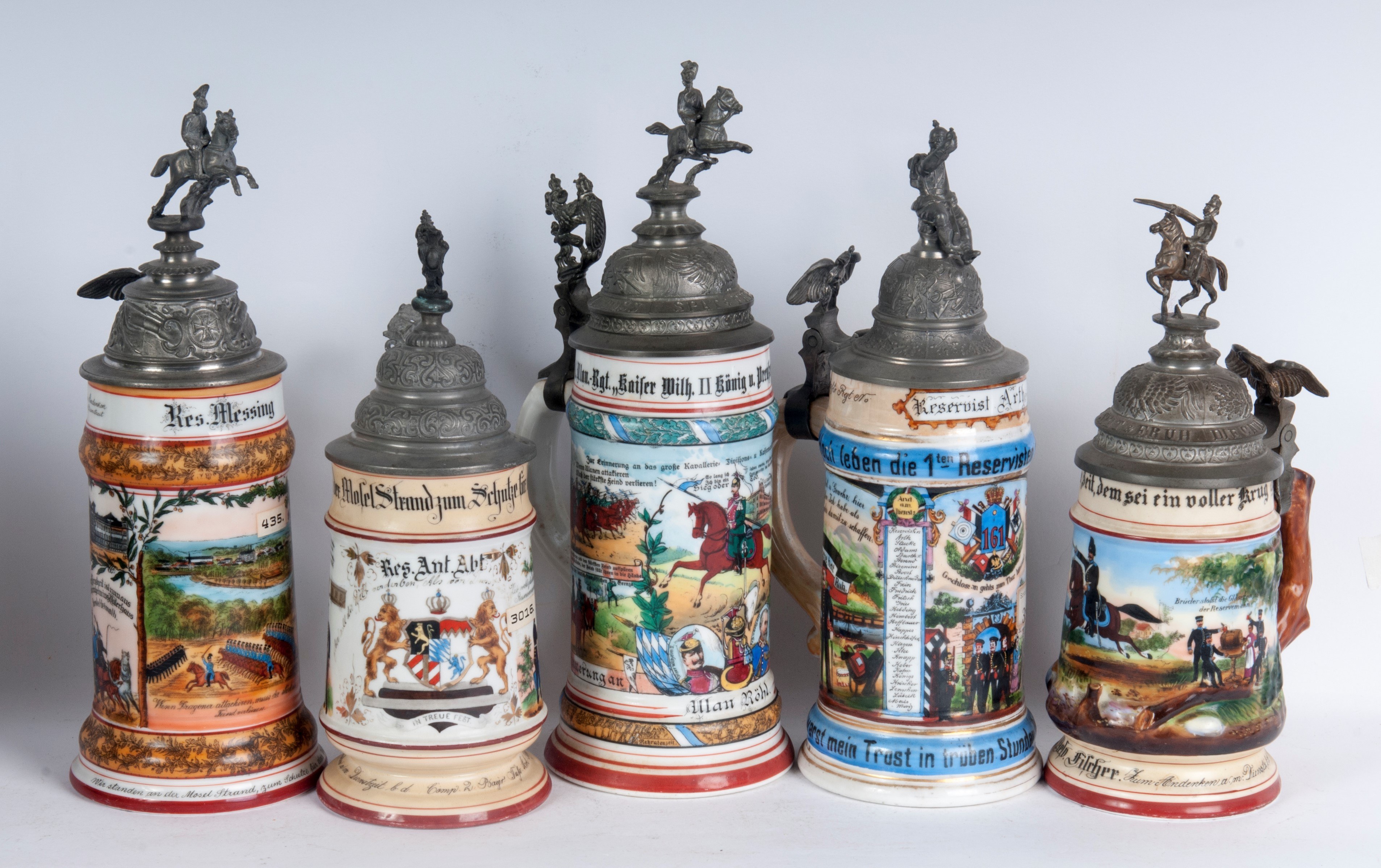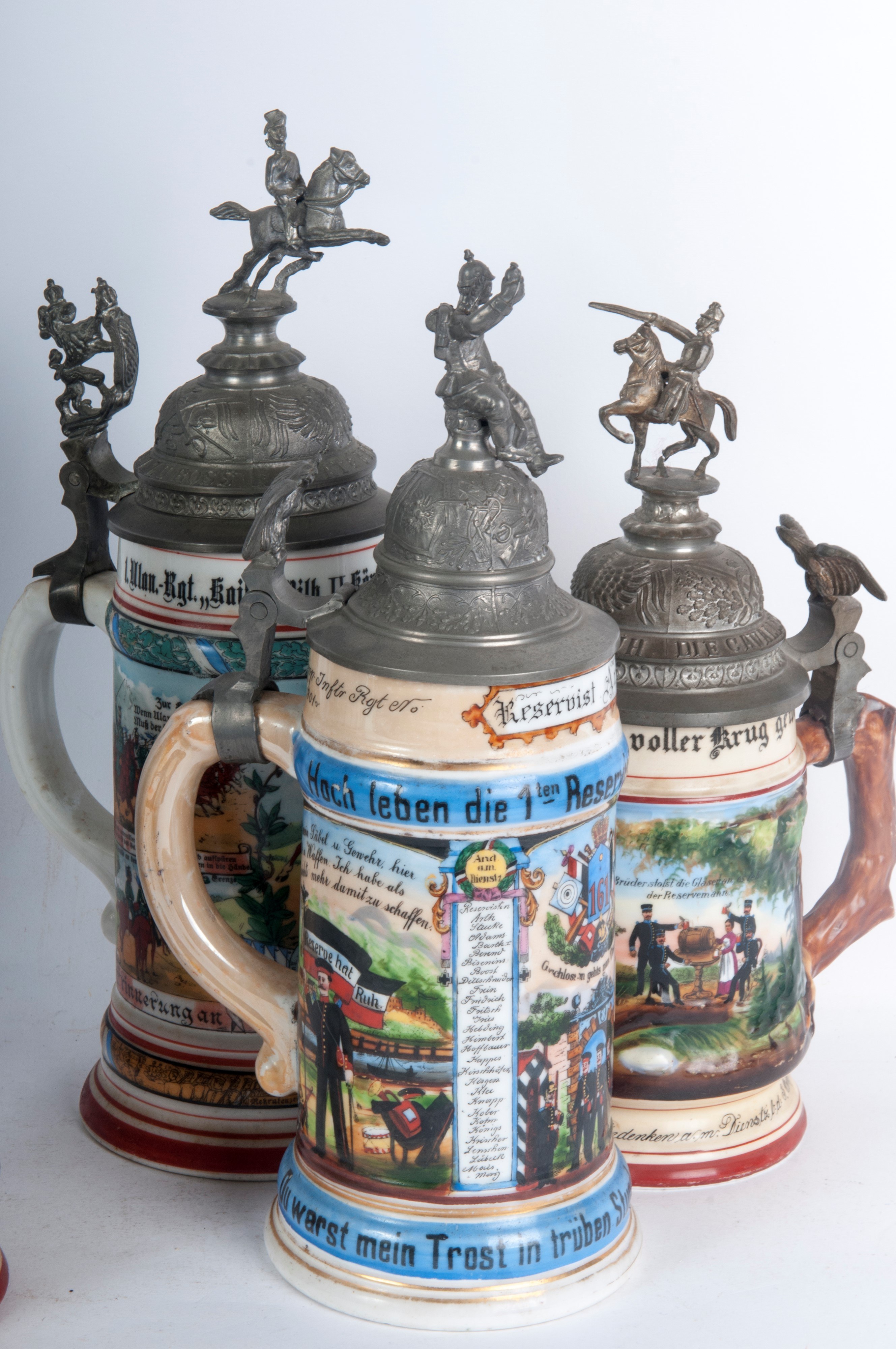 in polychrome ceramic with pewter lid, three of which are surmounted by knights, one by a soldier and one by a lion