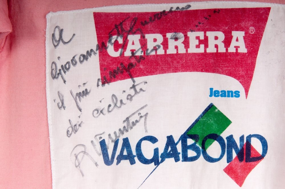 Castelli short-sleeved race jersey. On the front, the Giro's commercial sponsors are Gazzetta dello Sport, Carrera Jeans, and Vagabond, with a dedication and autograph.