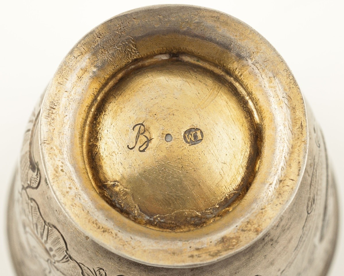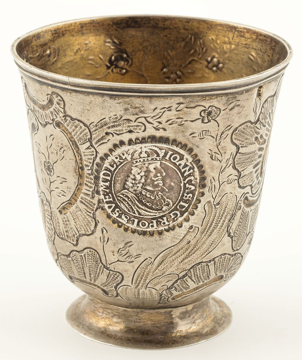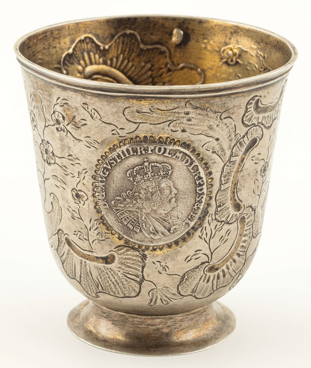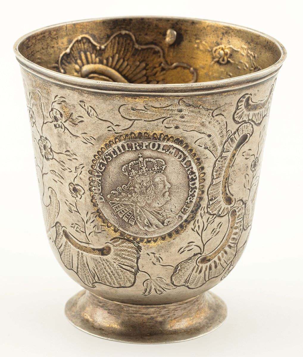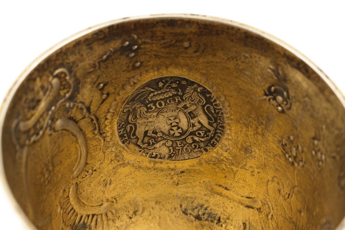 ROKOKOWY KUBEK Z MONETAMI, Polska, Toruń, Johann Samuel Meschke (Möschke) (?), po 1762, Srebro, złocenie, waga 146,84 g, wys. 9 cm