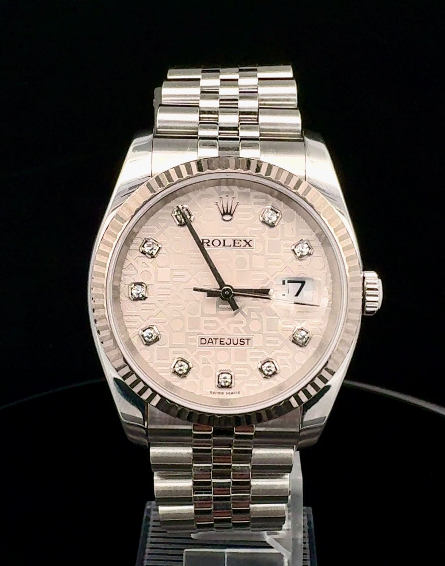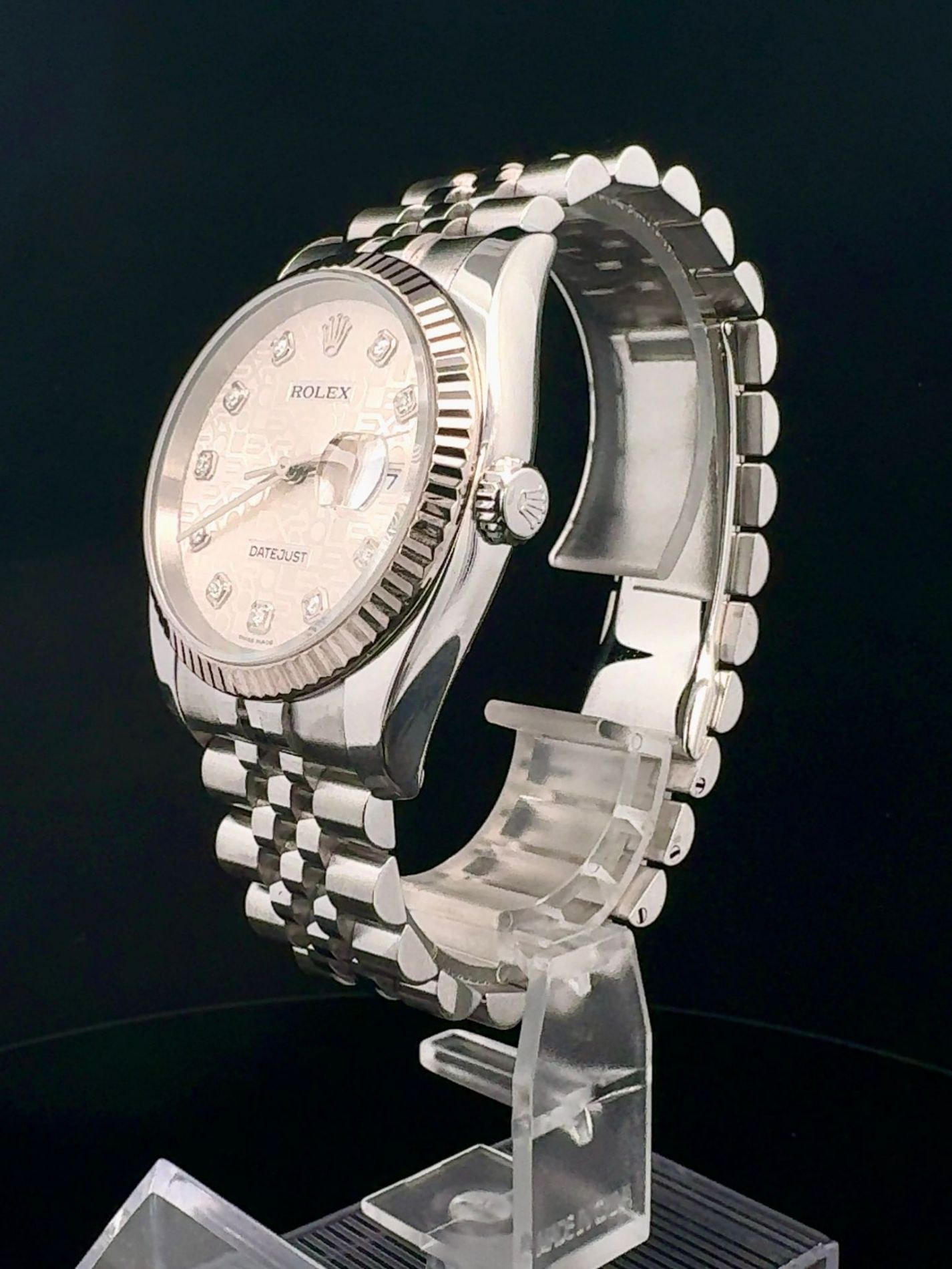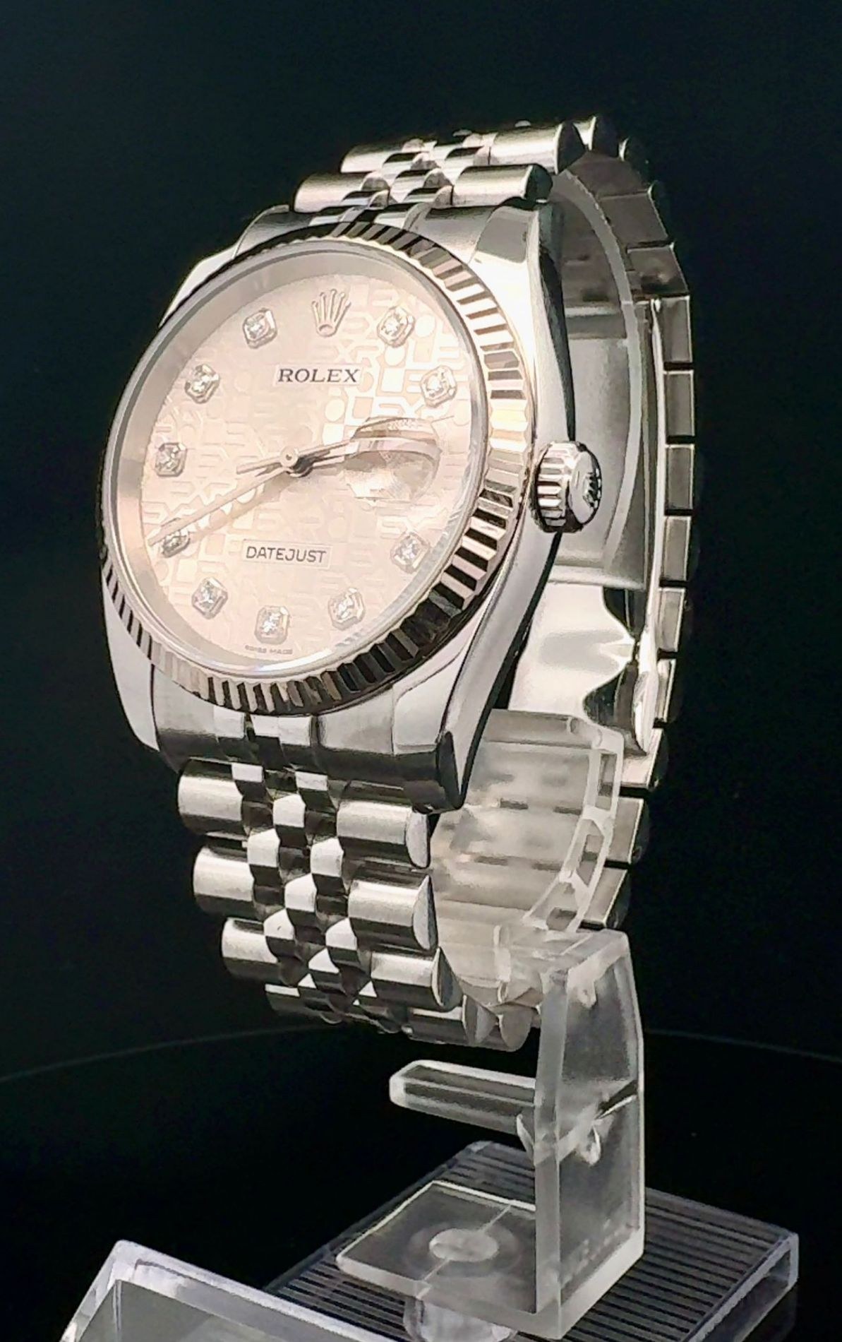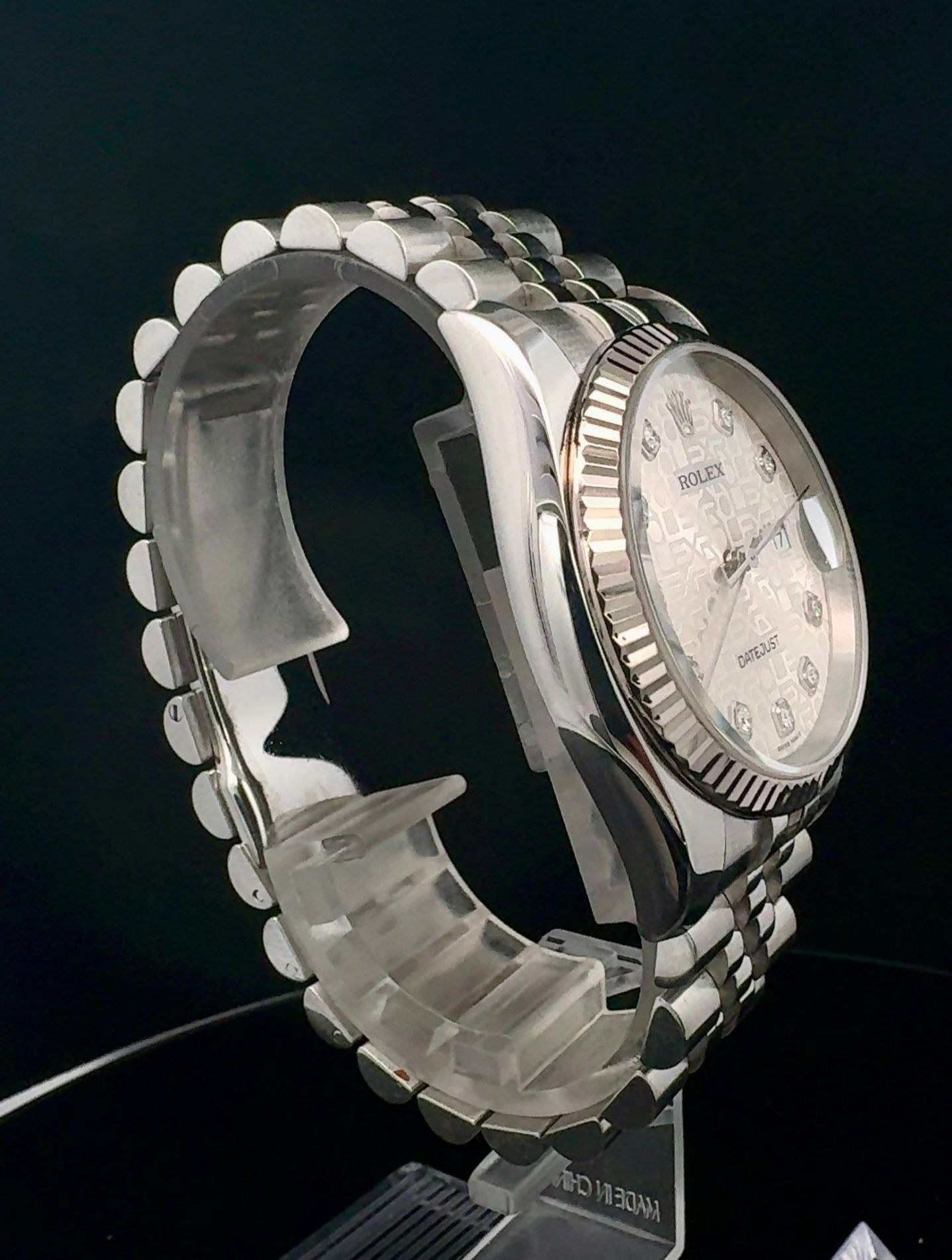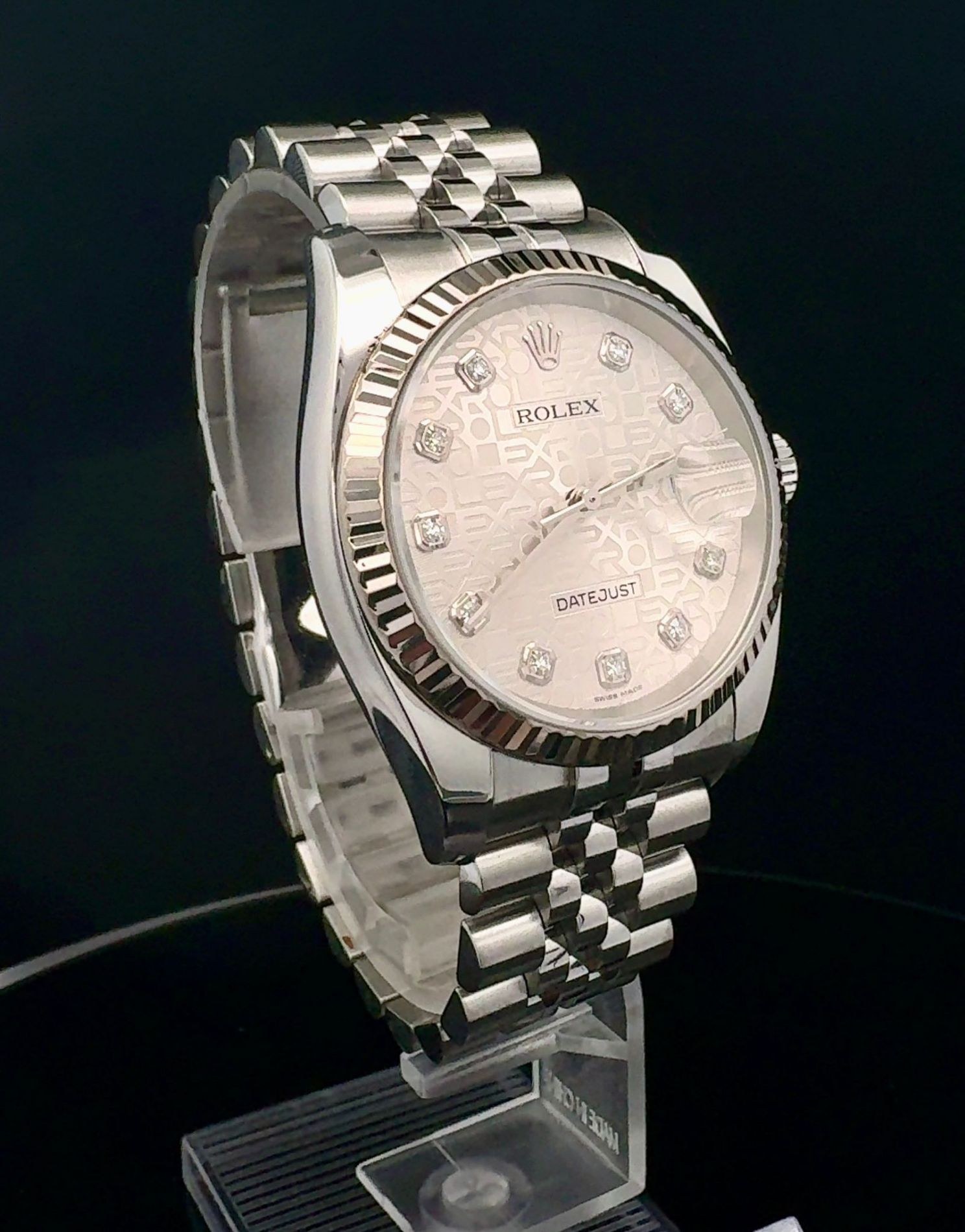 BRAND ROLEX MODEL (WATCH) DATEJUST 36 REFERENCE NUMBER 116234 MOVEMENT AUTOMATIC CASE MATERIAL STEEL STRAP MATERIAL STEEL YEAR OF PRODUCTION 2007 CONDITION USED (VERY GOOD) THE ITEM HAS SLIGHT SIGNS OF WEAR, SUCH AS LIGHT SCRATCHES, BUT NOT PERCEPTIBLE TO THE TOUCH ACCESSORIES WITH ORIGINAL PAPERS, WITHOUT ORIGINAL BOX MOVEMENT AUTOMATIC CASE CASE MATERIAL STEEL DIAMETER 36 MM WATER RESISTANT 10 ATM BEZEL MATERIAL WHITE GOLD GLASS SAPPHIRE CRYSTAL DIAL COMPUTER DIAL DIAMONDS STRAP STRAP MATERIAL STEEL STRAP COLOR STEEL CLASP MATERIAL STEEL FUNCTIONS DATE - AUCTION COMMISSION 25%