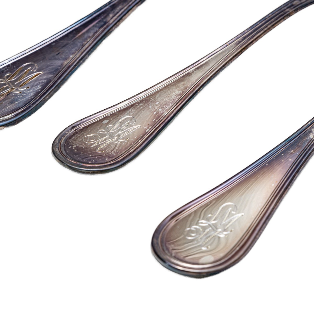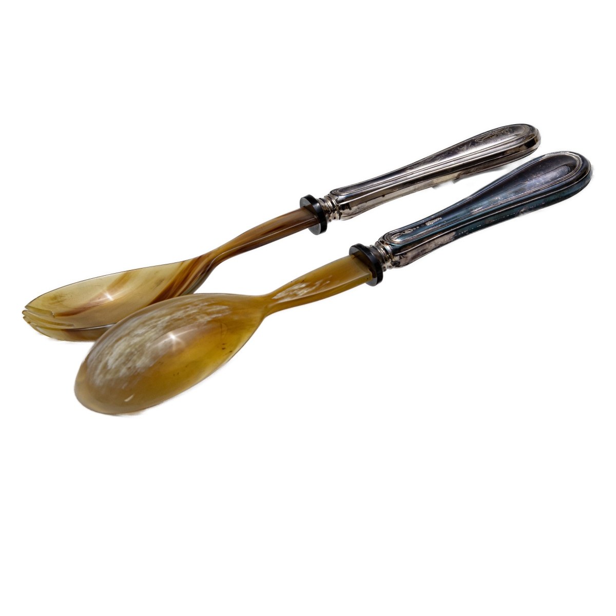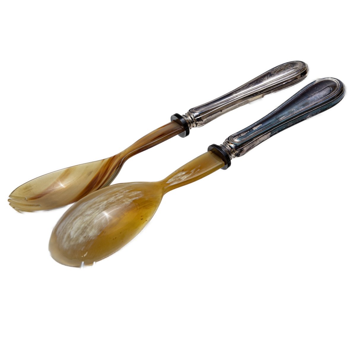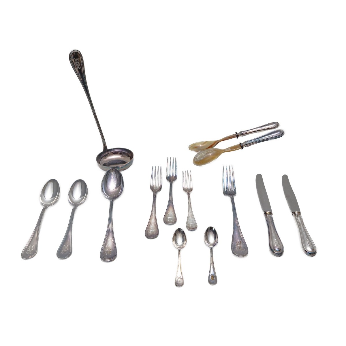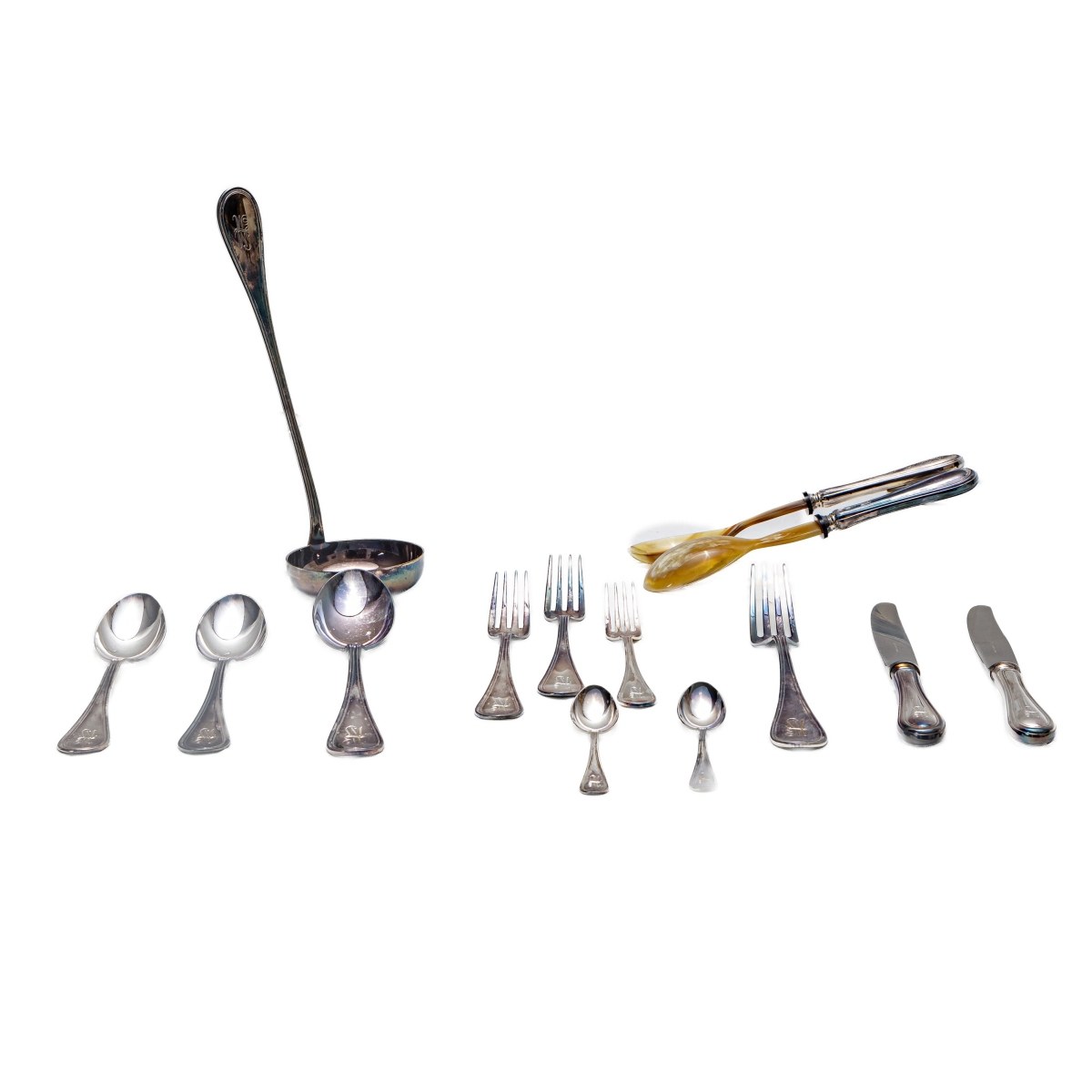 composed of: 48 forks of two sizes, 12 teaspoons, three serving cutlery, 24 large knives, 24 small knives en suite with forks and a pair of horn and silver cutlery gr. 4,314 gross weight gr. 9,507