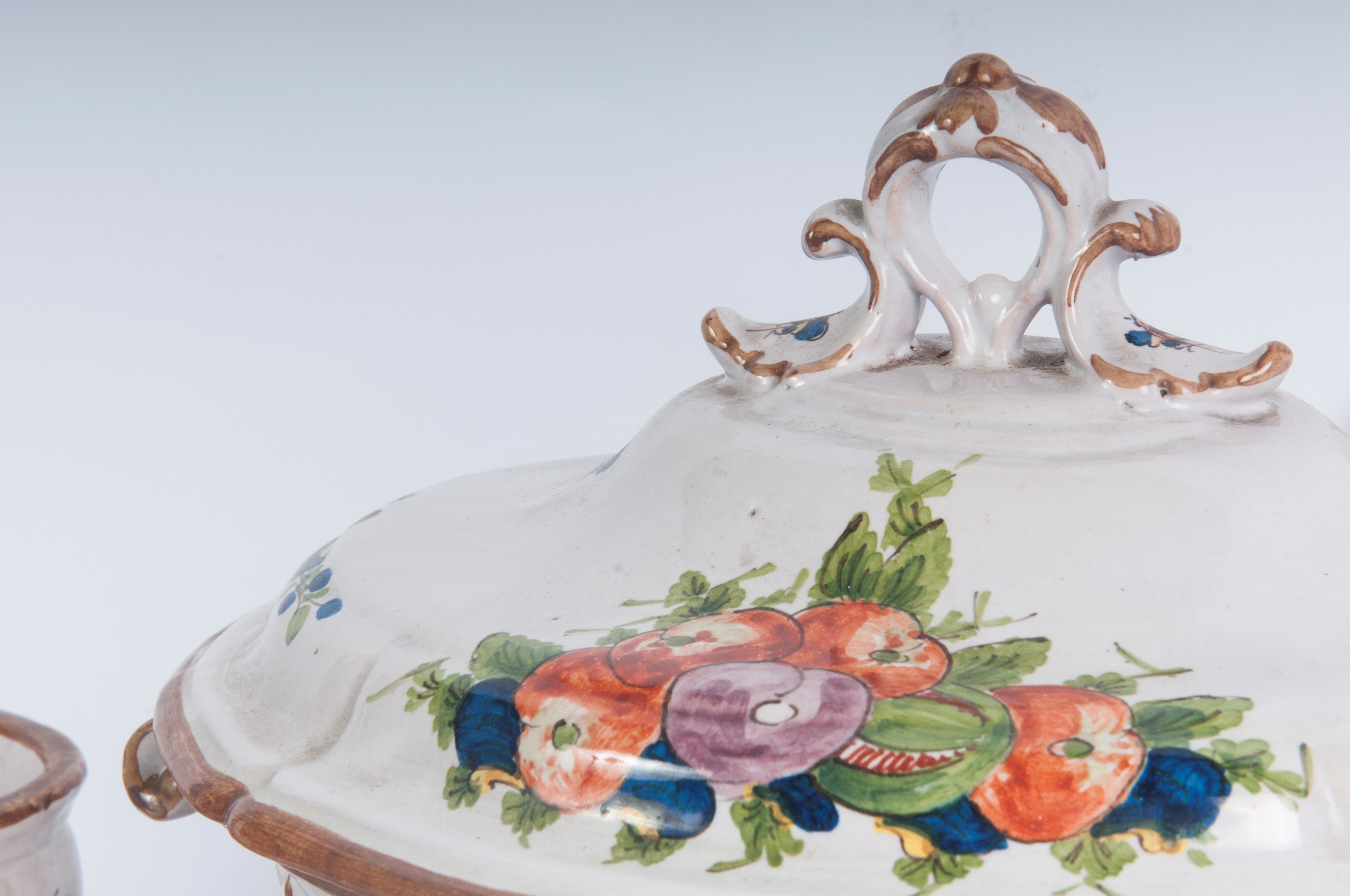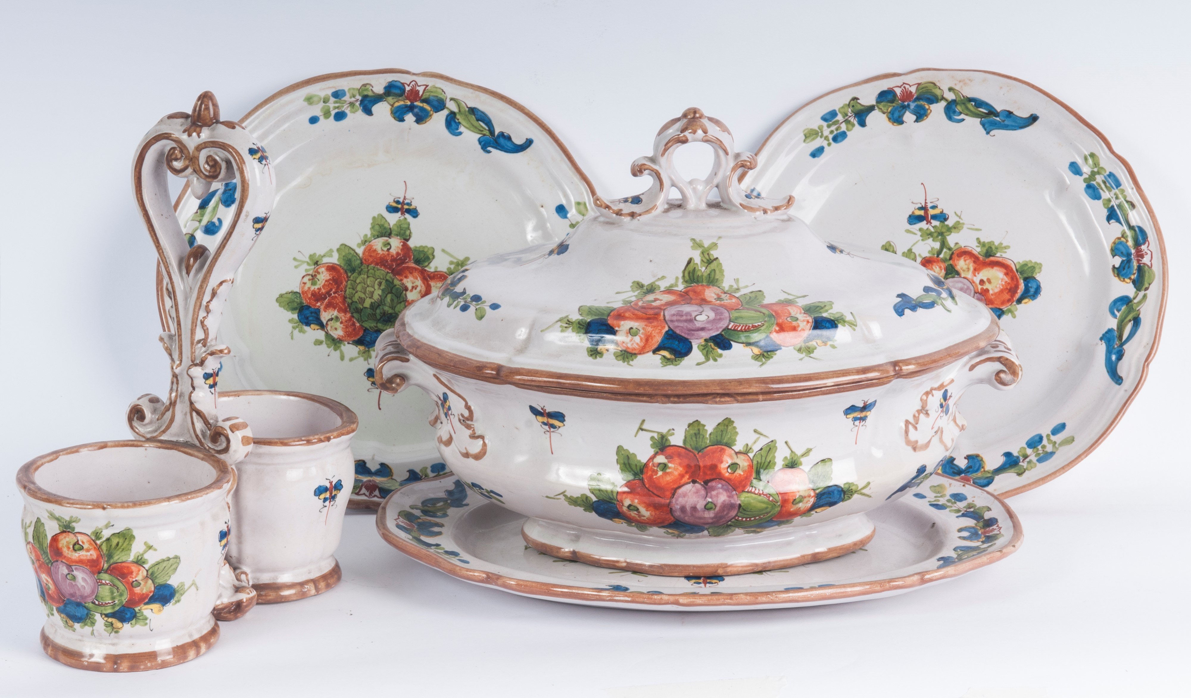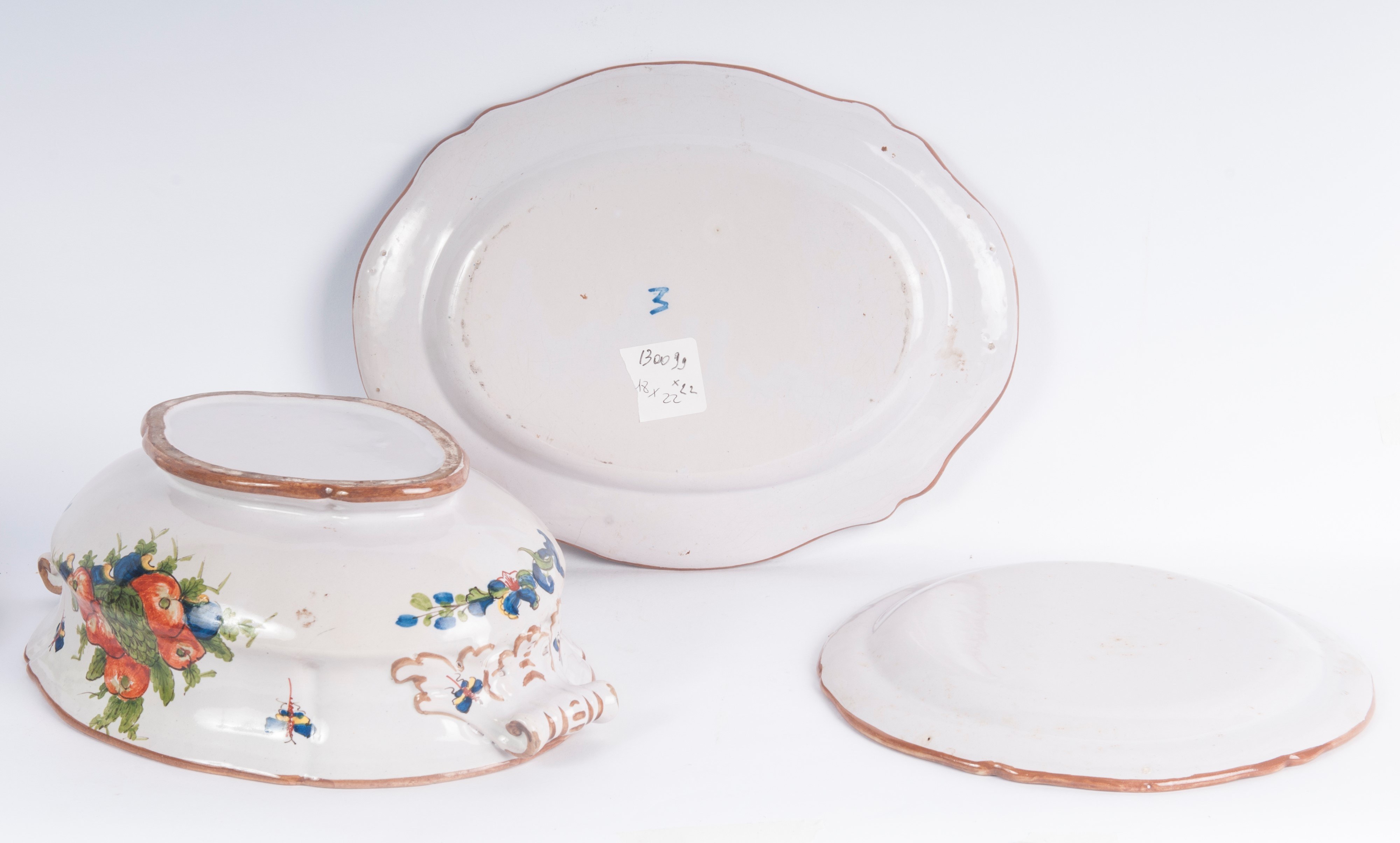 24 x 2 cm; six dessert plates 21.5 x 2 cm; a soup tureen with a serving stand 32 x 24.5 x 2.5 cm and 20 x 32 x 22.5 cm; a white ceramic vinegar jar with fruit and flower decoration 25 x 18 x 8 cm. 22 pcs.