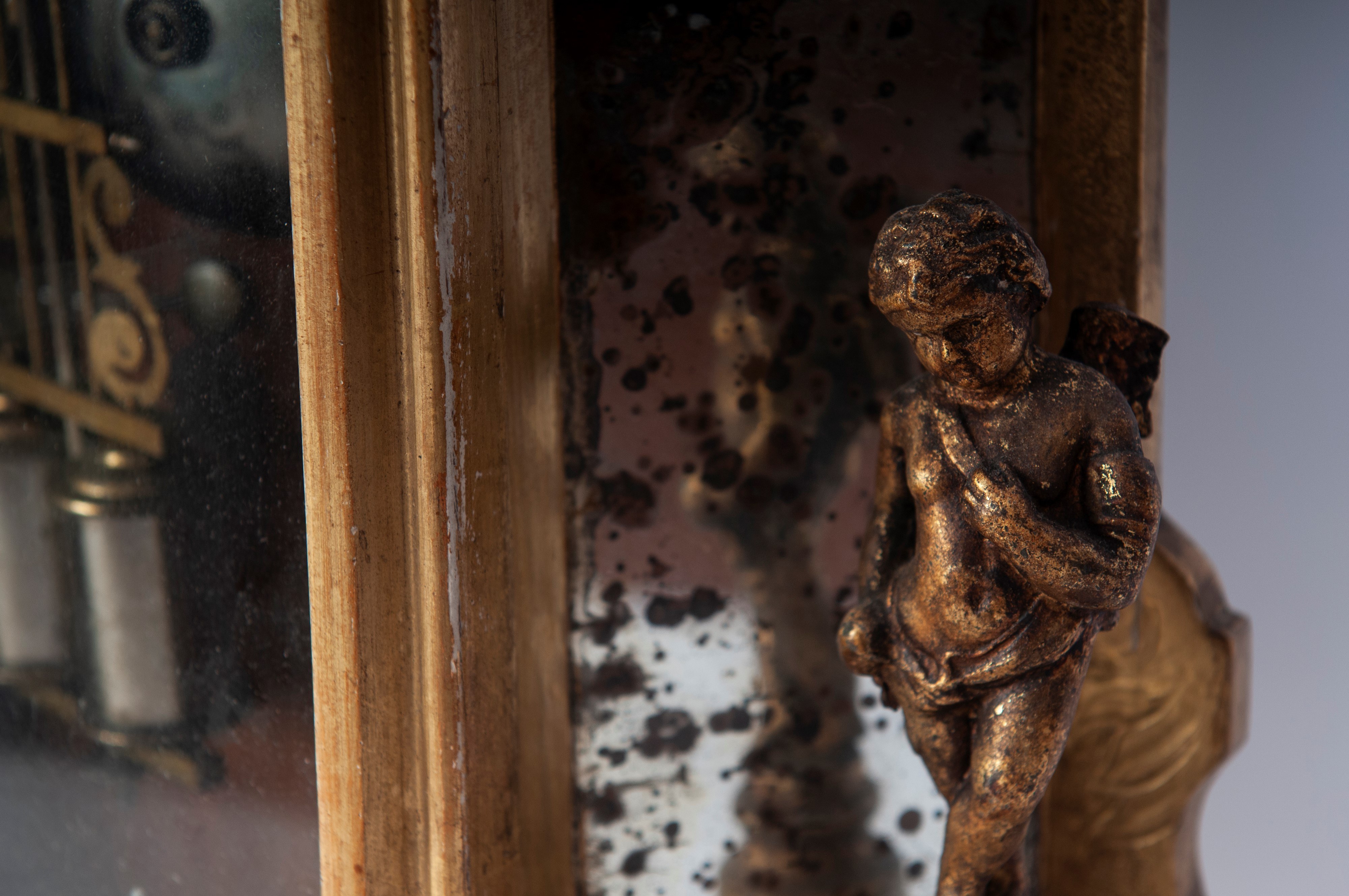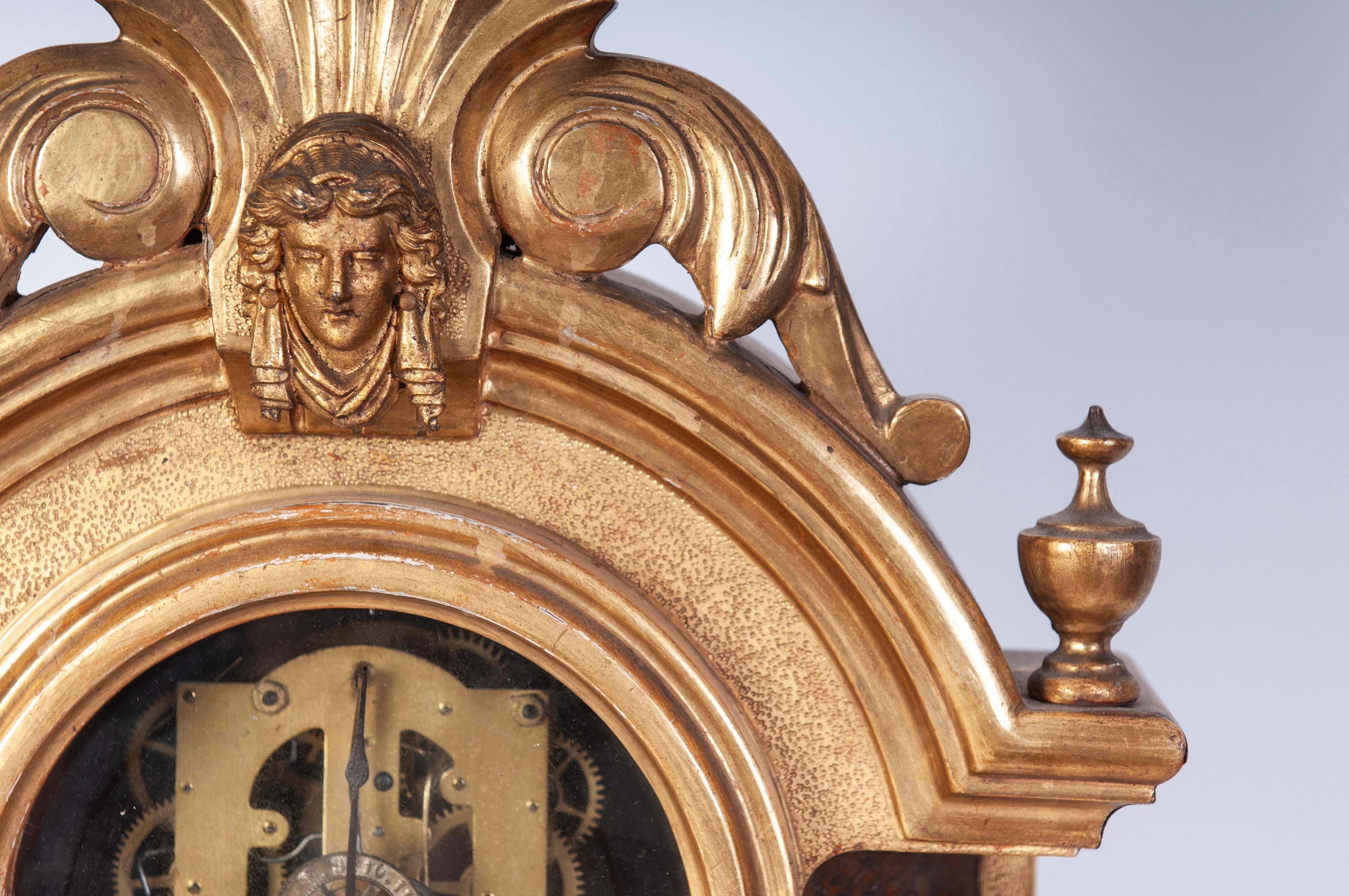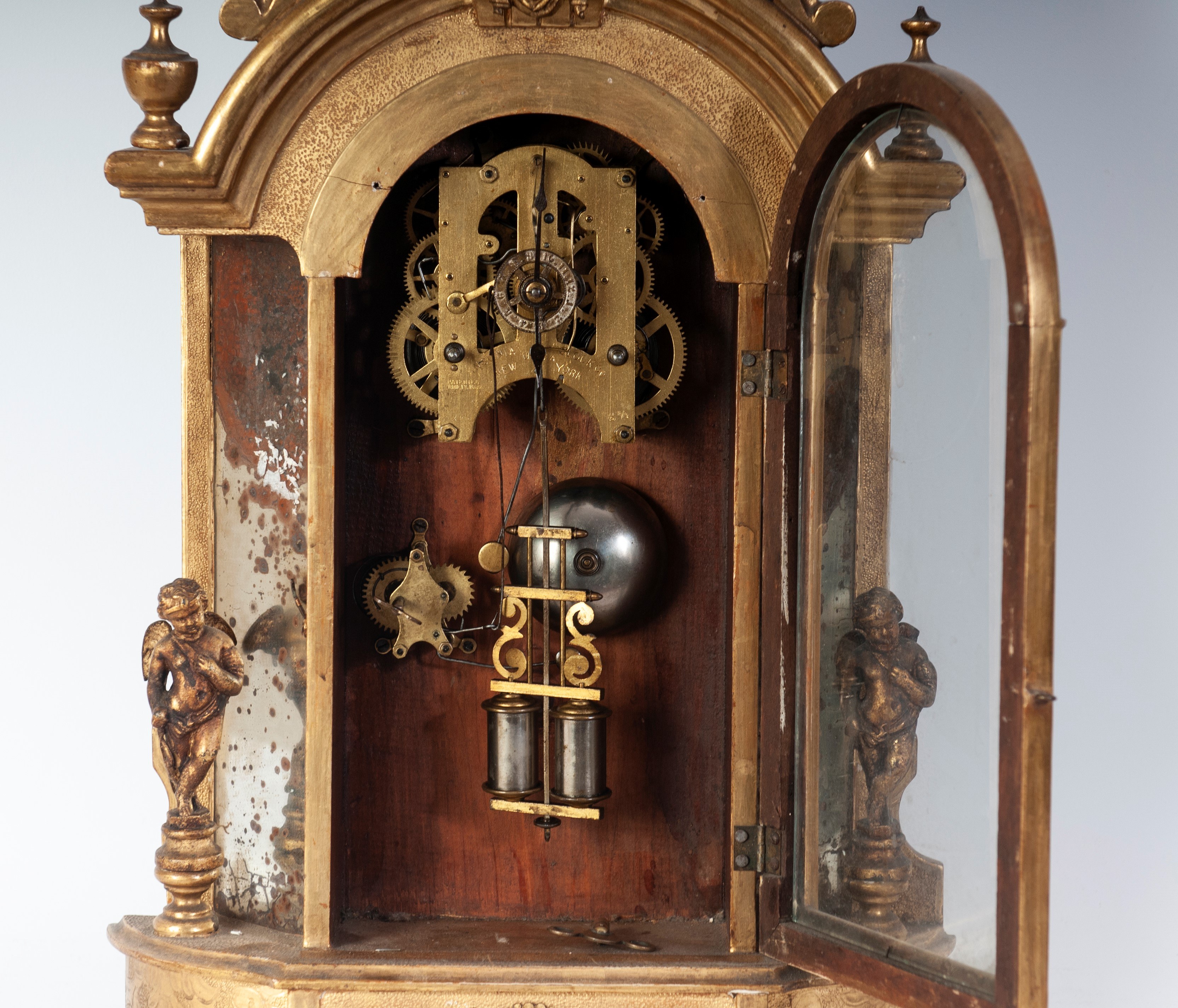 Pendulum mechanism with band spacer. Hourly and half-hour repeater. Gilded wooden case with decorative gilded metal cherub-shaped elements. Untested and signed Ansonia clock and co.