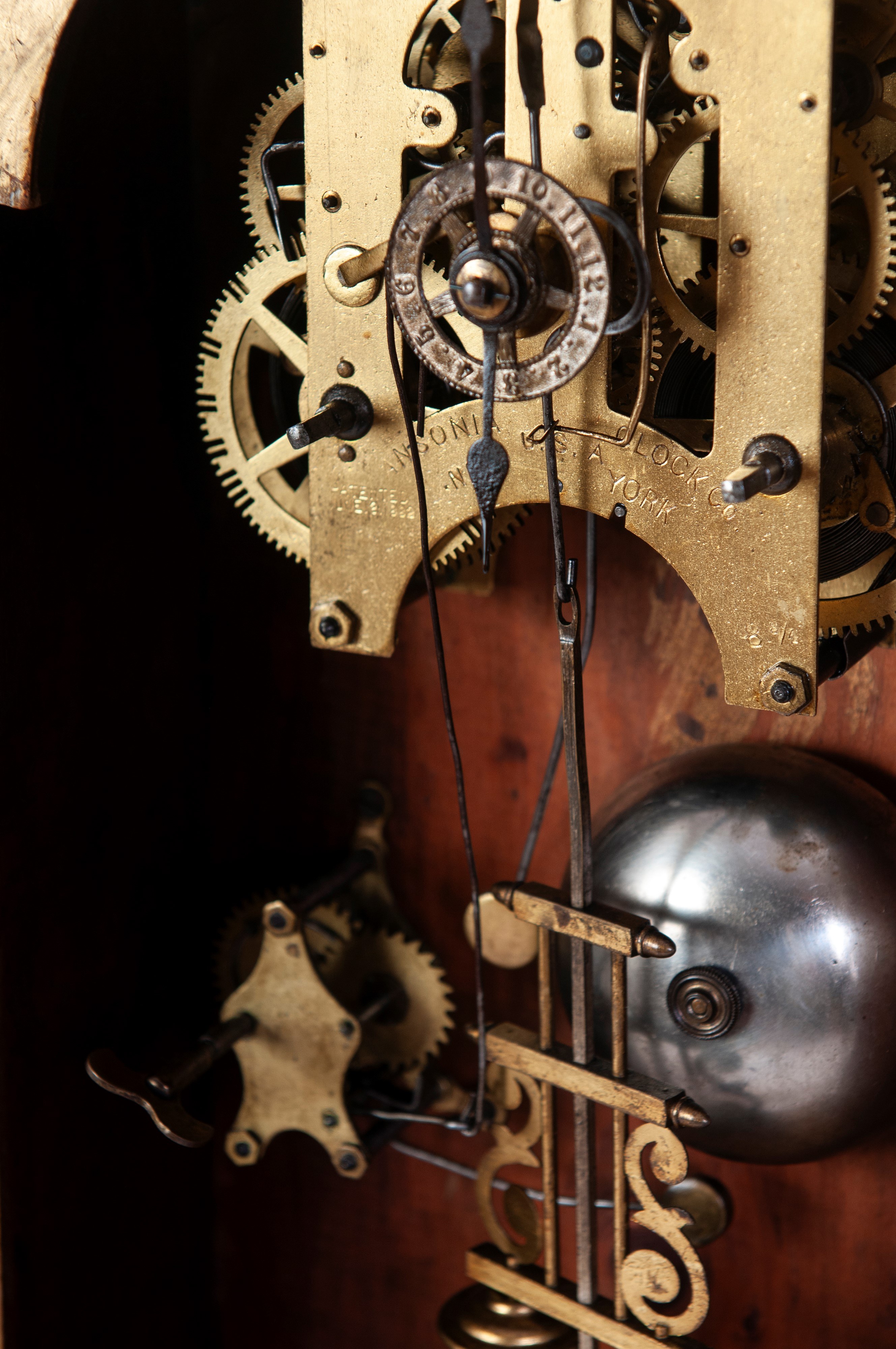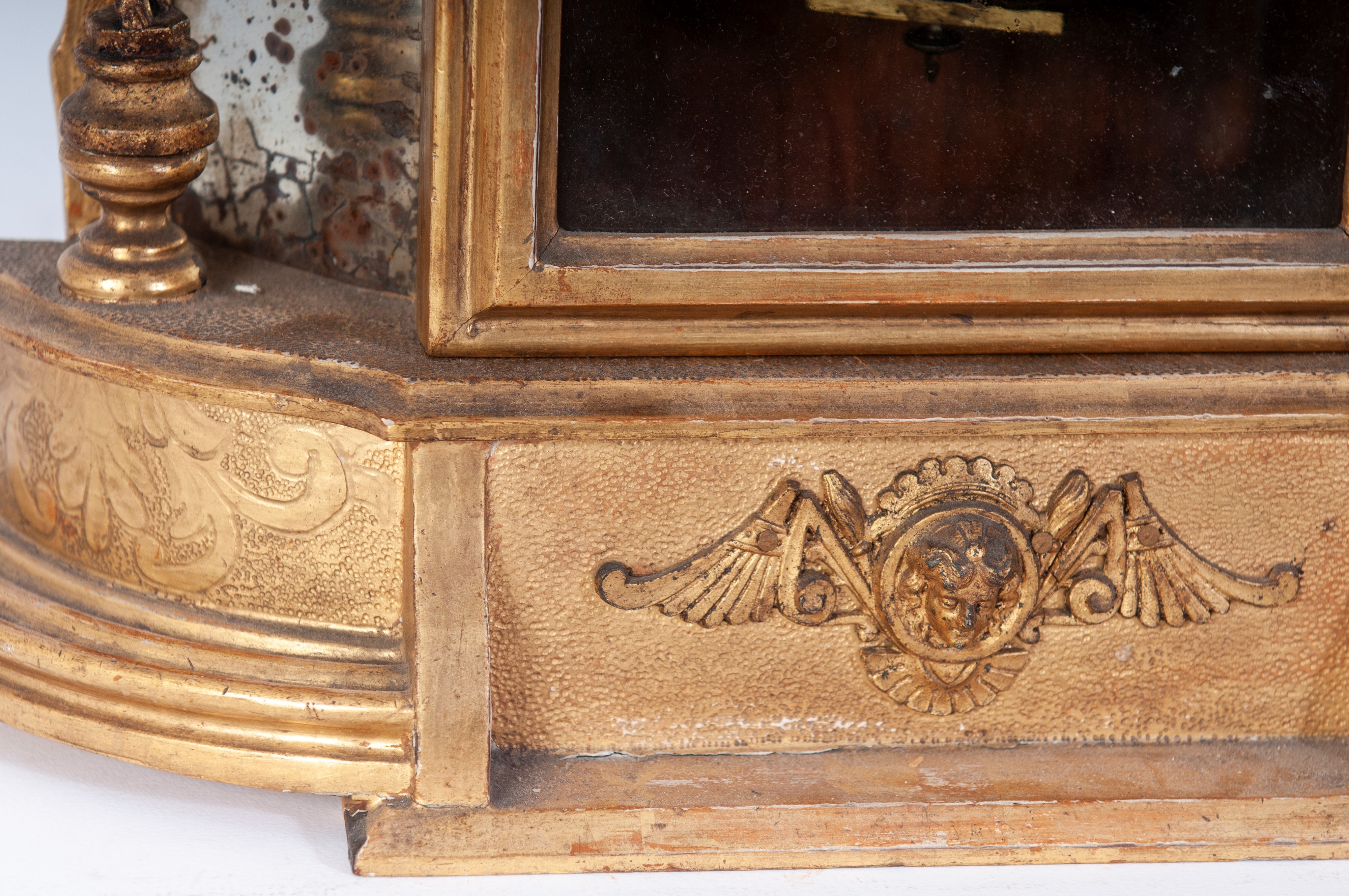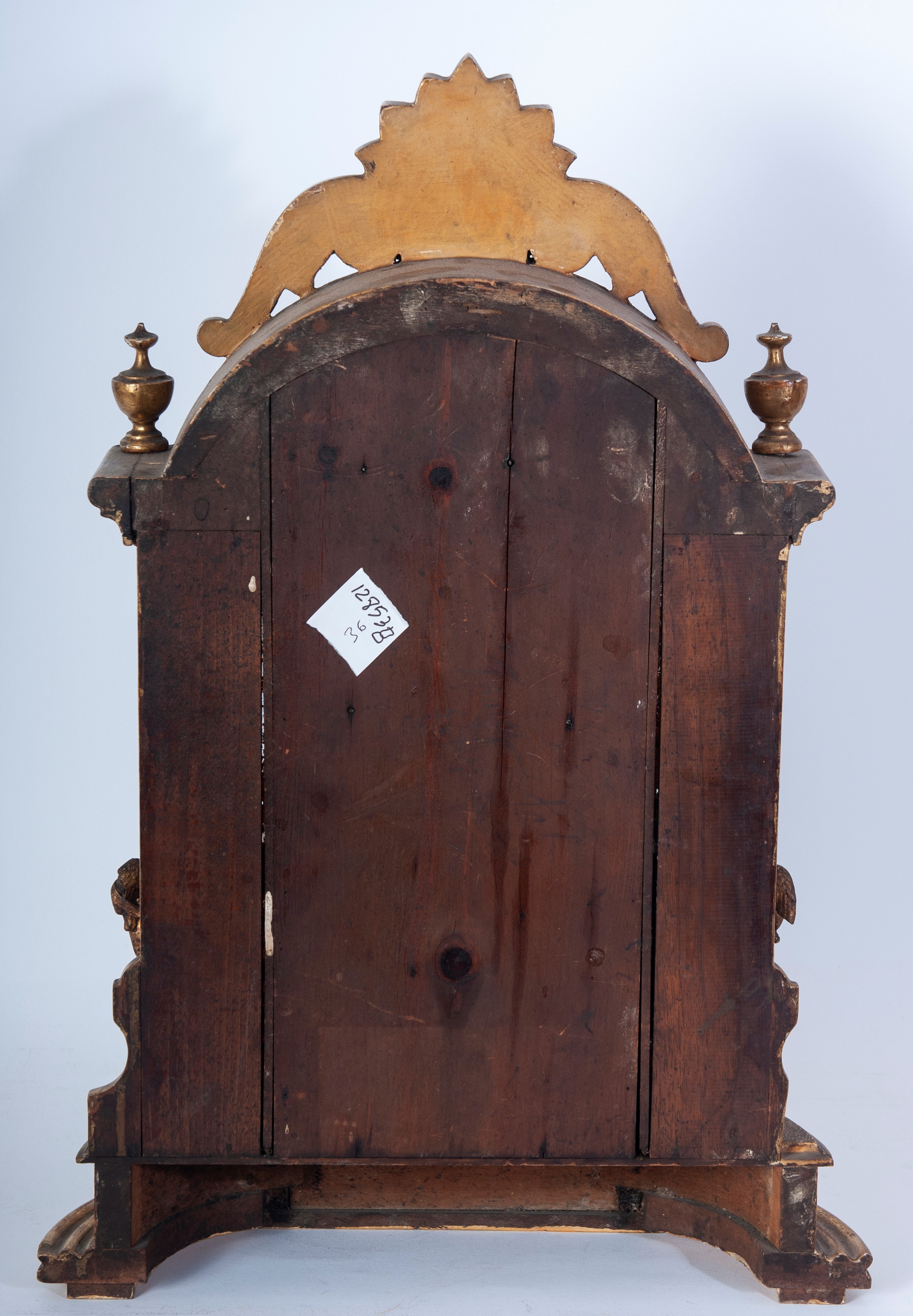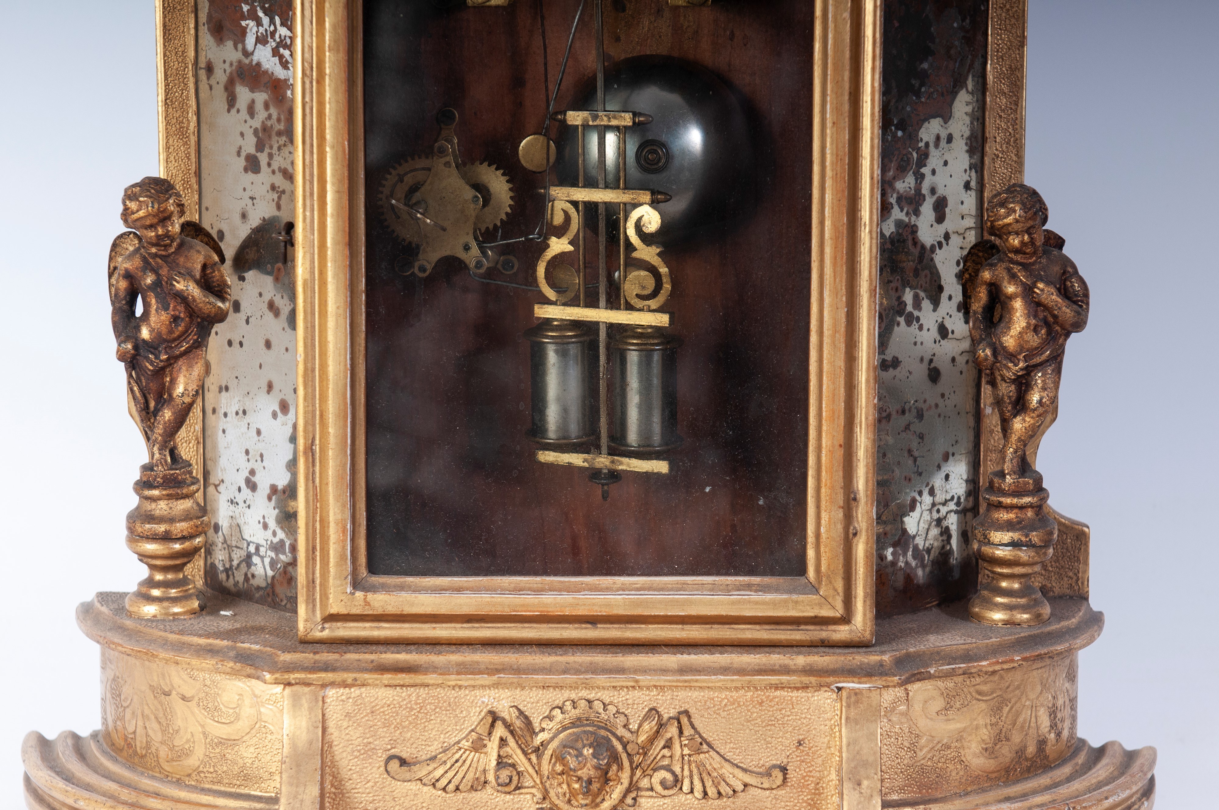Pendulum mechanism with band spacer. Hourly and half-hour repeater. Gilded wooden case with decorative gilded metal cherub-shaped elements. Untested and signed Ansonia clock and co.