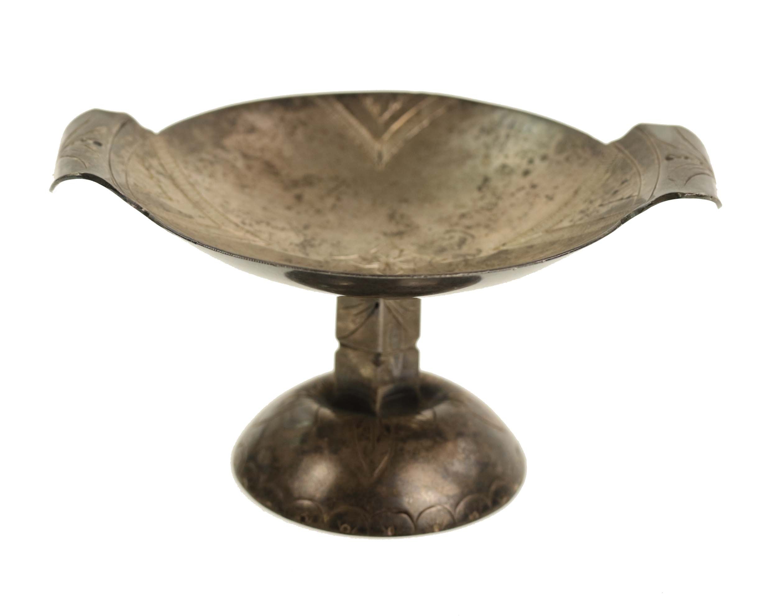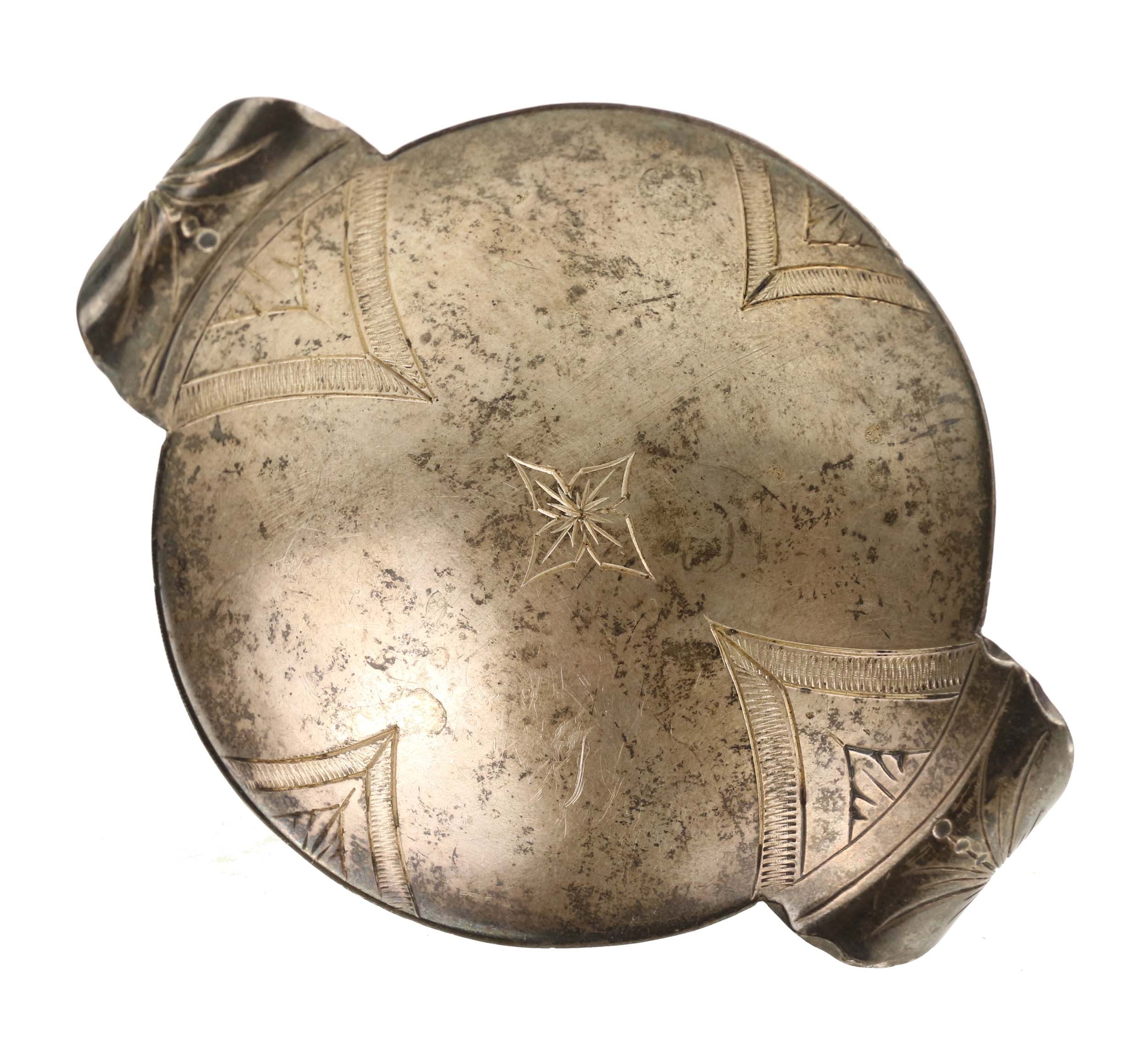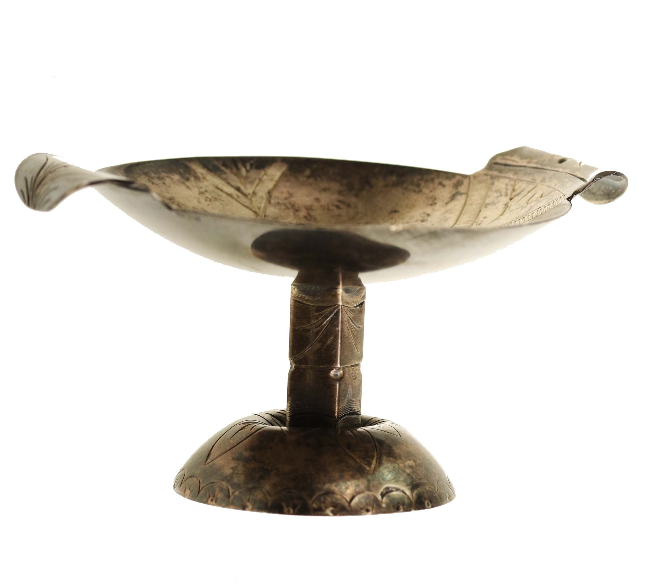 Solniczka, srebro, waga 59,03g, wym miseczki 9 x 7cm, wysokość 4,5cm, warszawska próba srebra ''925'', nieczytelna sygnatura wytwórcy.