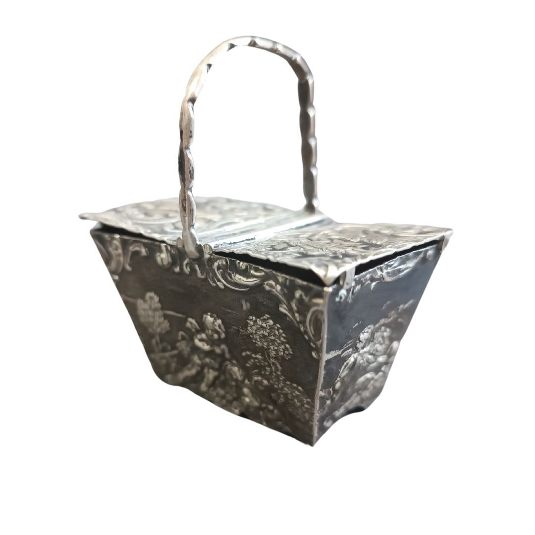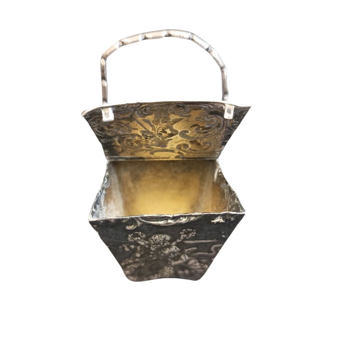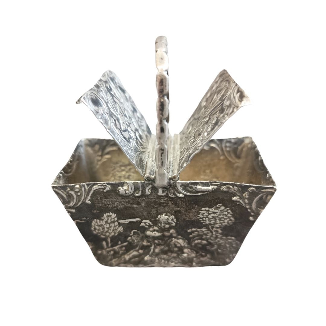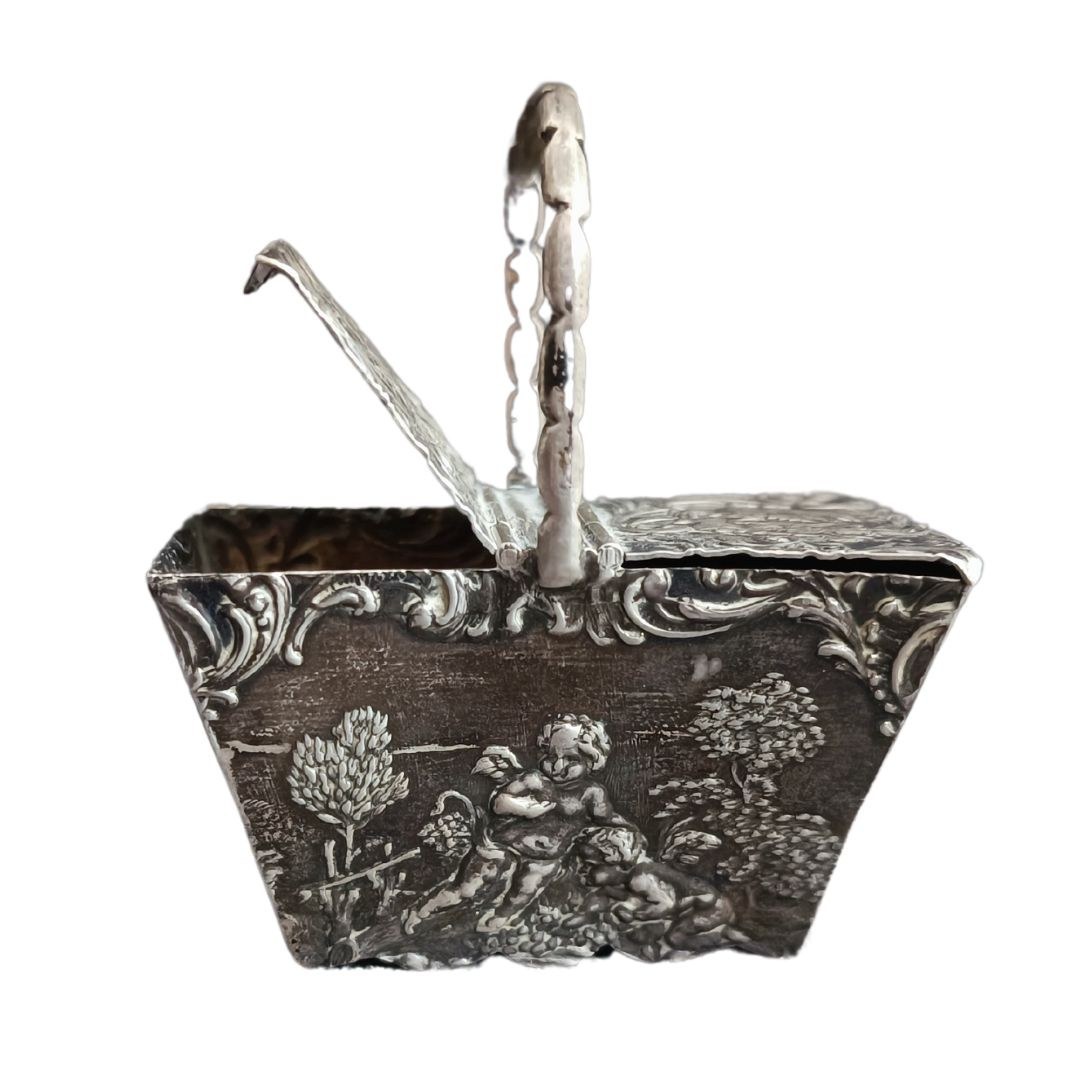 Wyjątkowy srebrny koszyczek z rączką i zamykanym wieczkiem, zdobiony sceną z amorkami, i fantazyjnymi wzorami u góry. Wykonane w charakterystycznym dla II poł. XIX w. stylu imitującym dawniejsze obiekty ze srebra. Obiekty w tym stylu zwane są niekiedy srebrem z Hanau, od nazwy miasta, będącego centrum tego typu produkcji.