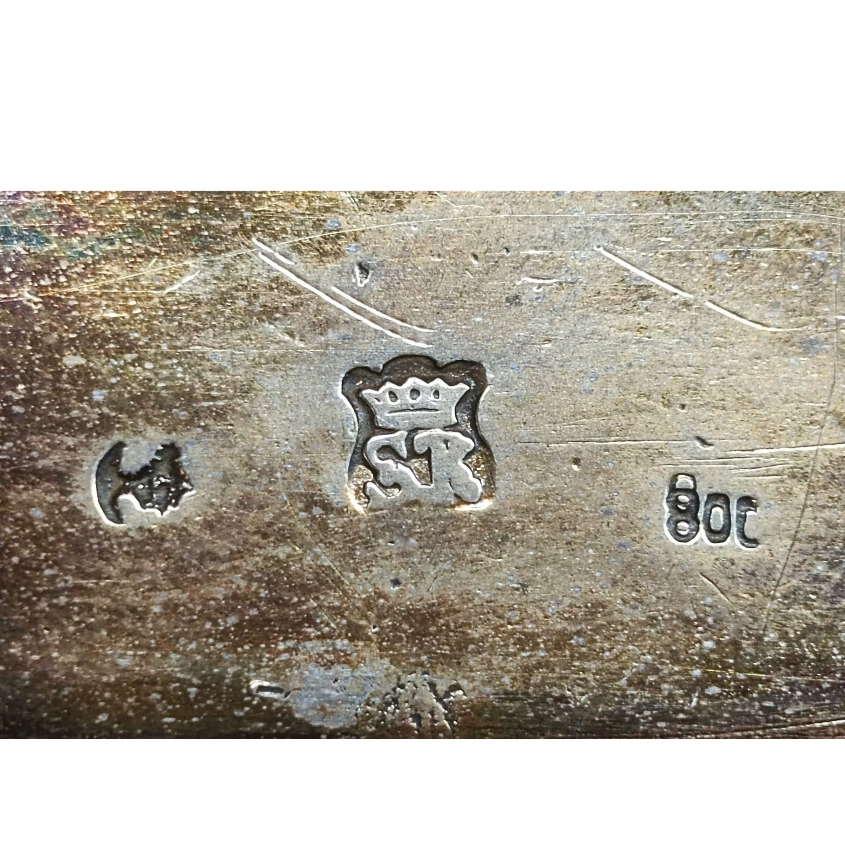 Na spodzie punce (księżyc i korona, będące oficjalną puncą niemieckiego srebra, próba 800, litery SR pod koroną - złotnik Simon Hermann Rosenau*.