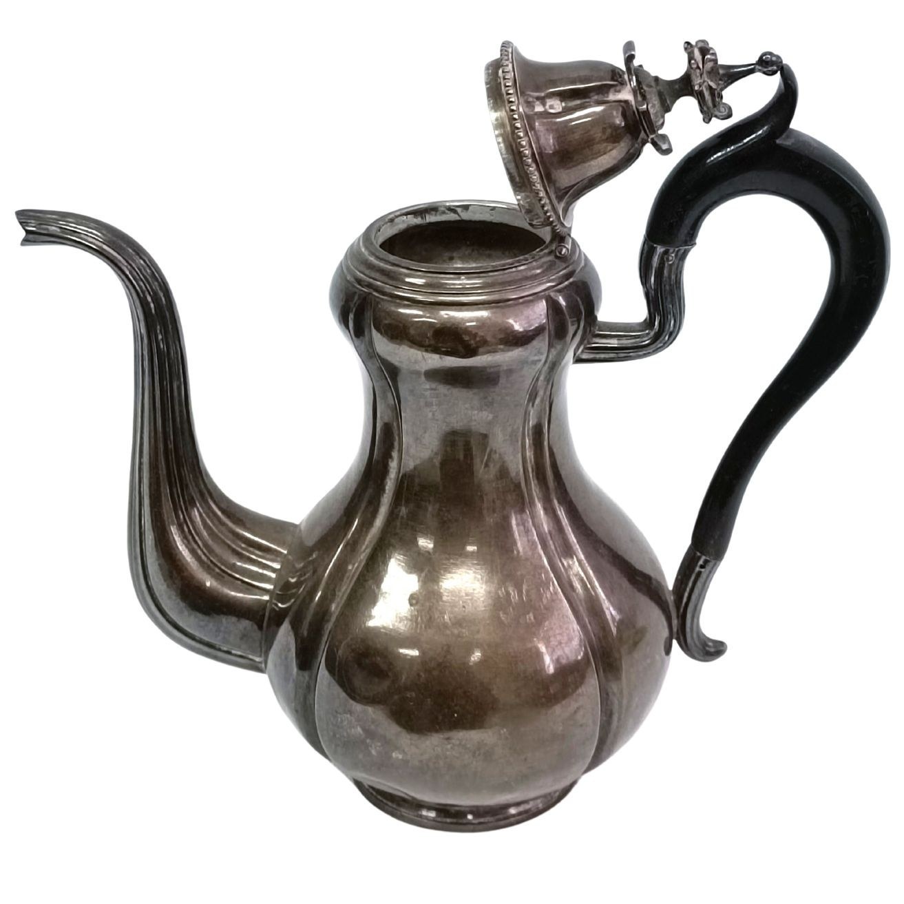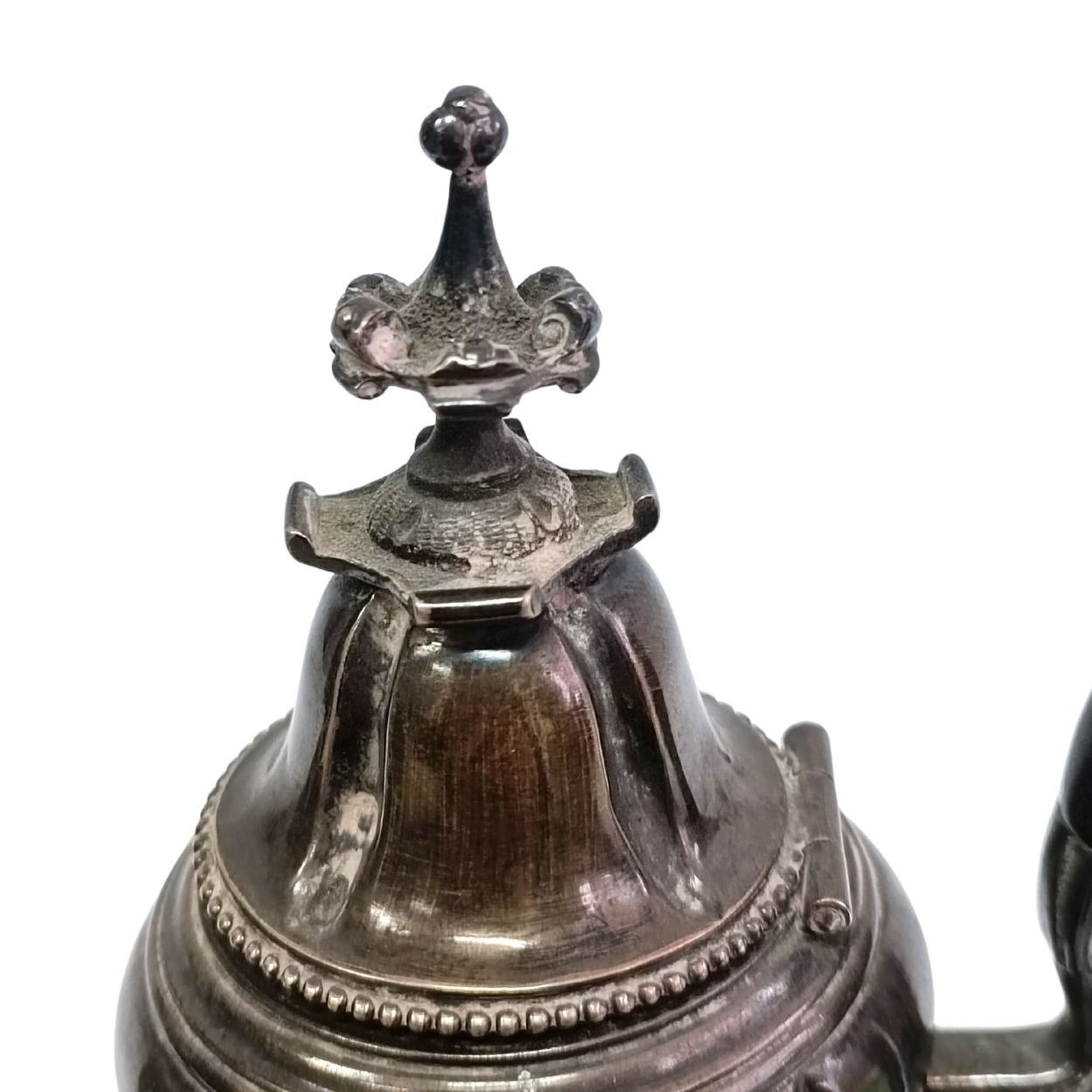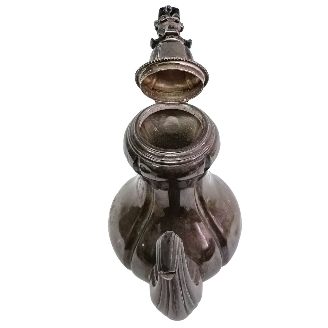 Niewielki czajniczek do herbaty o fantazyjnym kształcie, zwieńczony ozdobną pokrywką. Stan dobry, ślady zabrudzeń/zadrapań, kilka wgnieceń u dołu (jedno większe i dwa mniejsze). Punce pod spodem (sygnatura złotnika M FRAY oraz Minerwa). Srebro próba 925.