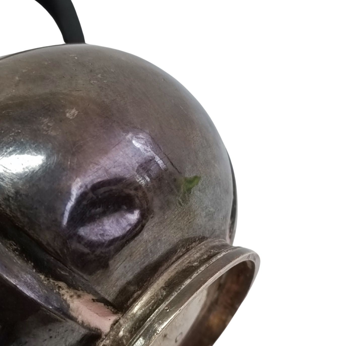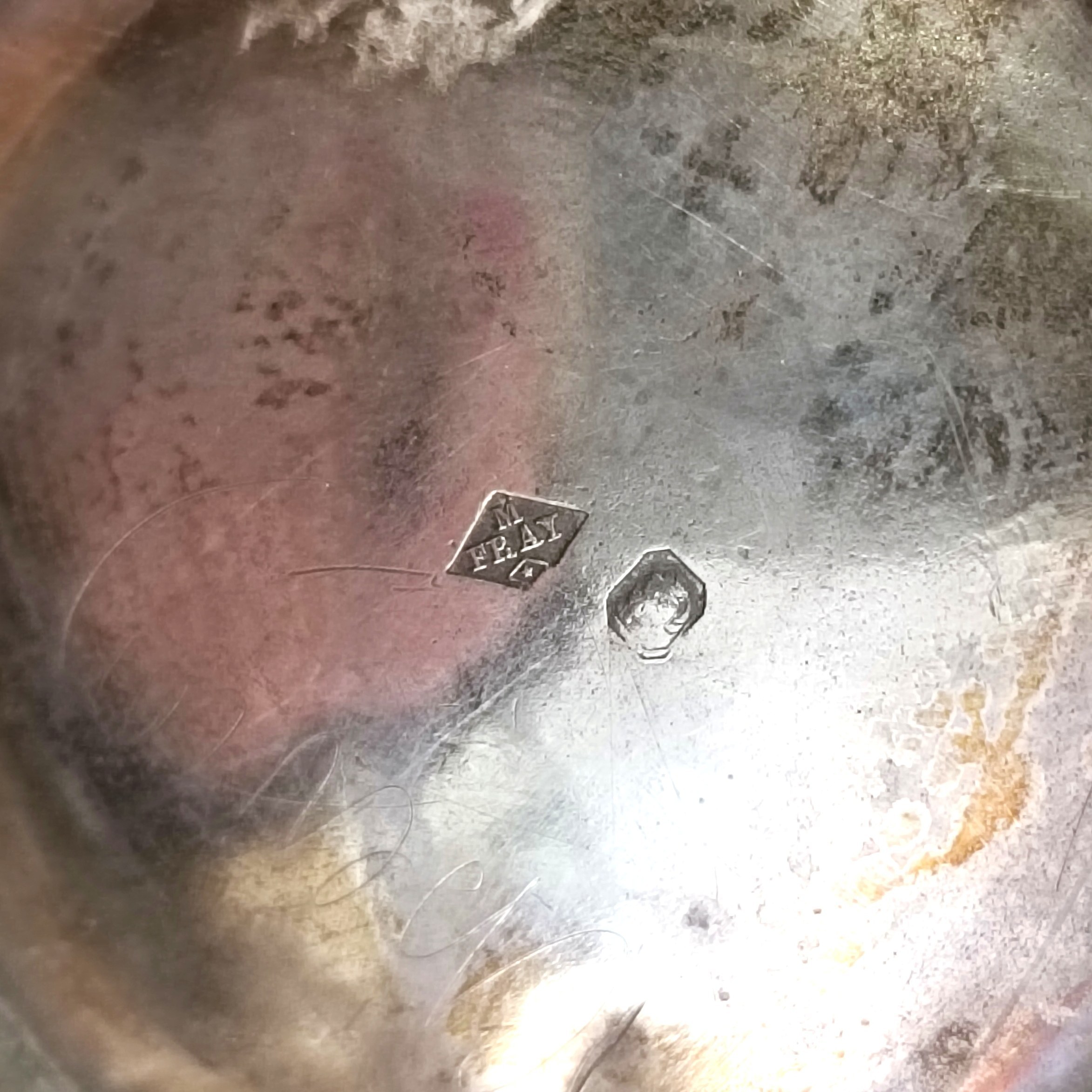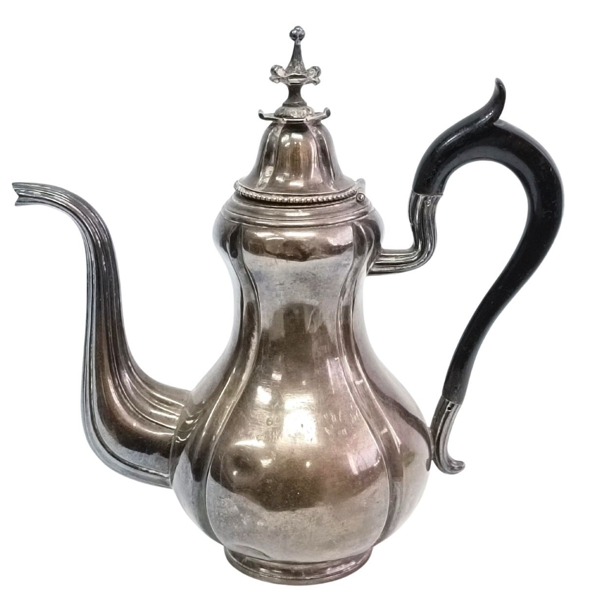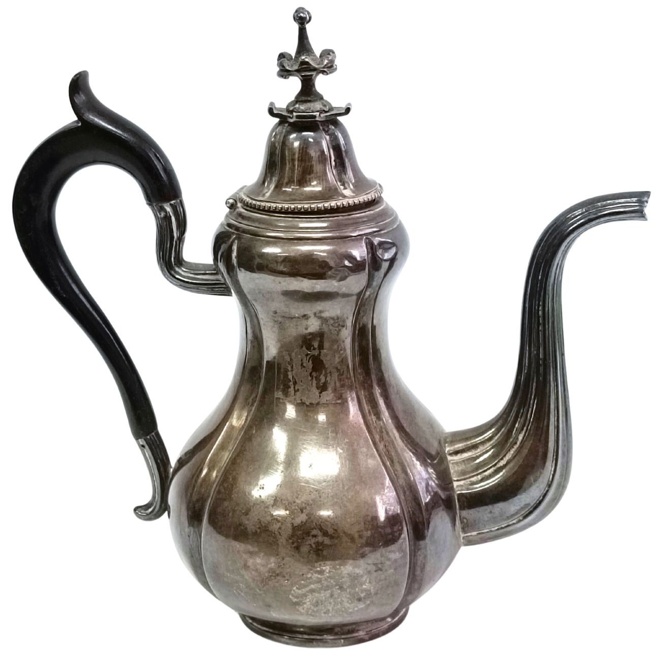 Niewielki czajniczek do herbaty o fantazyjnym kształcie, zwieńczony ozdobną pokrywką. Stan dobry, ślady zabrudzeń/zadrapań, kilka wgnieceń u dołu (jedno większe i dwa mniejsze). Punce pod spodem (sygnatura złotnika M FRAY oraz Minerwa). Srebro próba 925.