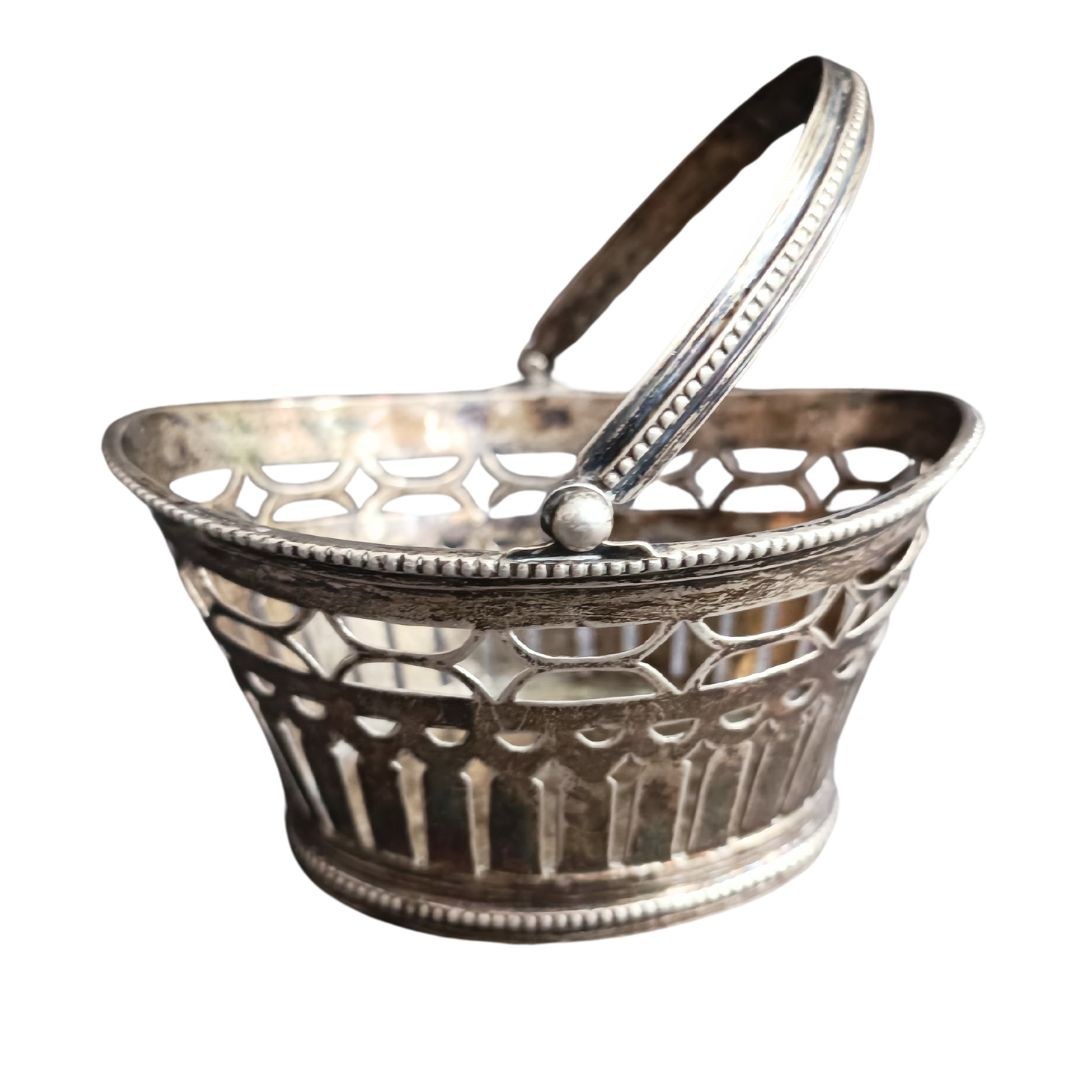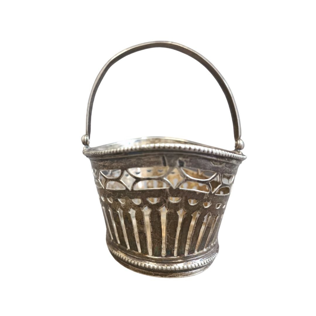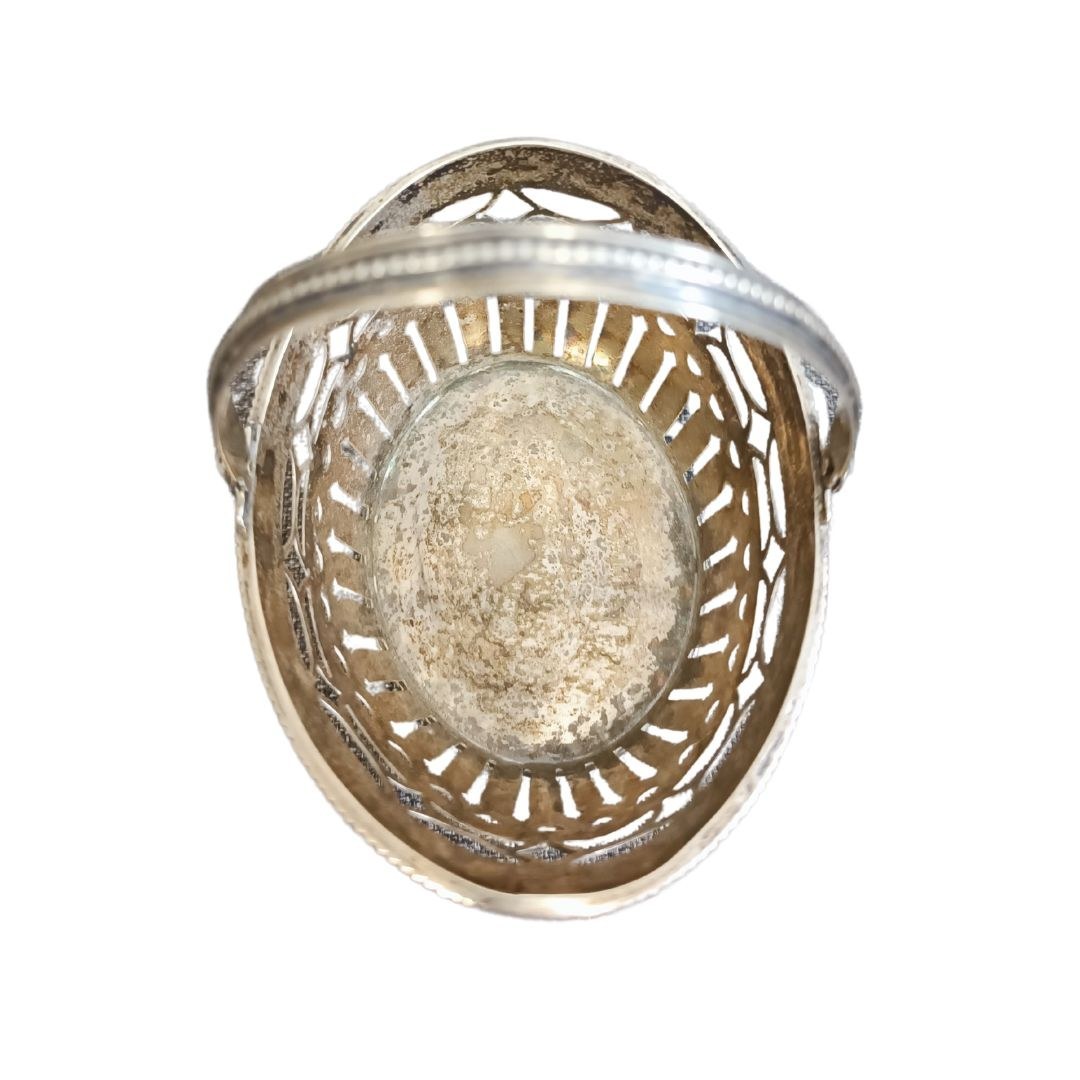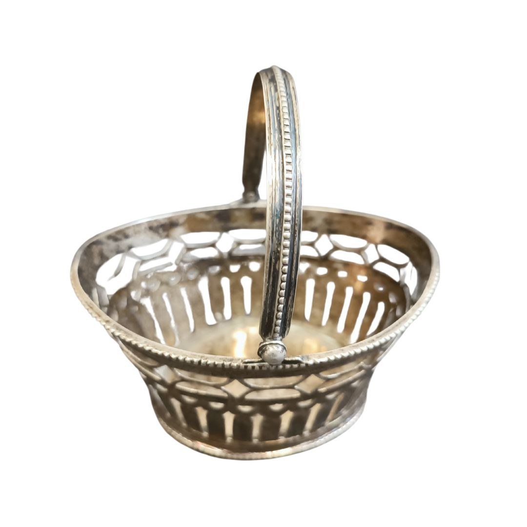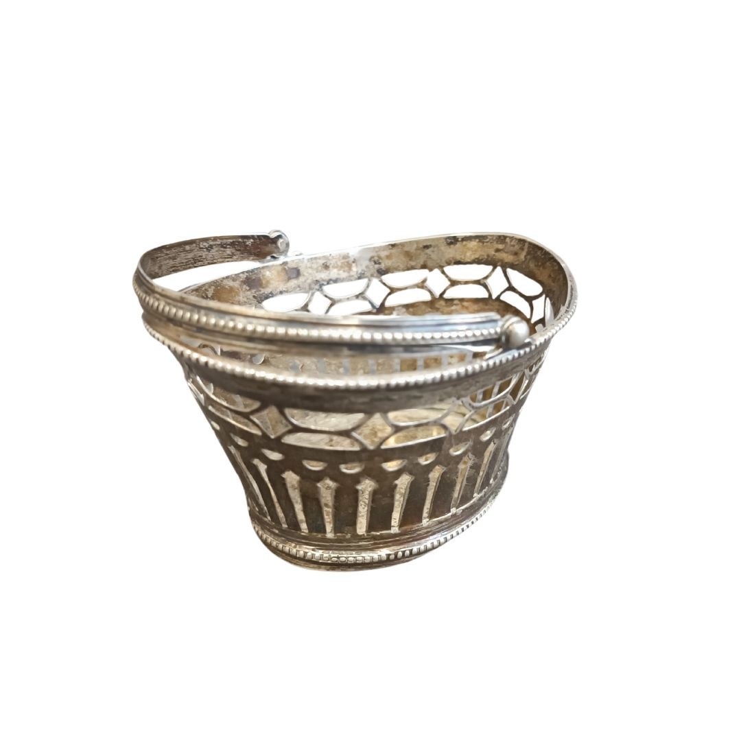 Elegancki, ozdobny koszyczek ze srebra, kunsztownie wykonany.