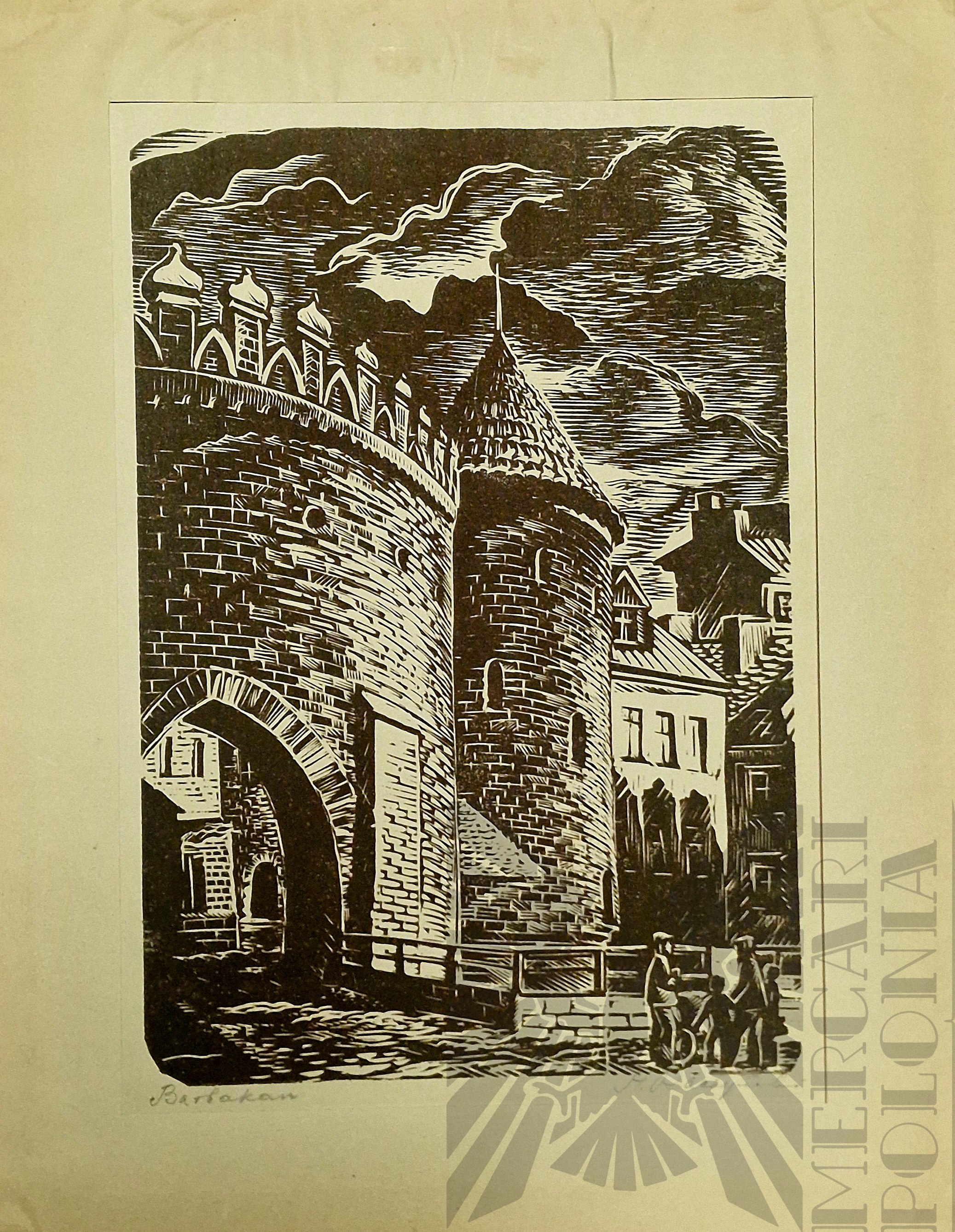 Drzeworyt, papier, 28 x 19 cm (w świetle passe – partout) ; sygn. ołówkiem przez autora p.d. „S. Raczyński” oraz l.d. „Barbakan”