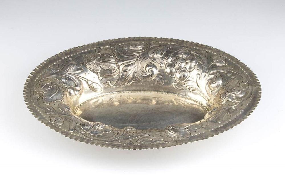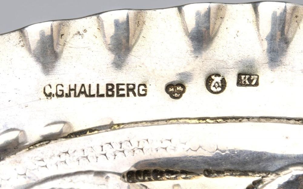 of oval shape, entirely embossed and chiselled with flowers leaves. 800/1000 silver, hallmarked with the marks in use in Stockholm in 1912 (K7), silversmith Gustav Mollenberg (C.G. Hallbergs Guldsmeds AB). C.G. Hallberg was a prominent Swedish goldsmiths and jewellers, jeweller to the Swedish Court.