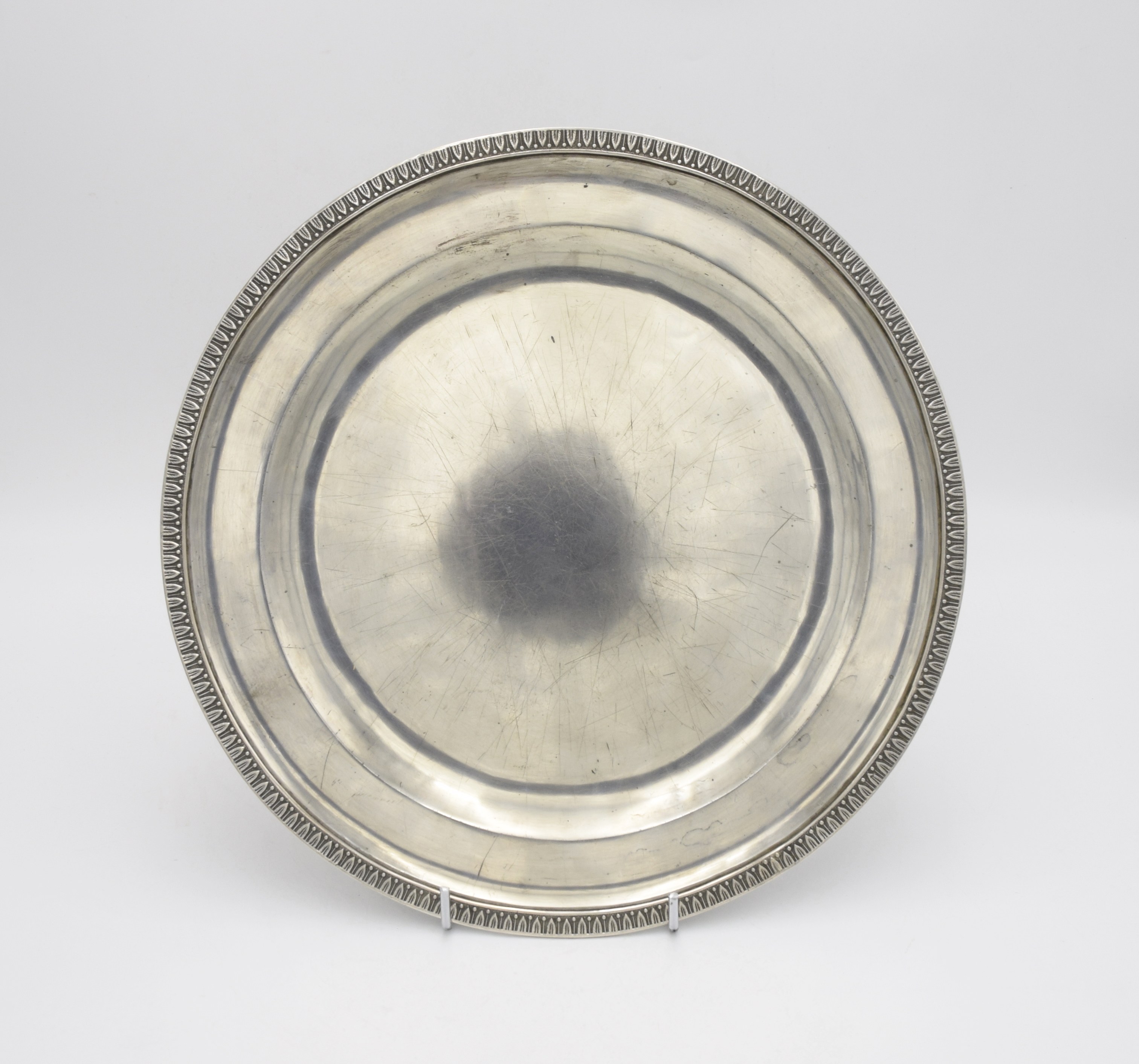 srebro próby 3 cechowane (cecha państwowa próba 3, głowa kobiety, litera W - w owalu, monogram KG bity w głąb); wys. 1,8 cm, średnica 32,5 cm; waga 857 g.
