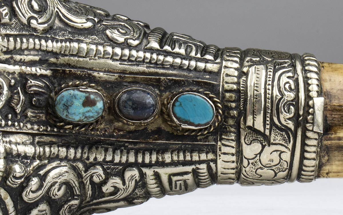 Tibetan kangling, a wind instrument originating in Nepal. Used mainly during Buddhist rituals, it features embossed and chiseled silver elements with typical figures, set with lapis and Iranian turquoise.