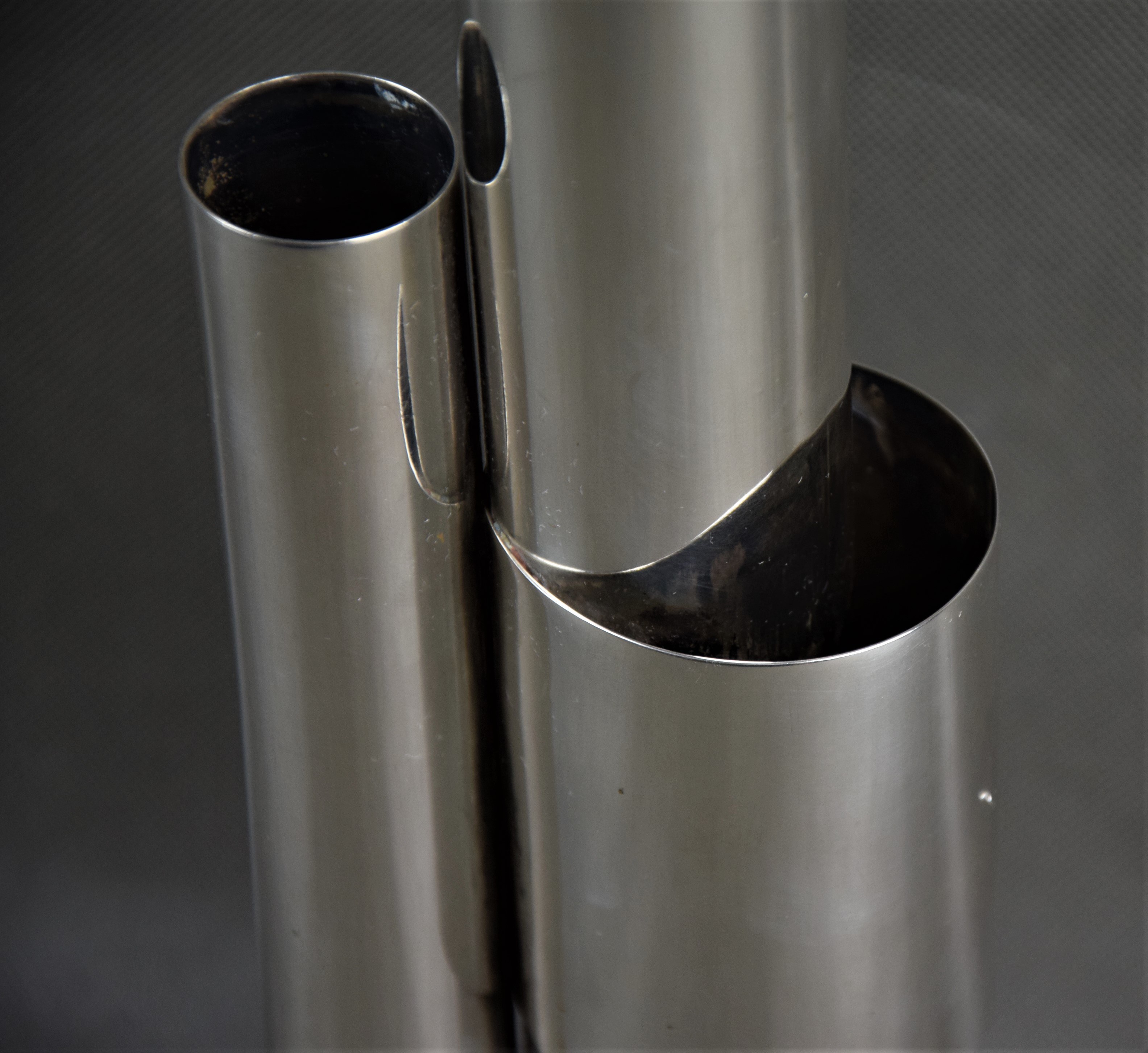 Wazon wykonany w całości ze srebra pr. 3 zaprojektowany w geometrycznej formie. Wykonany w Spółdzielni Imago Artis w Krakowie w latach 60-tych. Stan bardzo dobry. W jednym miejscu dziurka z nitem prawdopodobnie miejsce pierwotnie zawieszonej tabliczki okolicznościowej. Sygnowany przy podstawie puncami srebra i wytwórni monogram wiązany „IA”. Wysokość: 30,5 cm. Waga: 575 g.