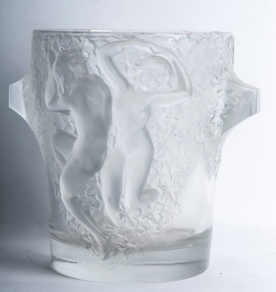 Open in shape, tapering towards the bottom with male and female figures in relief separated by plant motifs along the wall. Anvil handles.