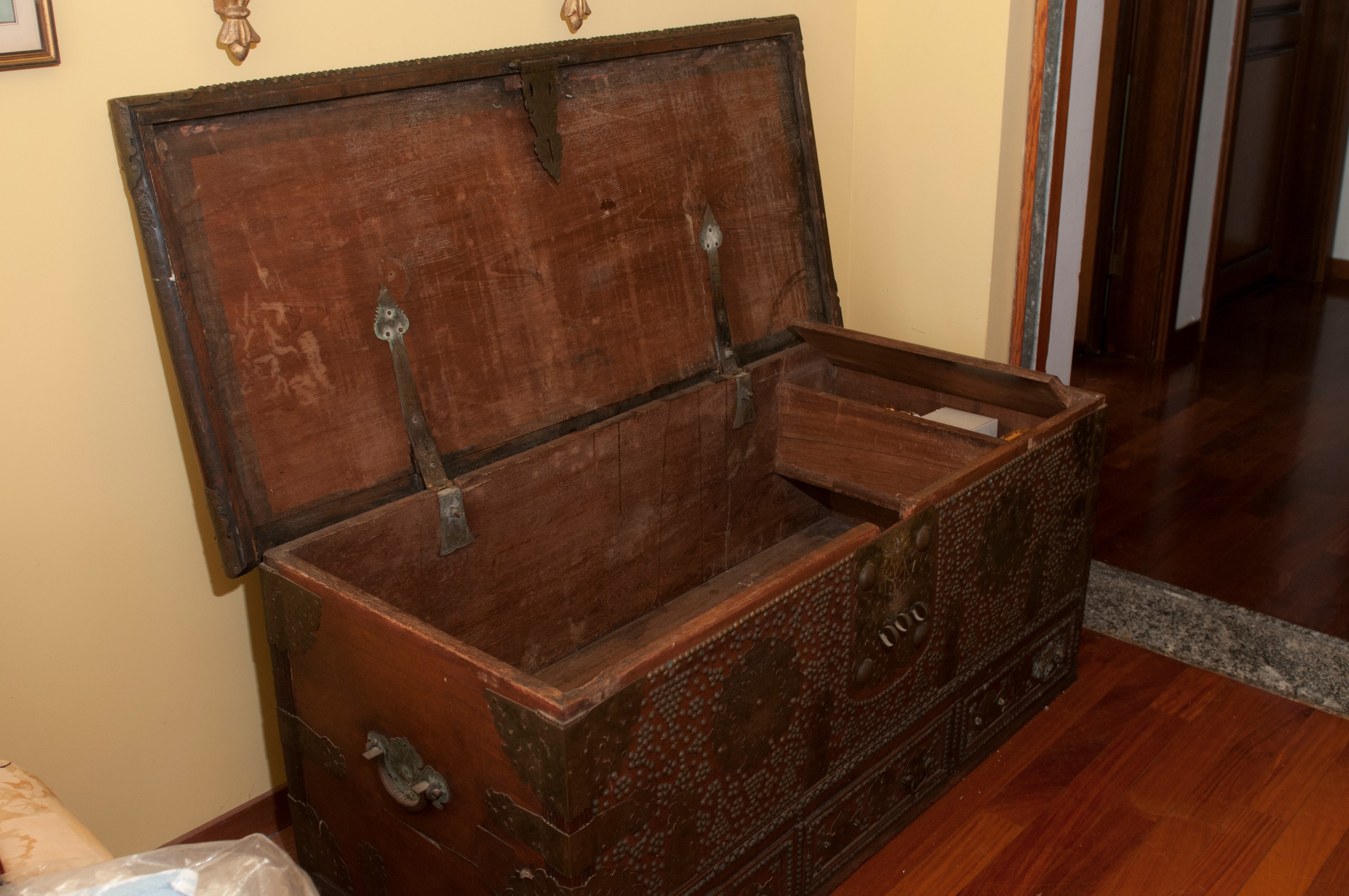 rectangular in shape with iron studs and a drawer inside.