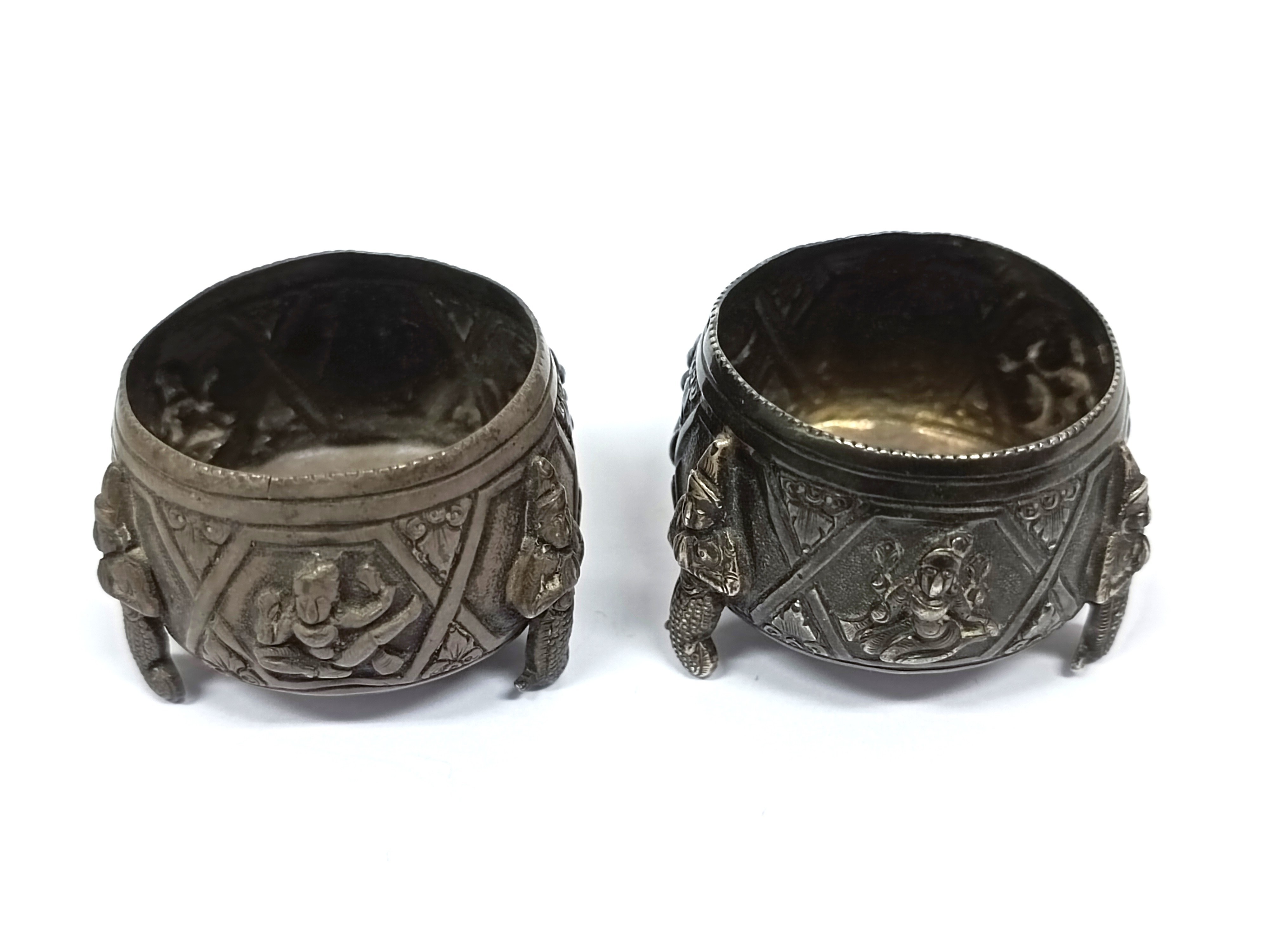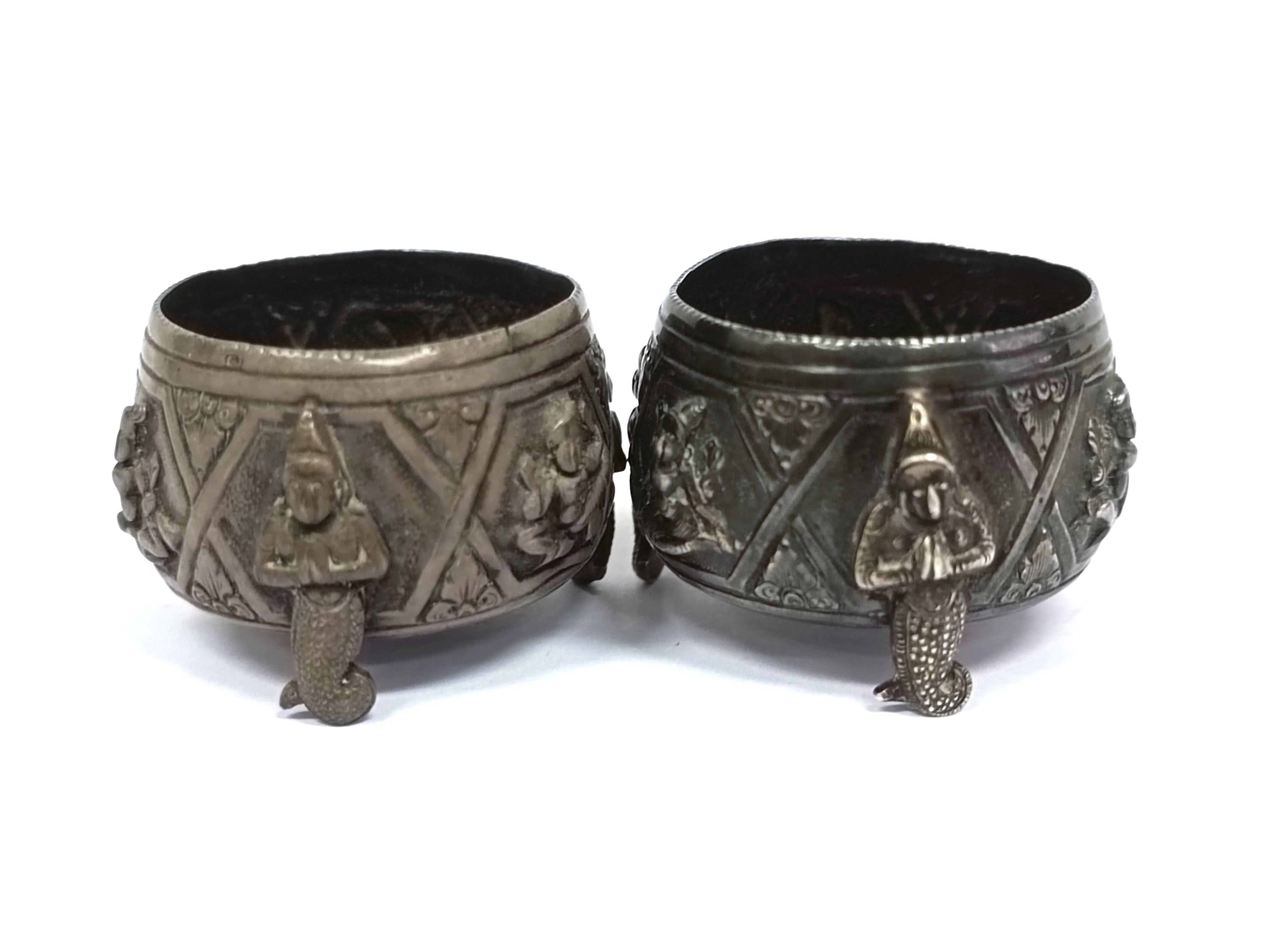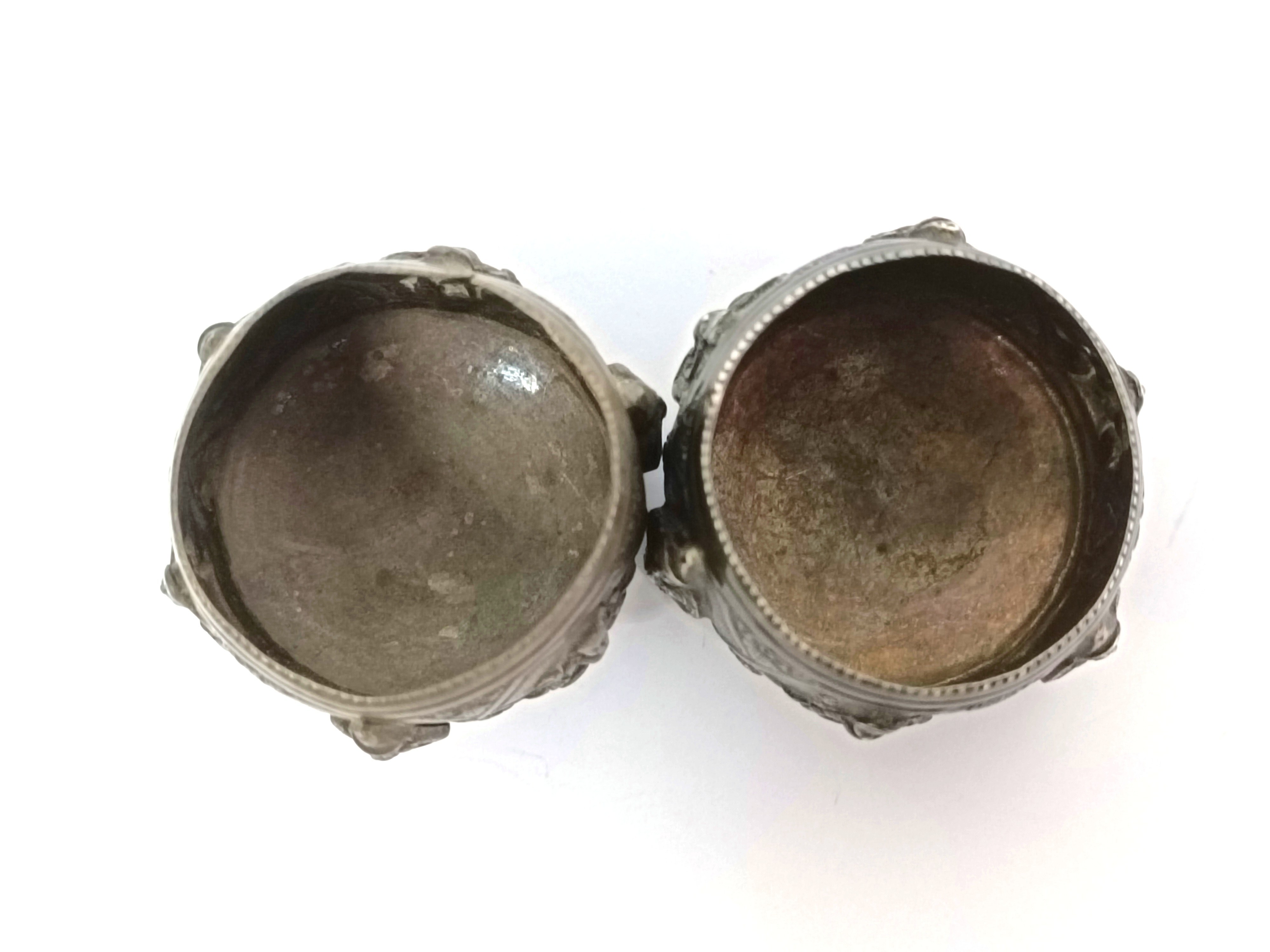 Dwa niewielkie, posrebrzane pojemniczki, być może służące jako solniczka i pieprzniczka. Zdobione postaciami o charakterystycznych formach i pozycjach, nasuwających na myśl sztukę Indii (postacie nieco różnią się na obu pojemniczkach). Punce na brzegach (niezidentyfkowane). Stan dobry/bardzo dobry (niewielkie przetarcia/przebarwienia, brzegi u góry lekko odkształcone/nieregularne w niektórych miejscach).