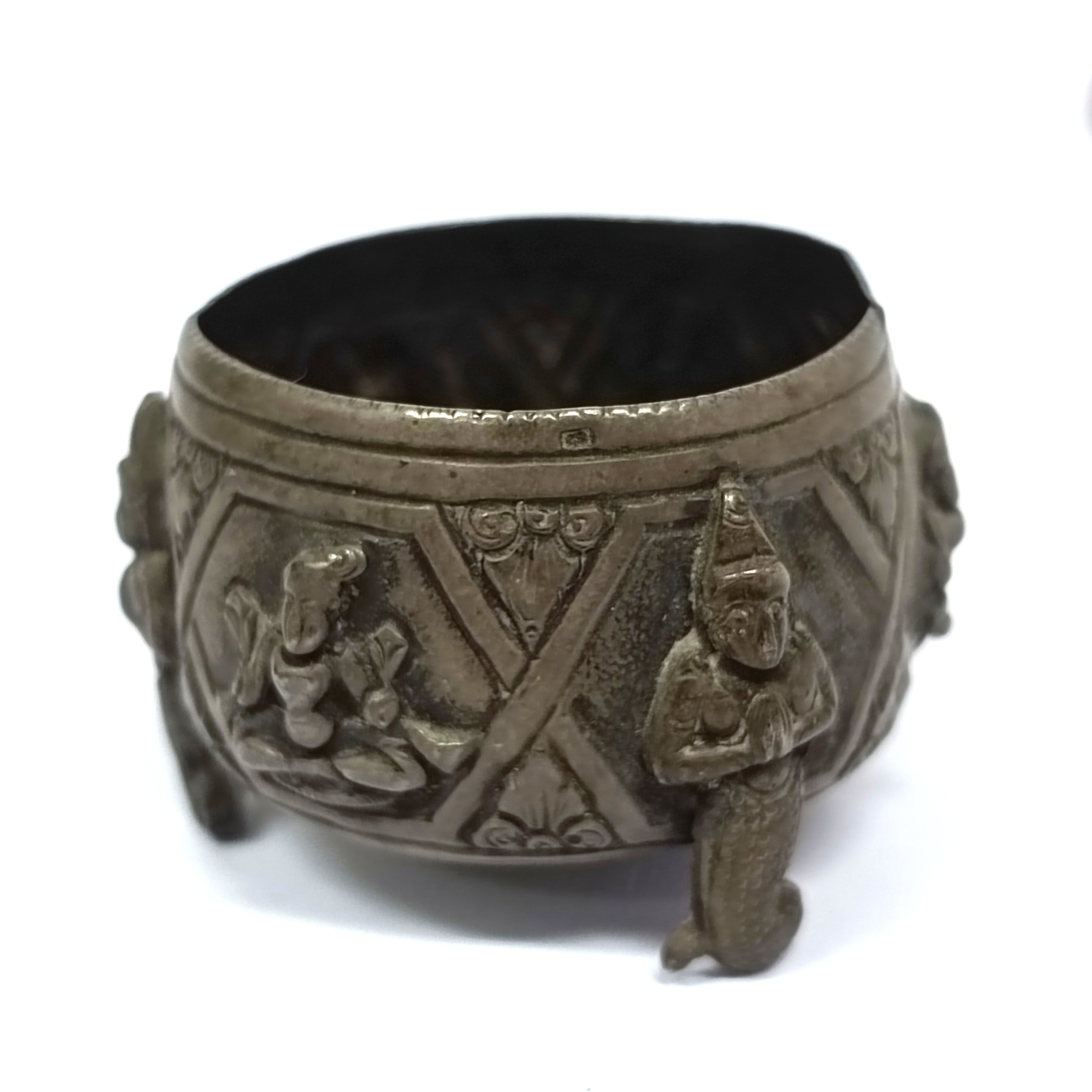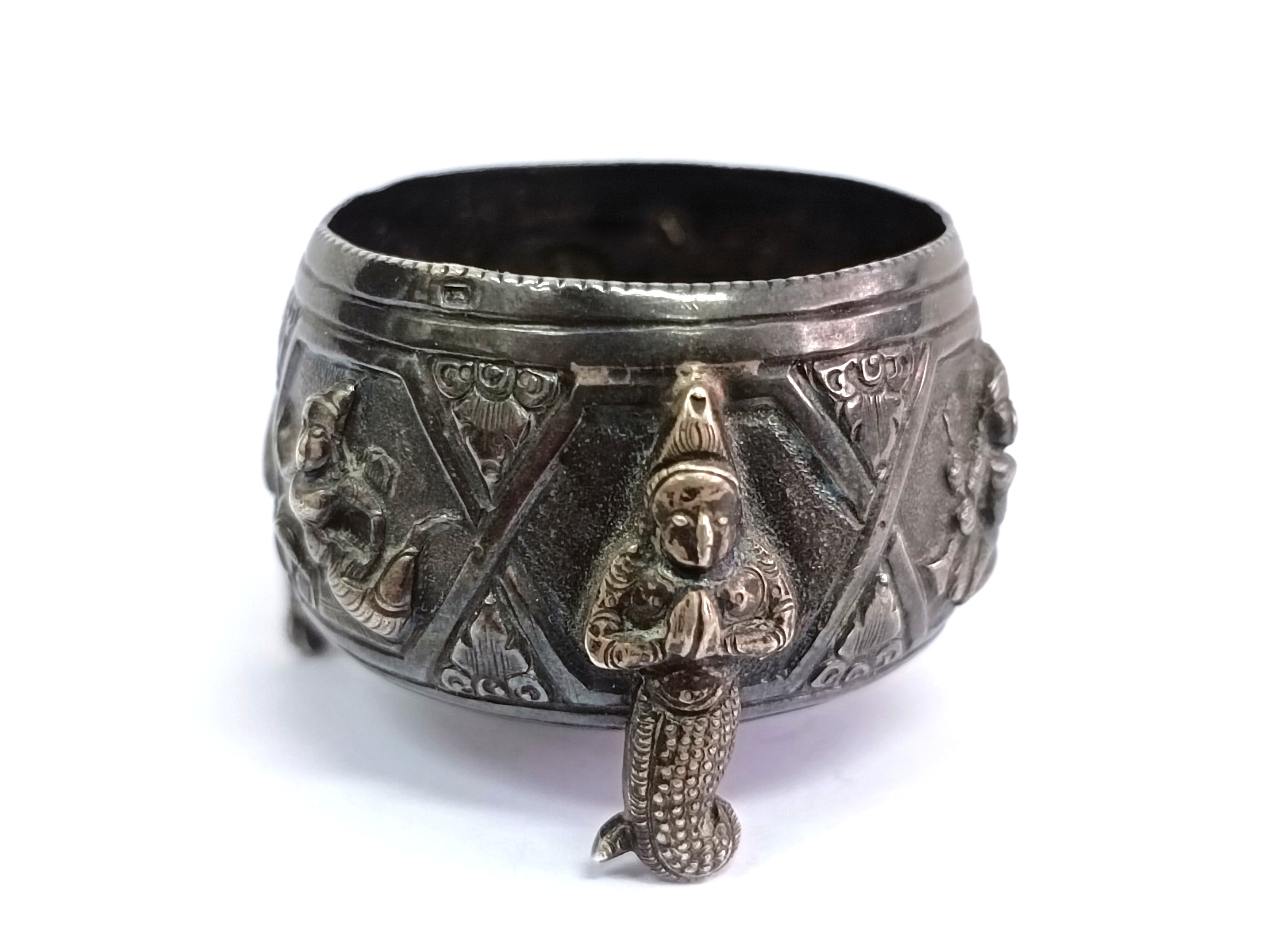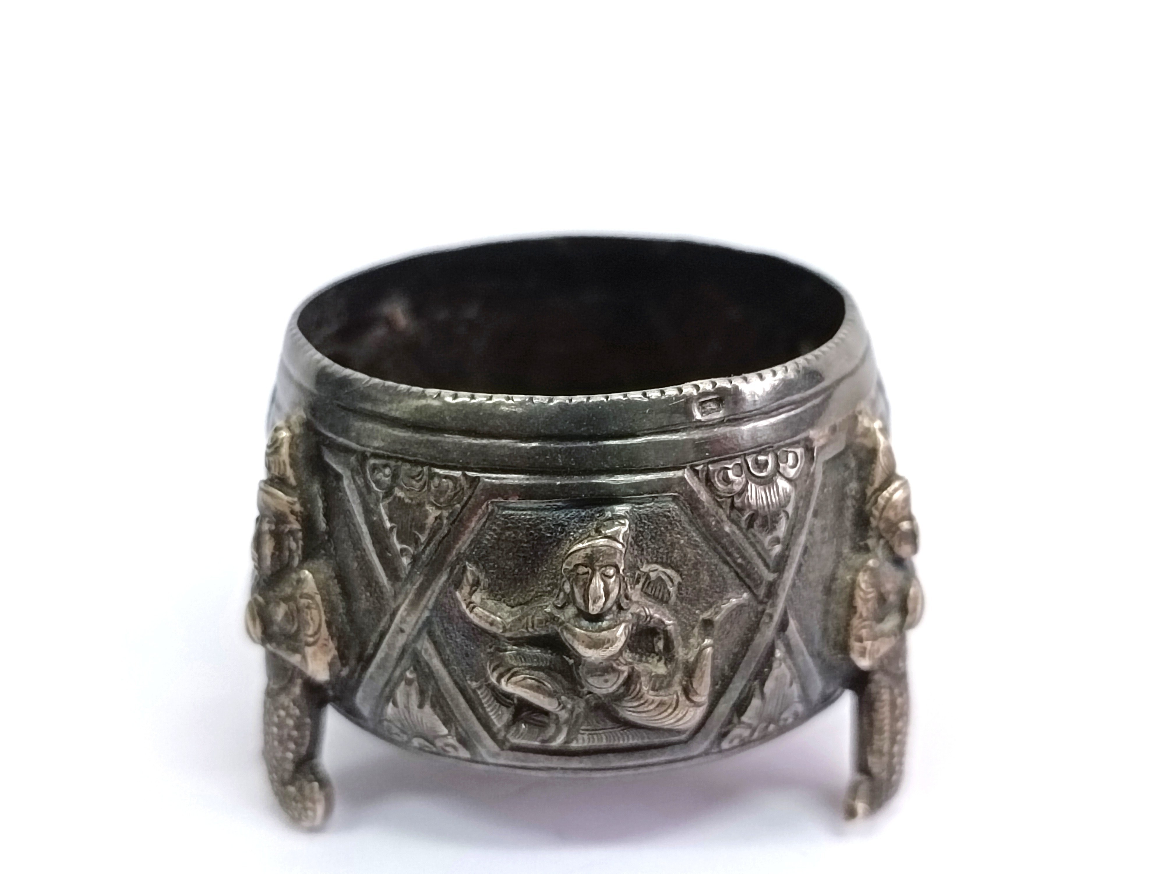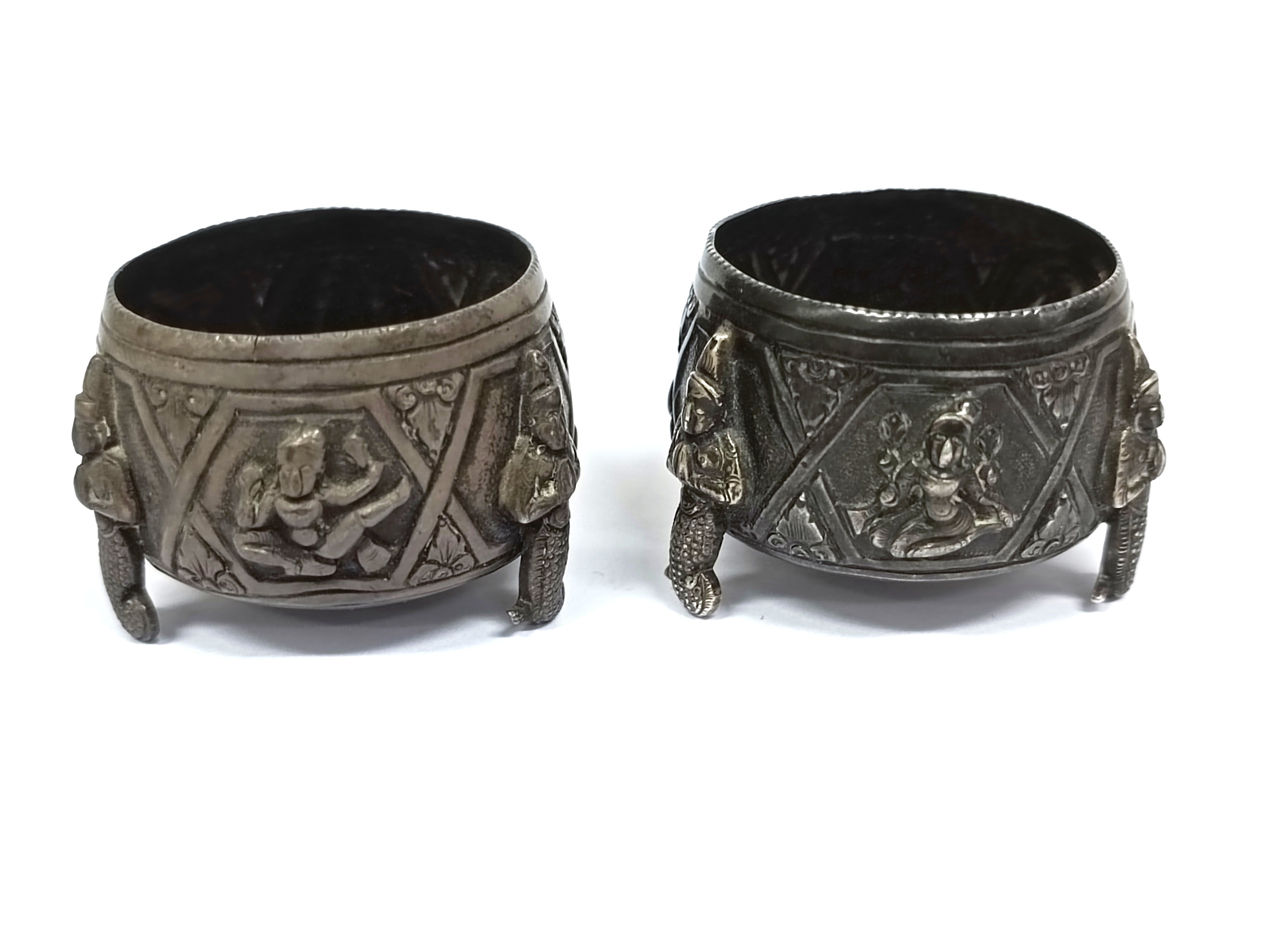 Dwa niewielkie, posrebrzane pojemniczki, być może służące jako solniczka i pieprzniczka. Zdobione postaciami o charakterystycznych formach i pozycjach, nasuwających na myśl sztukę Indii (postacie nieco różnią się na obu pojemniczkach). Punce na brzegach (niezidentyfkowane). Stan dobry/bardzo dobry (niewielkie przetarcia/przebarwienia, brzegi u góry lekko odkształcone/nieregularne w niektórych miejscach).